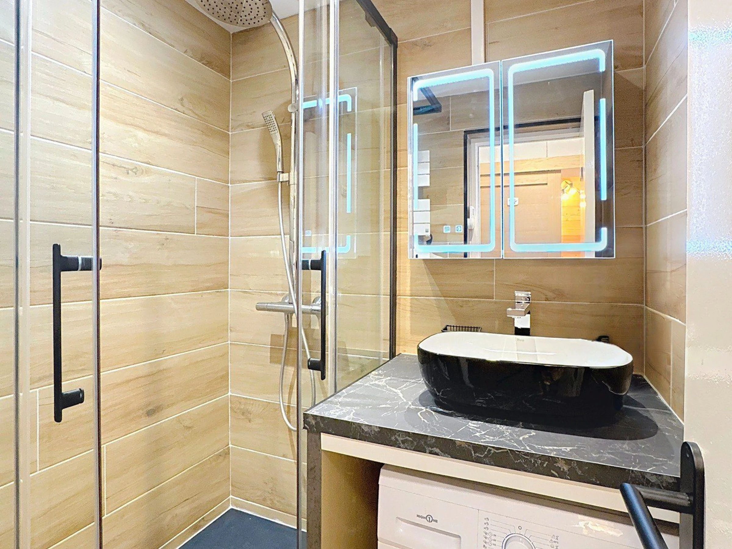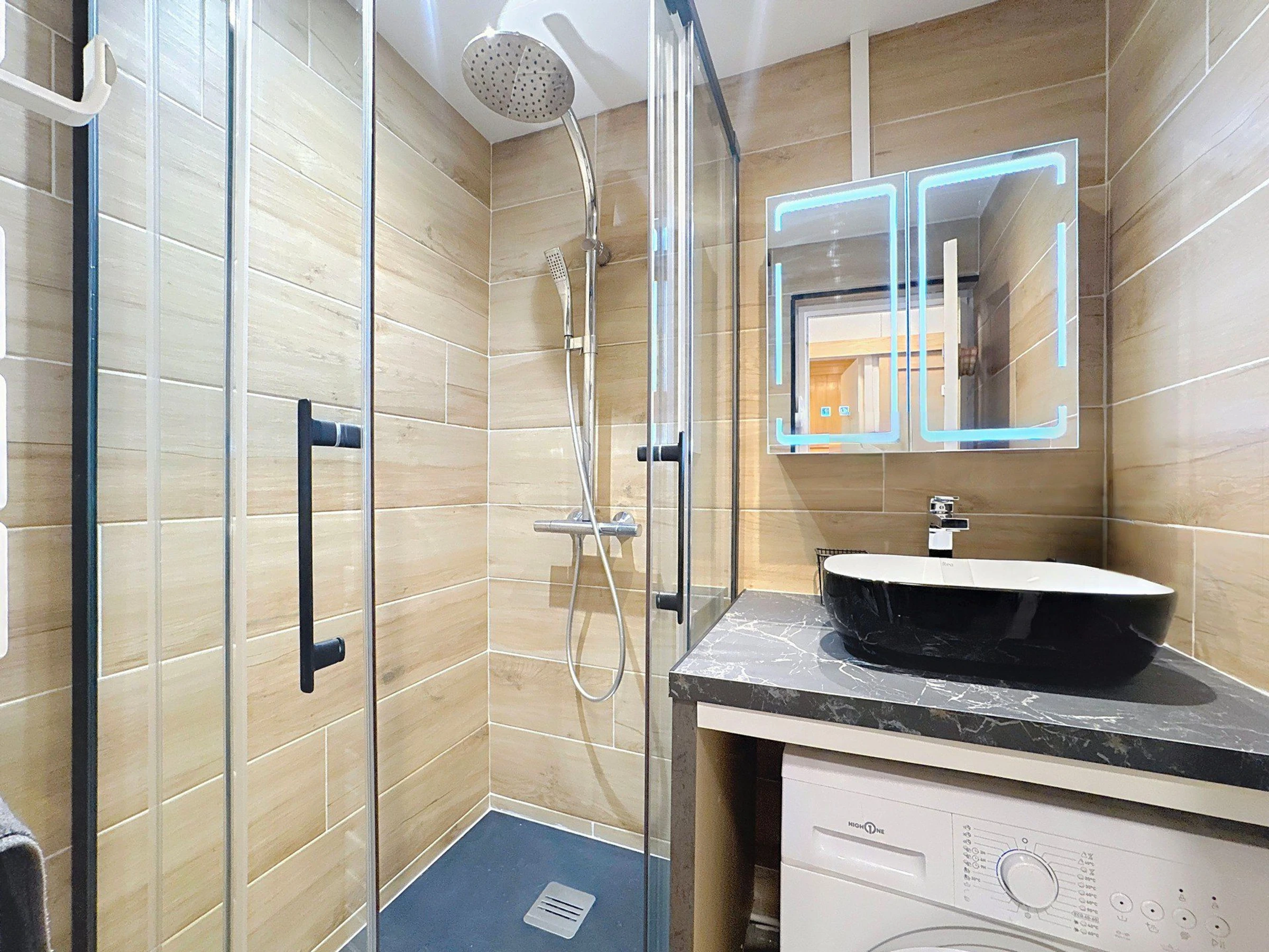A modern shower room with washbasin unit, heated towel rail, and washing machine
