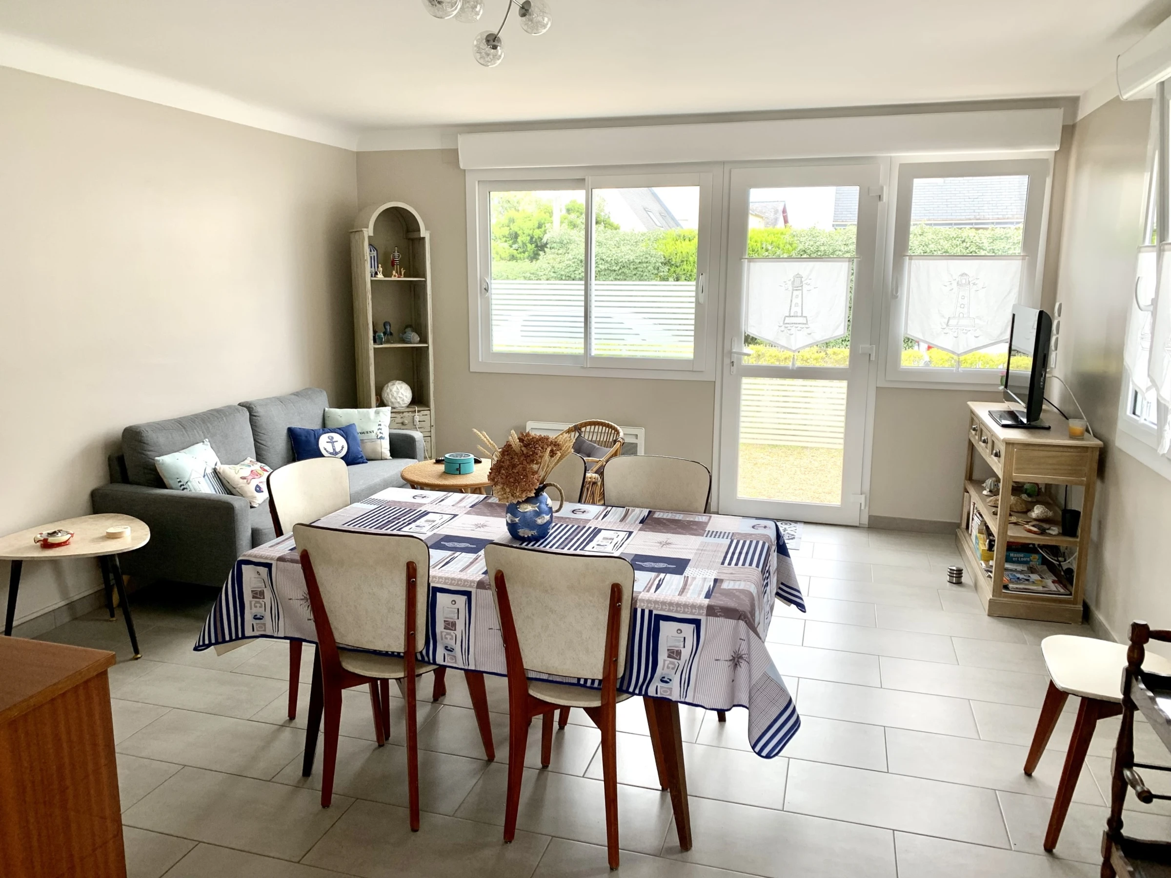 Renovated house near Port Lin beach. It includes: an entrance leading to a kitchenette (4-burner gas hob, oven, dishwasher, sink, vanity unit, refrigerator, microwave, cupboards, filter coffee maker), a bright living room with a sofa and French doors.