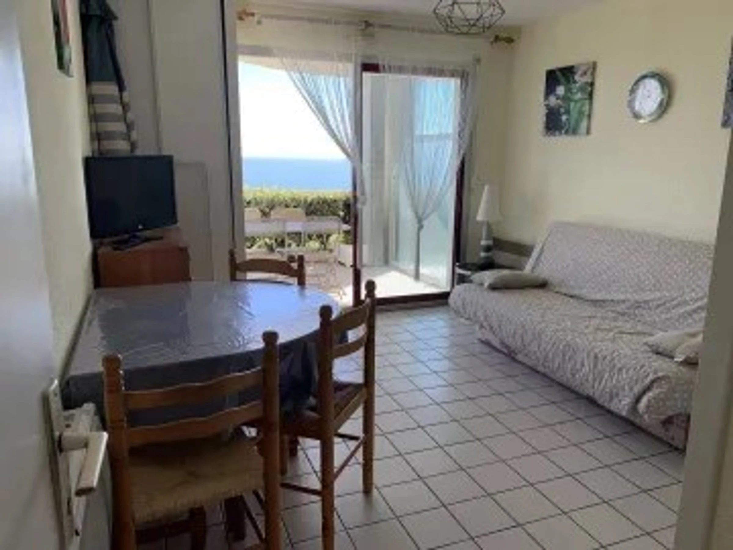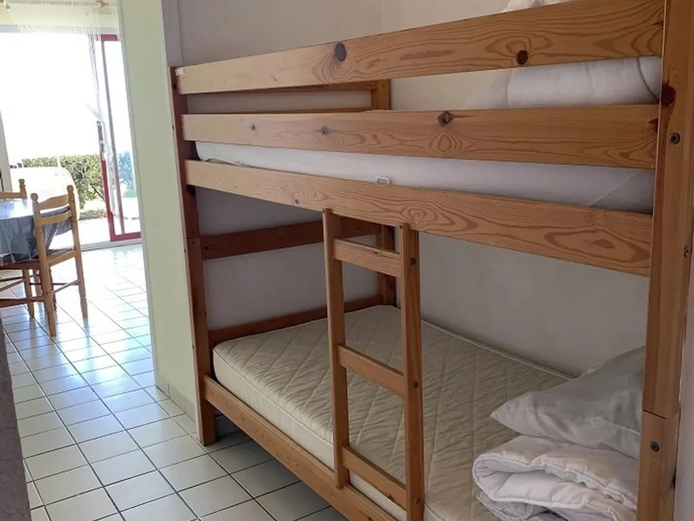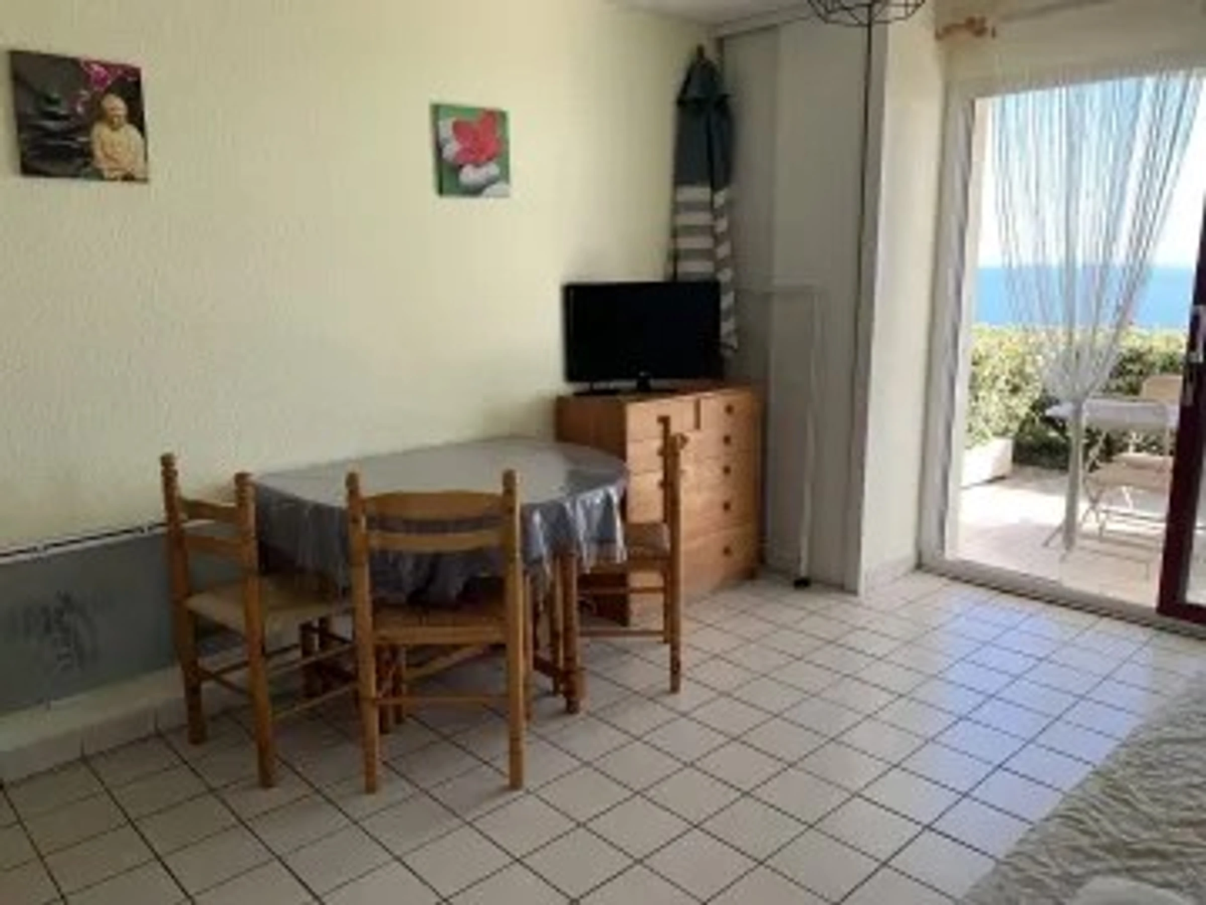 2-room apartment of approximately 35 m² - located on the ground floor of a private residence set back from the road with a south-facing terrace (swimming, walking or cycling, marked trails); Comprising: a living room with dining area and TV lounge (a double sofa bed (140x190 cm)), opening directly onto the south-facing terrace overlooking the sea, with an open-plan fitted kitchen (kettle, filter coffee maker), a hallway leading to a separate bedroom (1 double bed - 140x190 cm) Note: no window in the bedroom. and a sleeping alcove (2 bunk beds (2 x 90cm mattresses)) - 1 shower room with WC, PRIVATE GARAGE - BARBECUES PROHIBITED - PETS ALLOWED