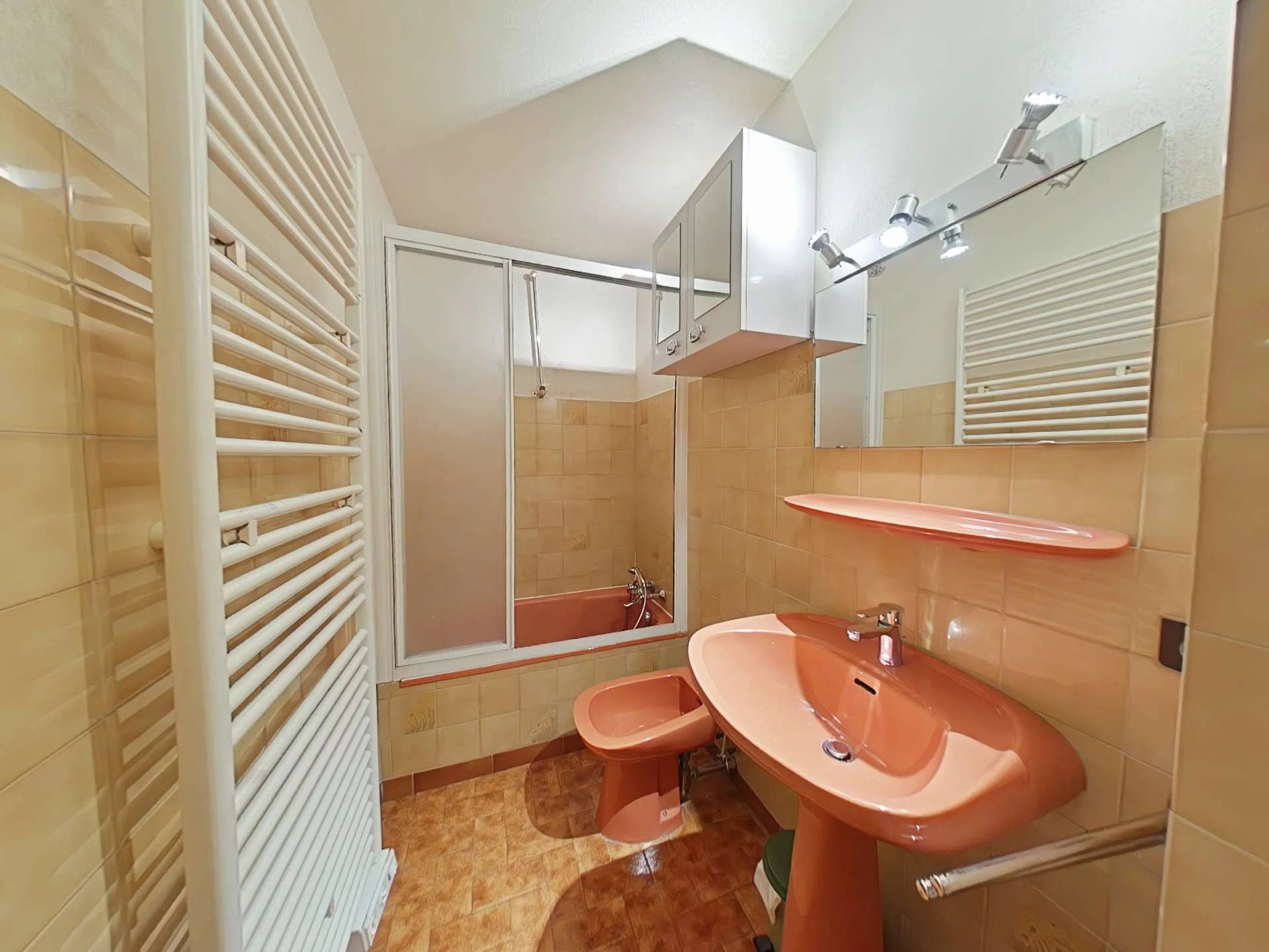 This vacation apartment, on the 1st floor with elevator, includes a living room with a double sofa bed, dining area, and television, a kitchenette, a bedroom with a double bed, a sleeping alcove with two bunk beds, a bathroom, and a separate toilet.