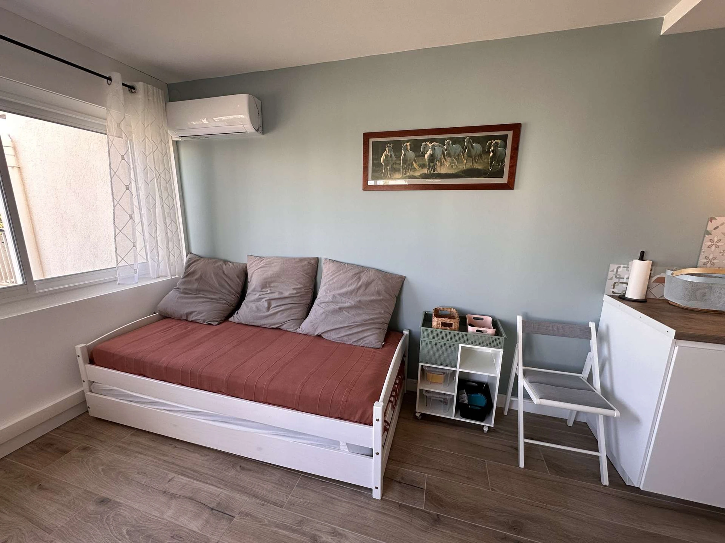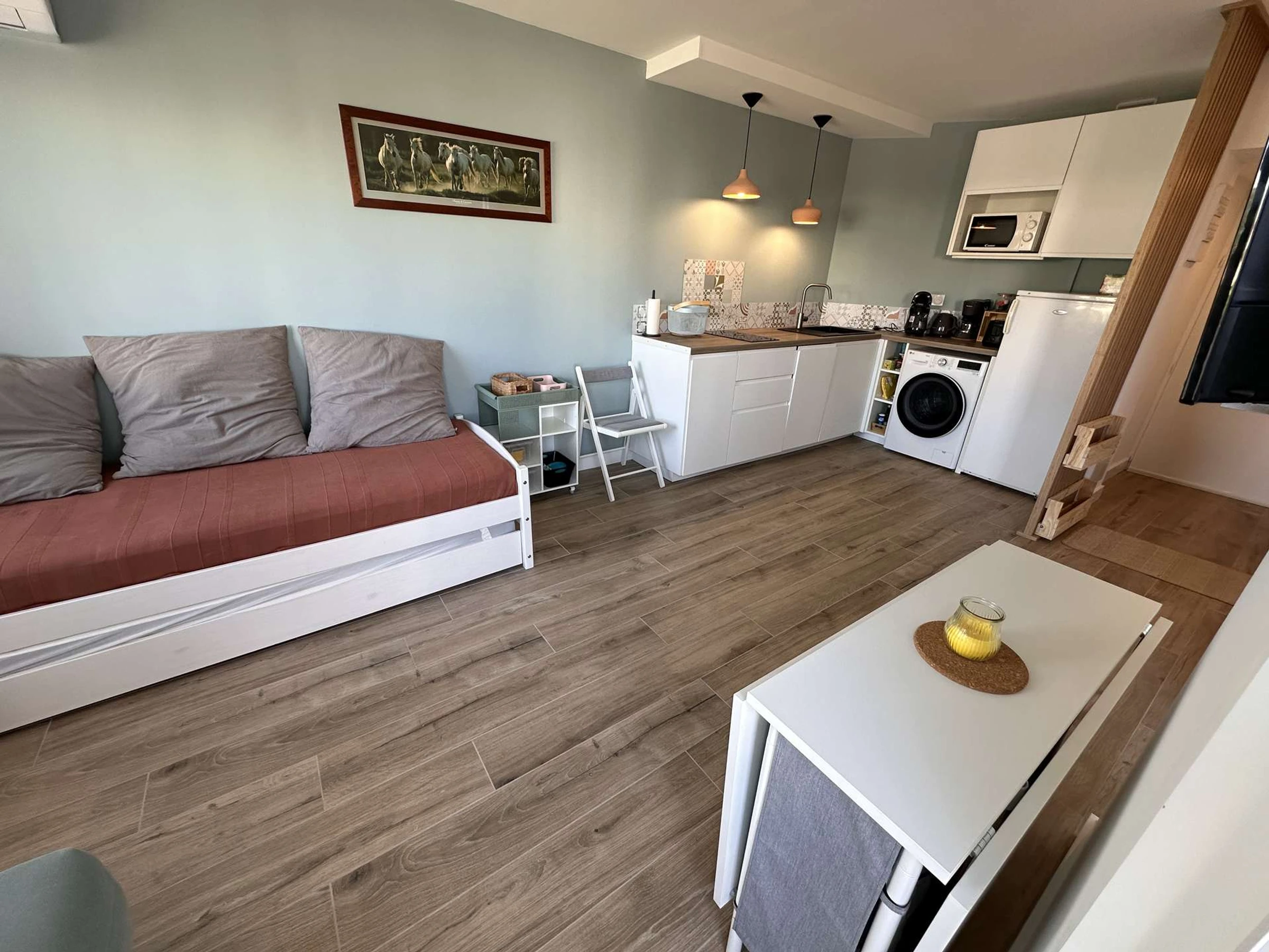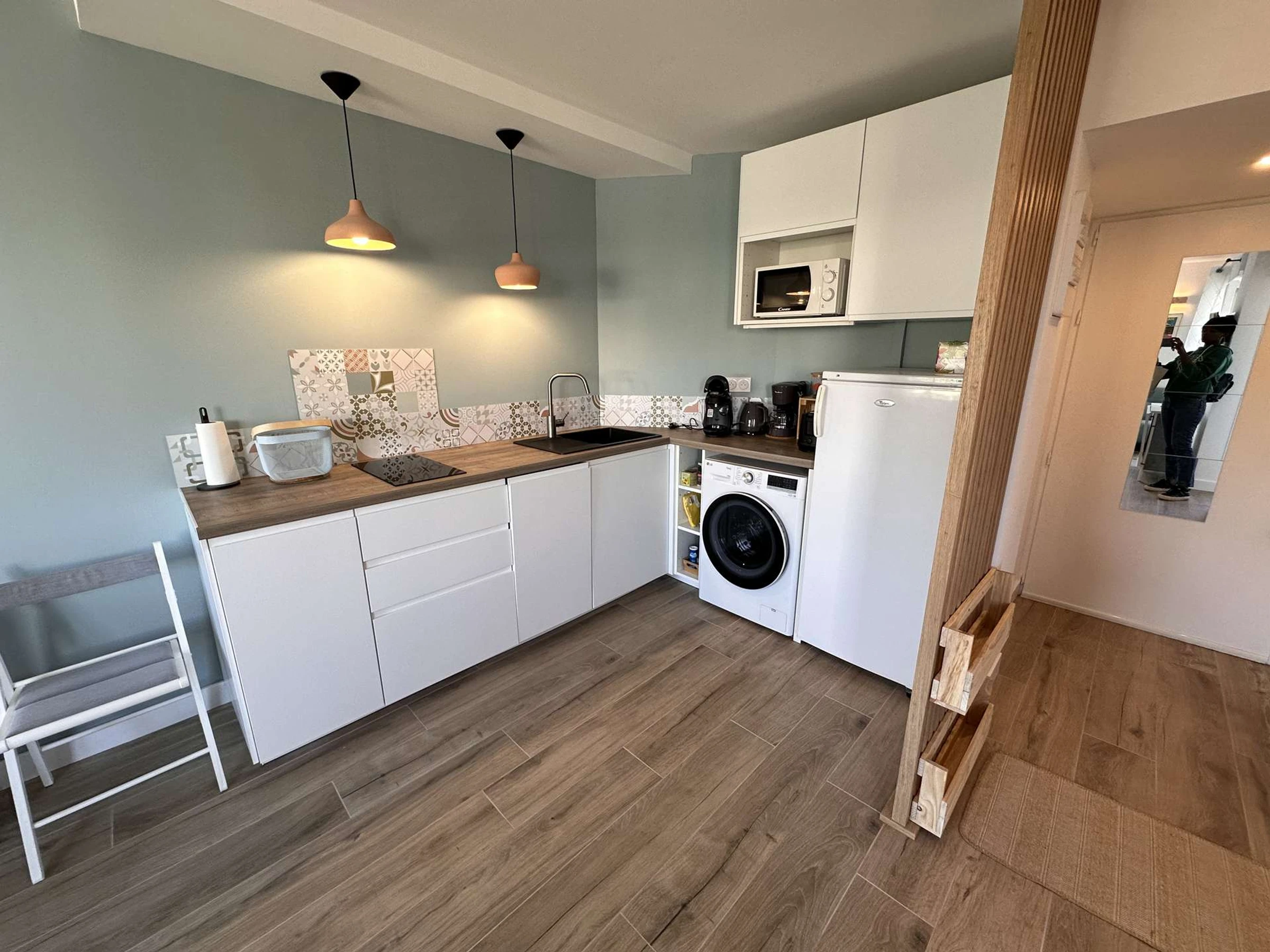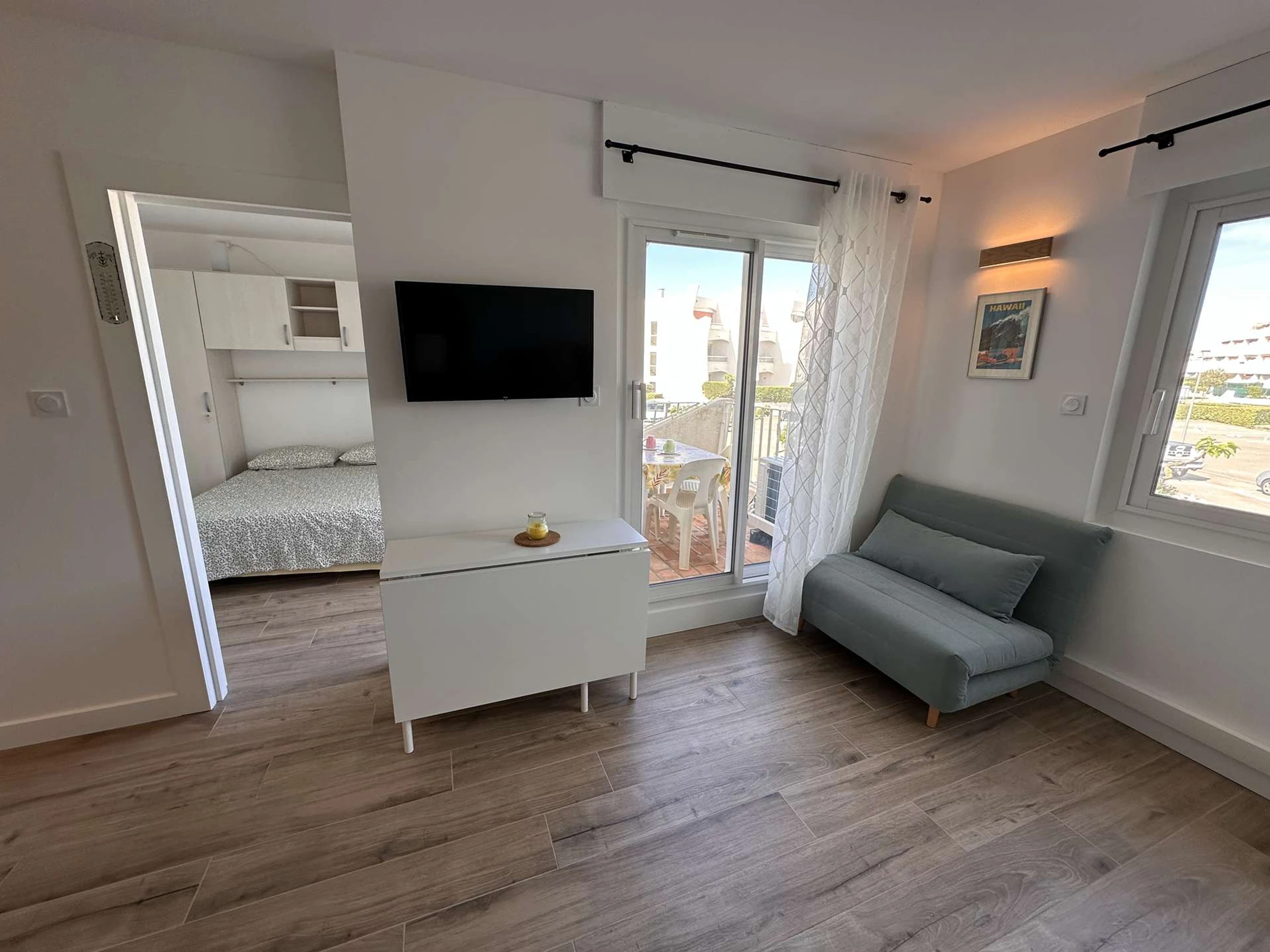 Beautiful 33 m² 2-room apartment located on the 1st floor, completely renovated. It comprises: A pleasant living room with a fully equipped open kitchen: induction hob, large refrigerator with freezer compartment, microwave, dishwasher, electric coffee maker, toaster, kettle, dishes, and kitchen utensils. A lounge area with a flat-screen TV and a pull-out sofa bed (sleeps 2). A separate bedroom with a 140 cm double bed and a storage closet.