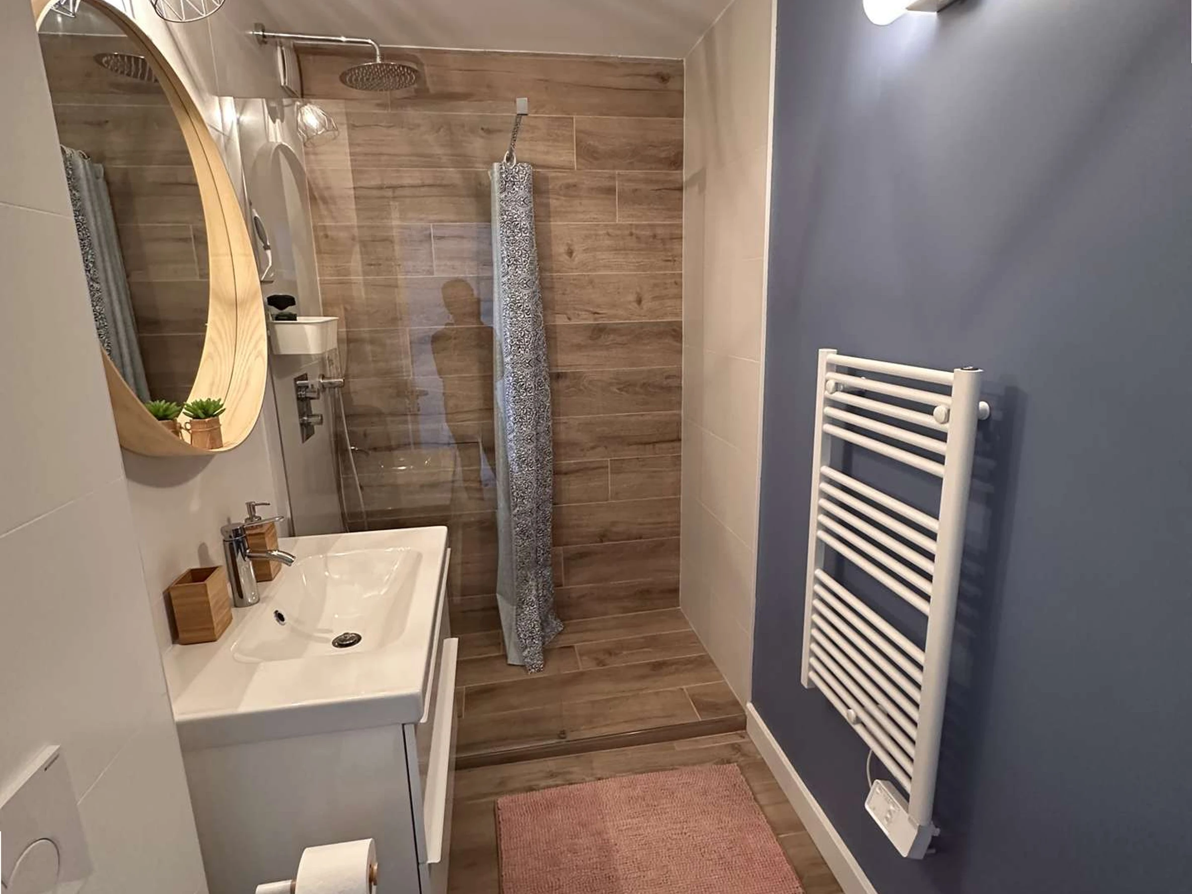 A lovely modern bathroom with shower and toilet. A terrace of approximately 7 m², furnished with garden furniture and an awning.
