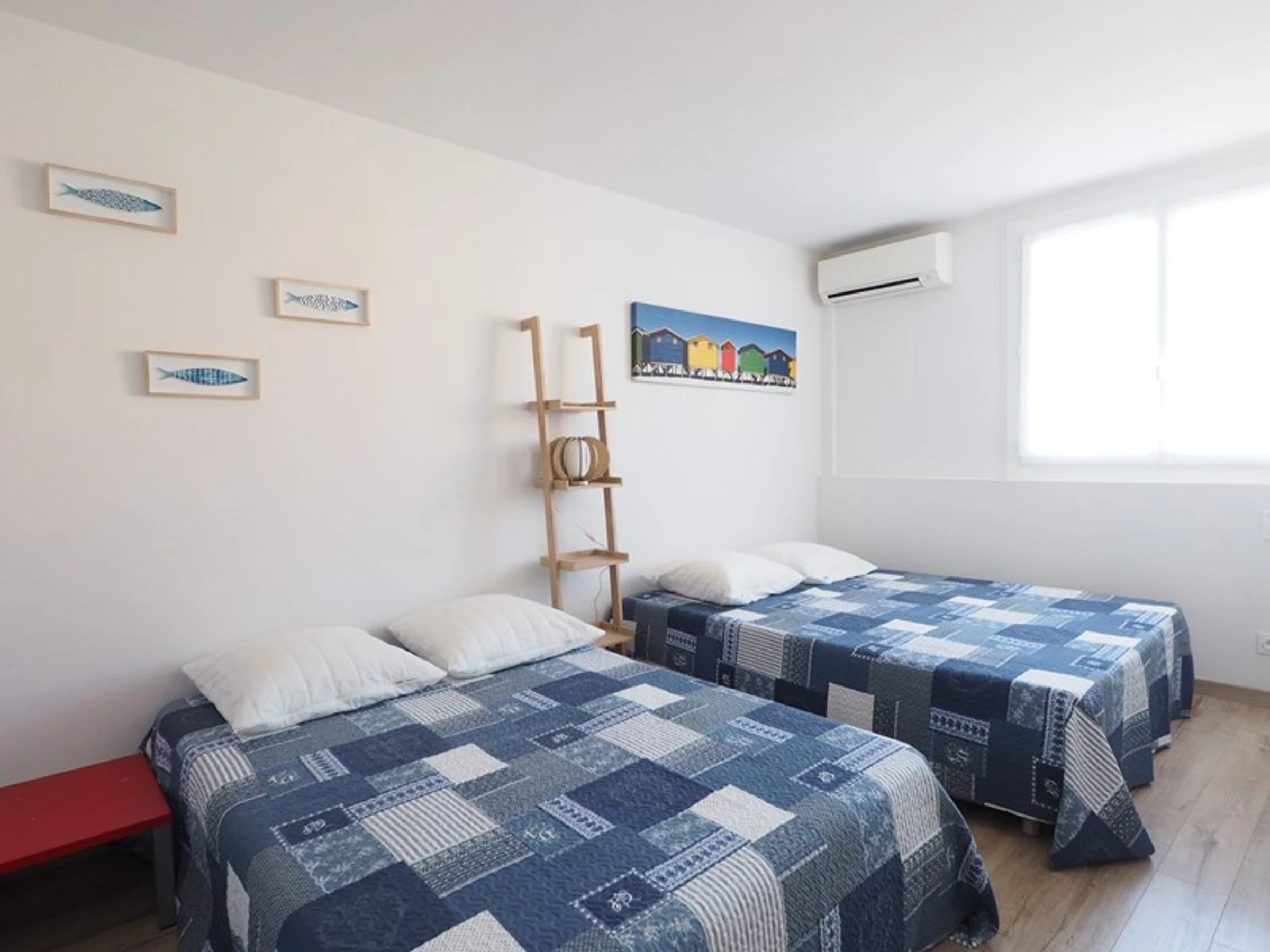 The apartment has a first bedroom with a 160 cm bed, a second bedroom with two double beds (140 cm and 160 cm), closets, and air conditioning in each room.