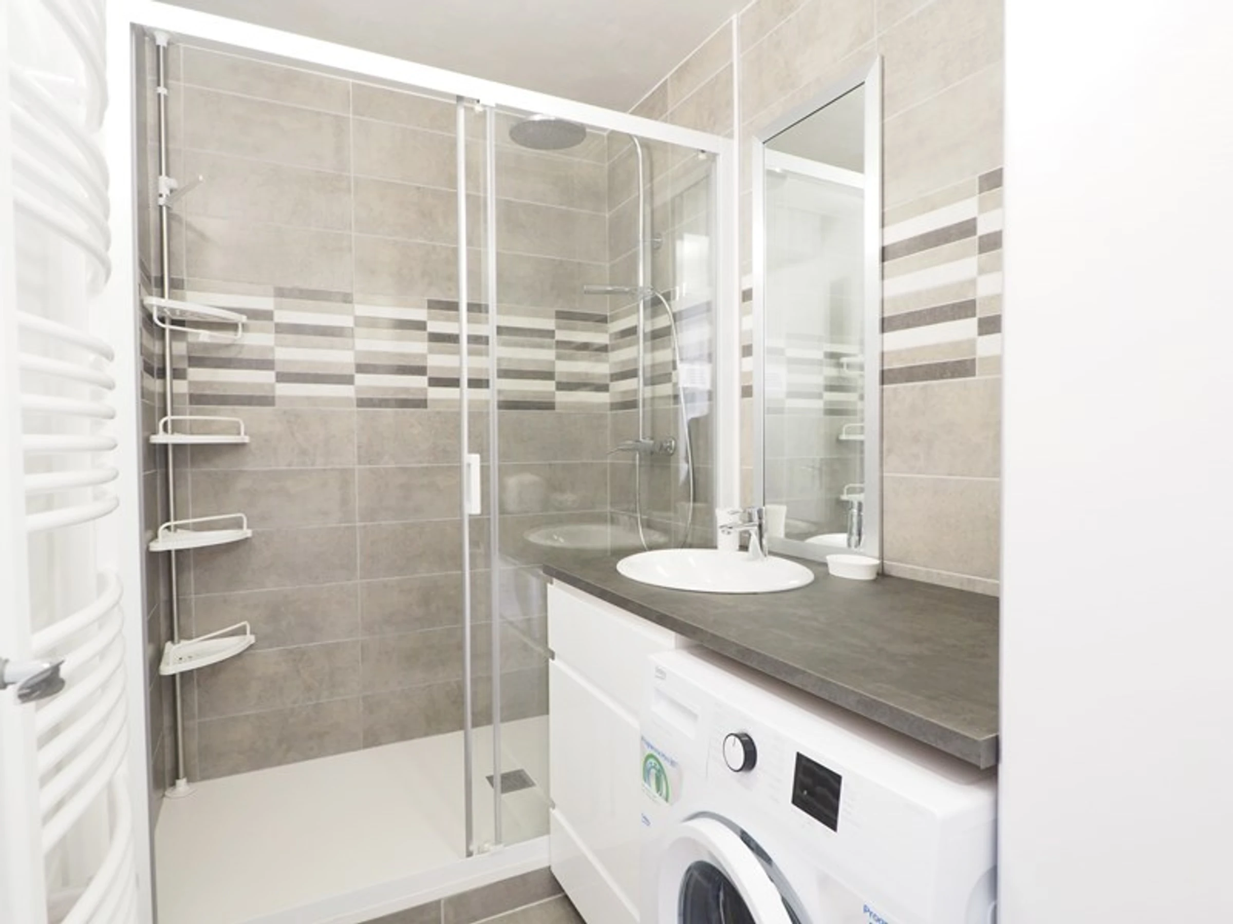 There is also a bathroom with a walk-in shower, washing machine, and separate toilet.