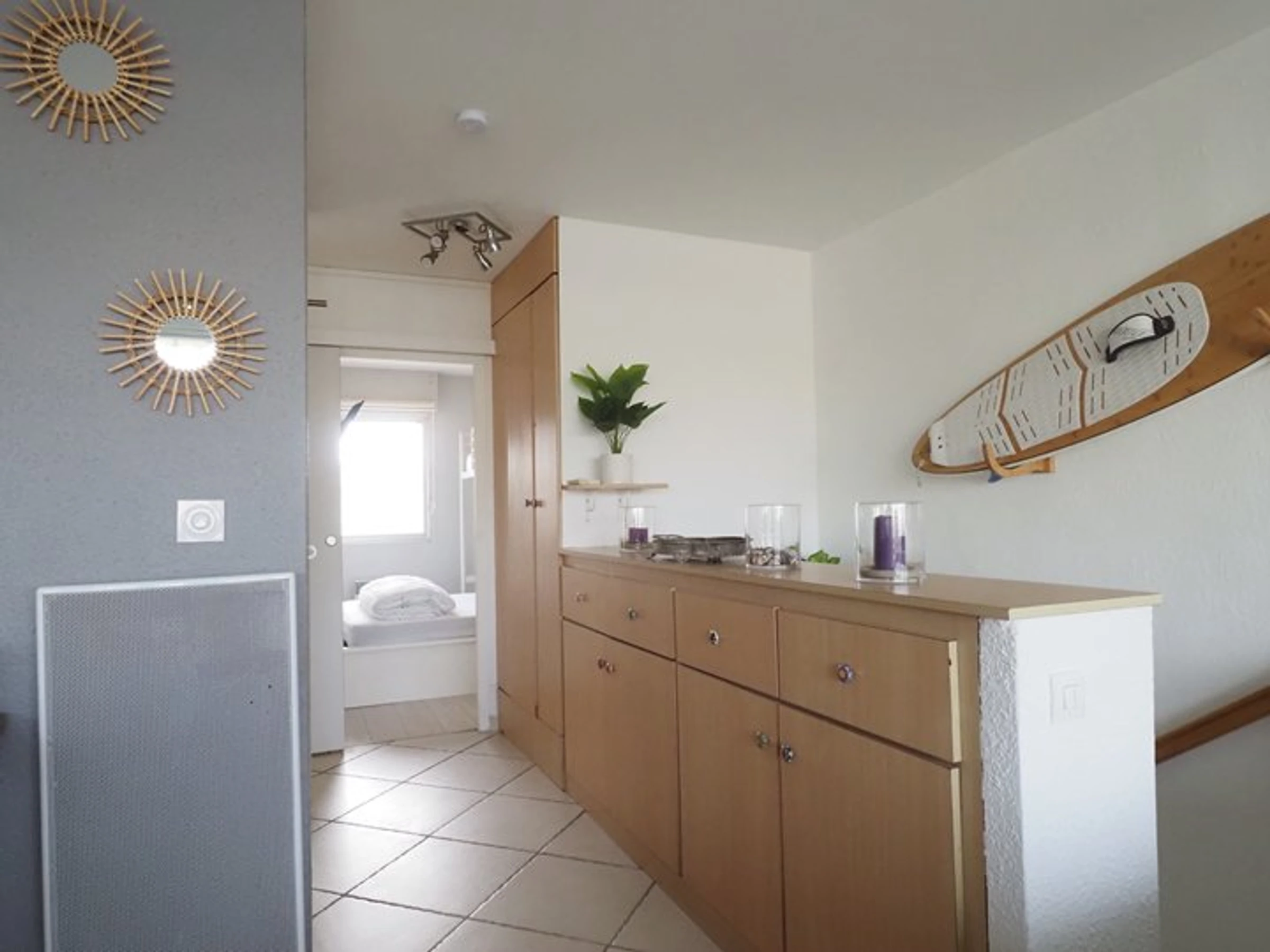 The first bedroom, very bright, has a double bed (140cm) and a mezzanine bed (90cm), a television, and a wardrobe. The second bedroom has a queen-size bed (160cm), a television, and a wardrobe. The spacious terrace, with its unobstructed view, will delight you whether you're enjoying breakfast, a meal using the provided griddle, or simply relaxing after a day at the beach.