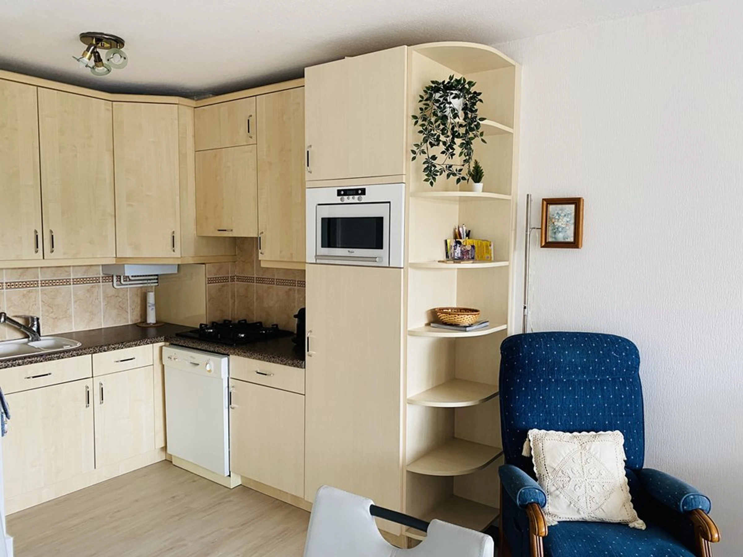 The spacious living and dining area features a beautiful, fully equipped open-plan kitchen, opening onto the living room with a 160 cm sofa bed.