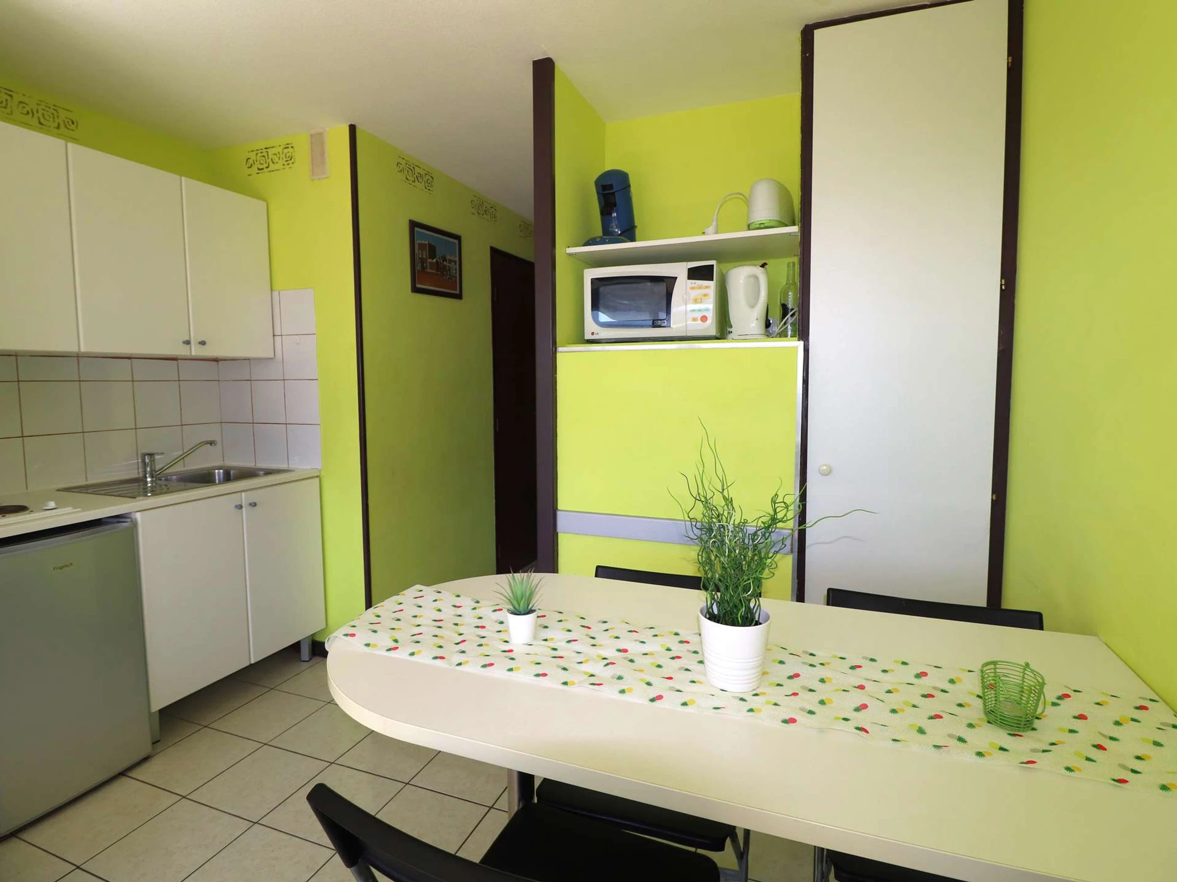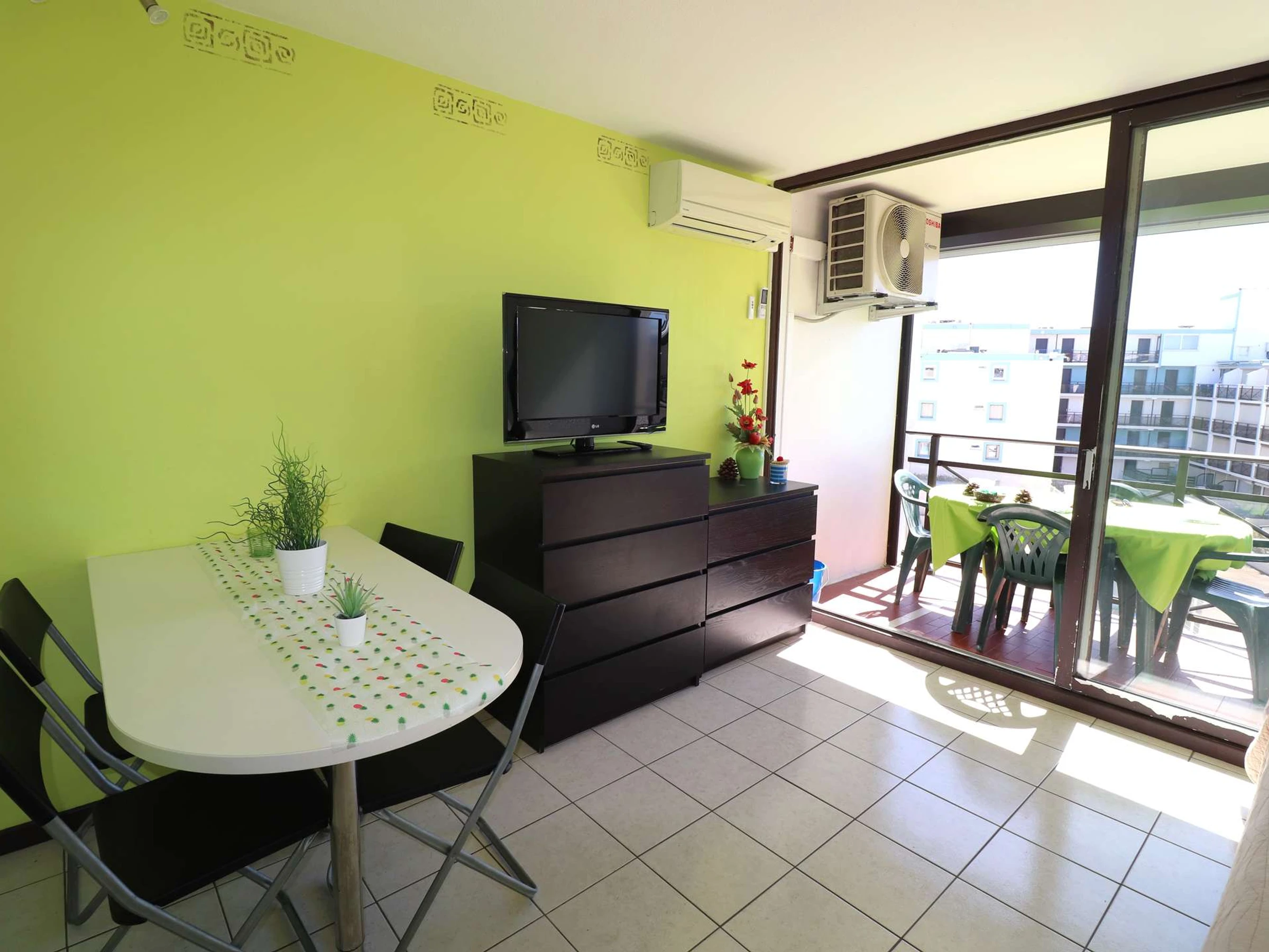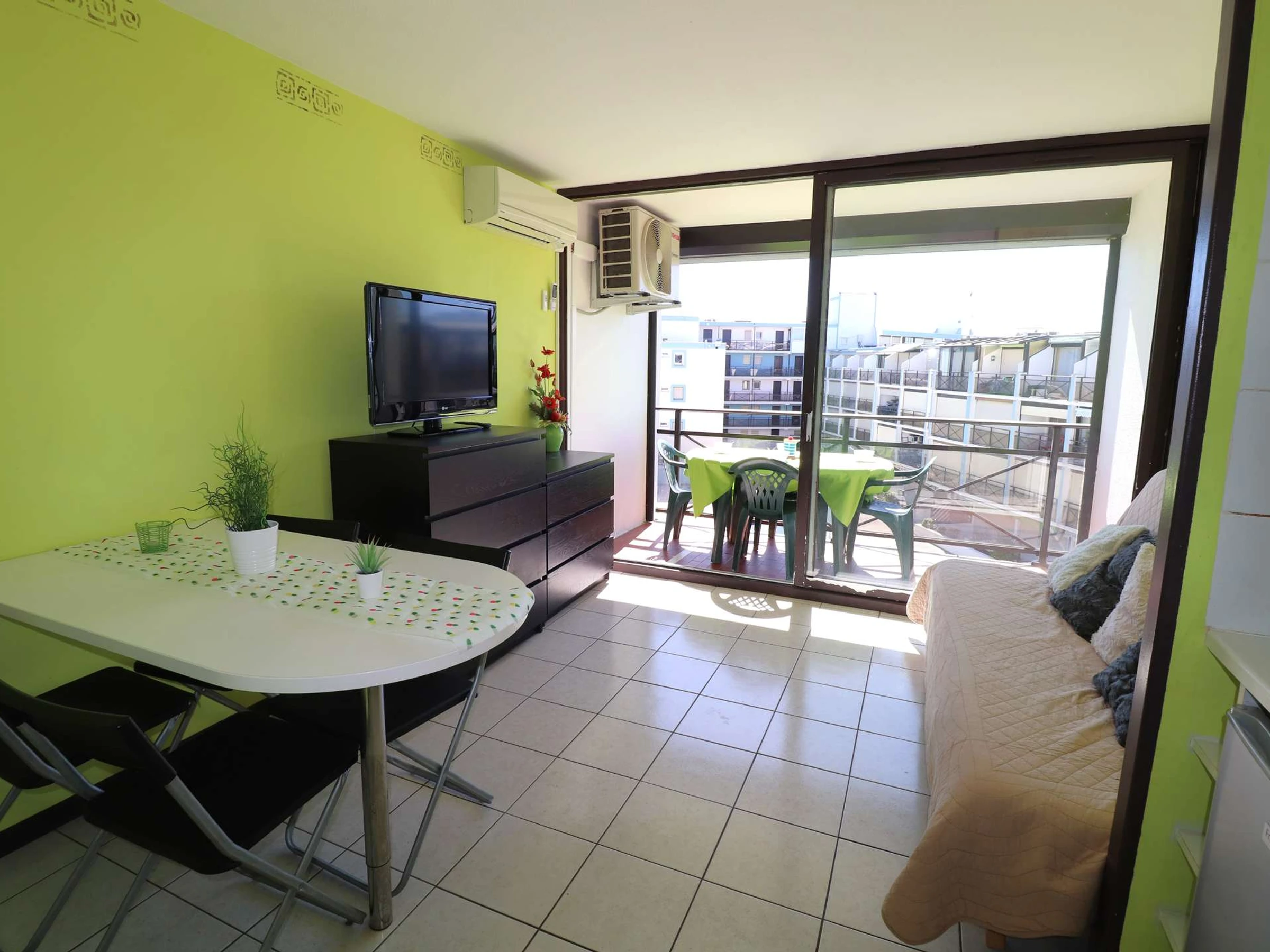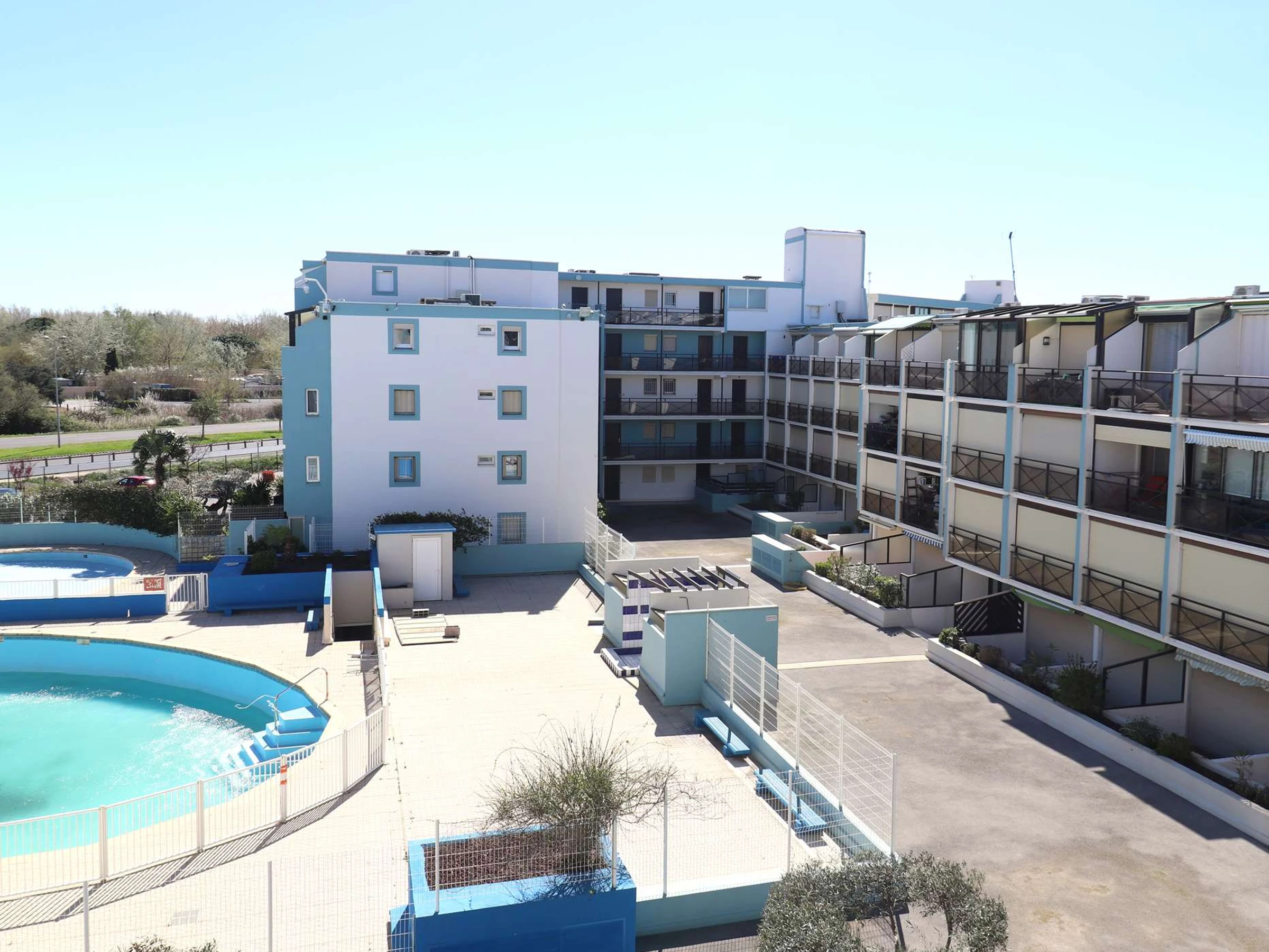 LAGON BLEU residence - Swimming pool, air conditioning, beach 450m away, shopping center 100m away, pleasant studio/cabin on the 3rd floor with elevator. It consists of a double cabin with bunk beds and mezzanine beds and sofa bed, bathroom with shower, sink, separate toilet, living room with equipped kitchenette, sofa bed, a bay window opens onto a pleasant terrace, beautiful pool view.