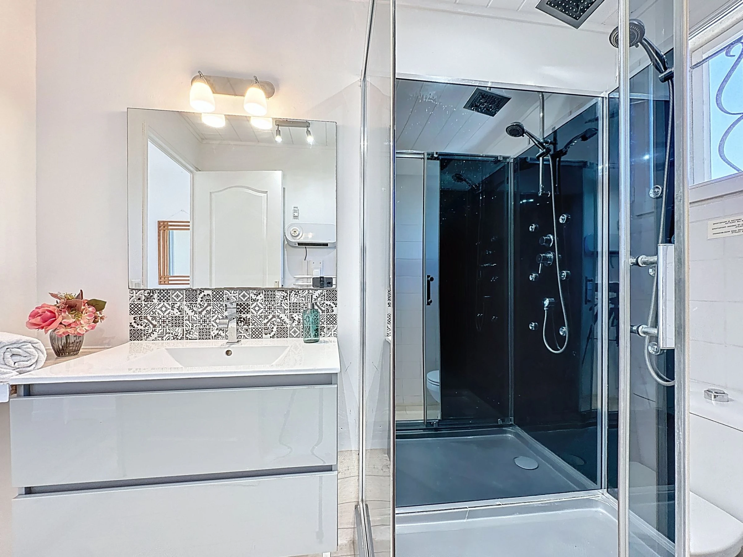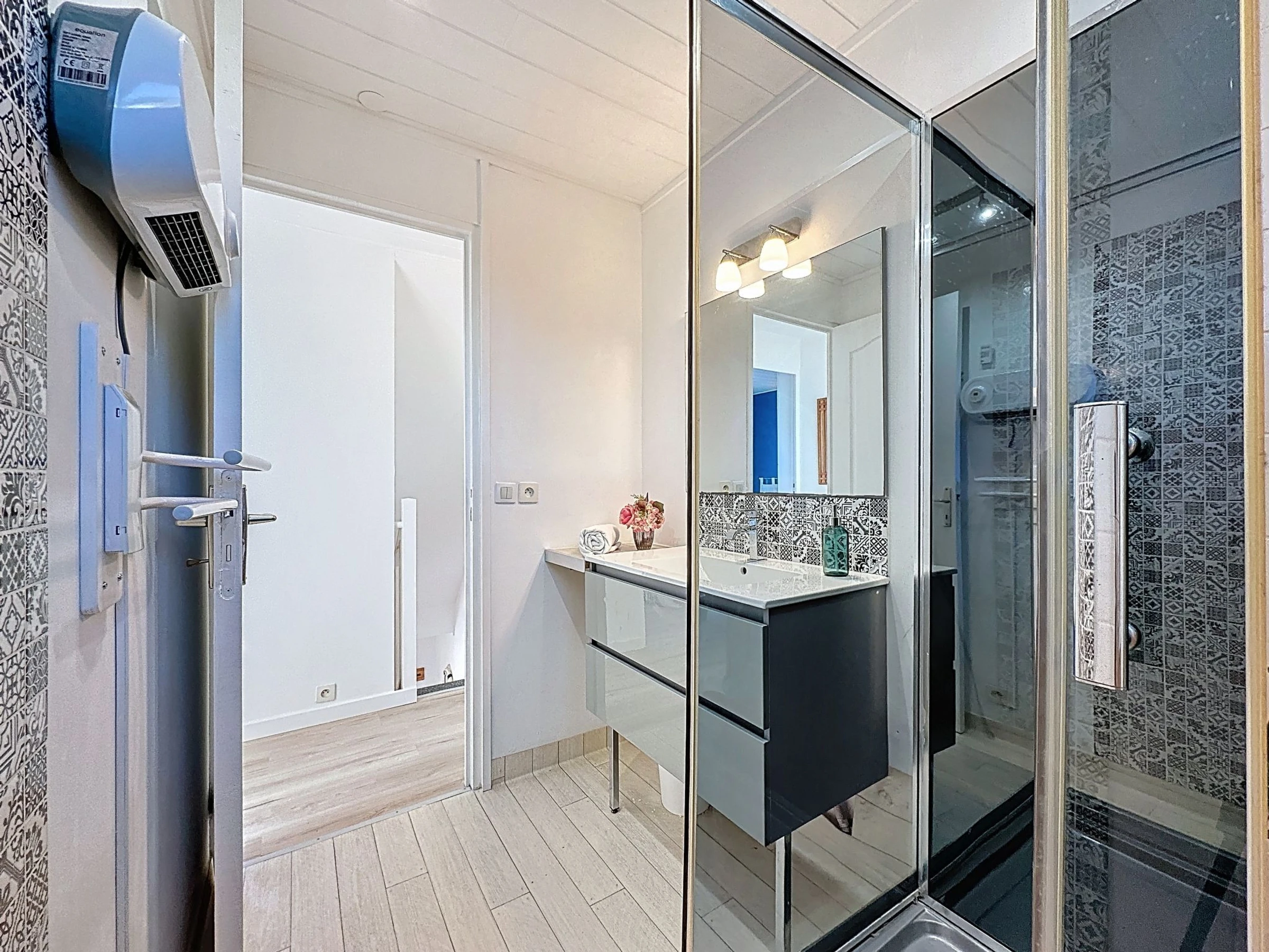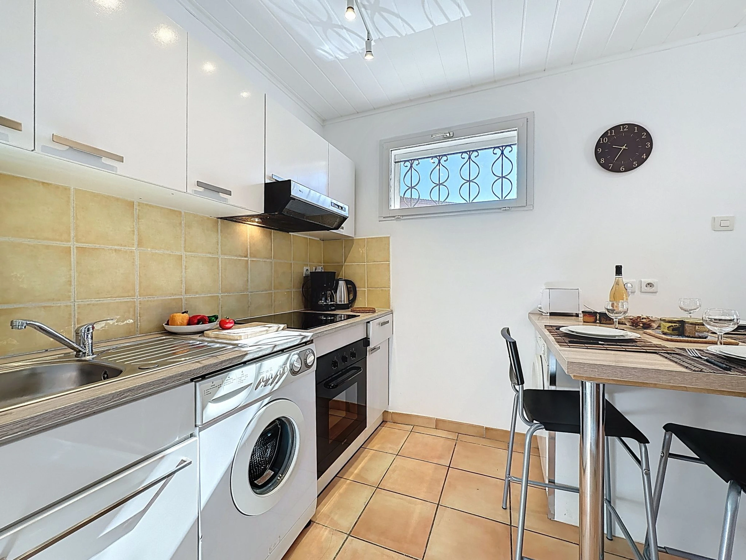 3-room terraced house 44 m2 on 2 levels. Bright, cosy furnishings: dining room with TV (flat screen). Open kitchen (dishwasher, 3 induction hot plates, toaster, kettle, microwave, freezer, electric coffee machine). Upper floor: 1 room with 1 french bed (140 cm, length 190 cm). 1 room with 1 french bed (140 cm, length 190 cm). Shower/WC. Electric heating, air-conditioning, floor heating. Terrace 14 m2, south facing position, lawn 35 m2. Terrace furniture. Facilities: washing machine, dryer. Internet (WiFi, free). Please note: smoke alarm. Offer by a private individual according to  Art. 155, IV of CGI.