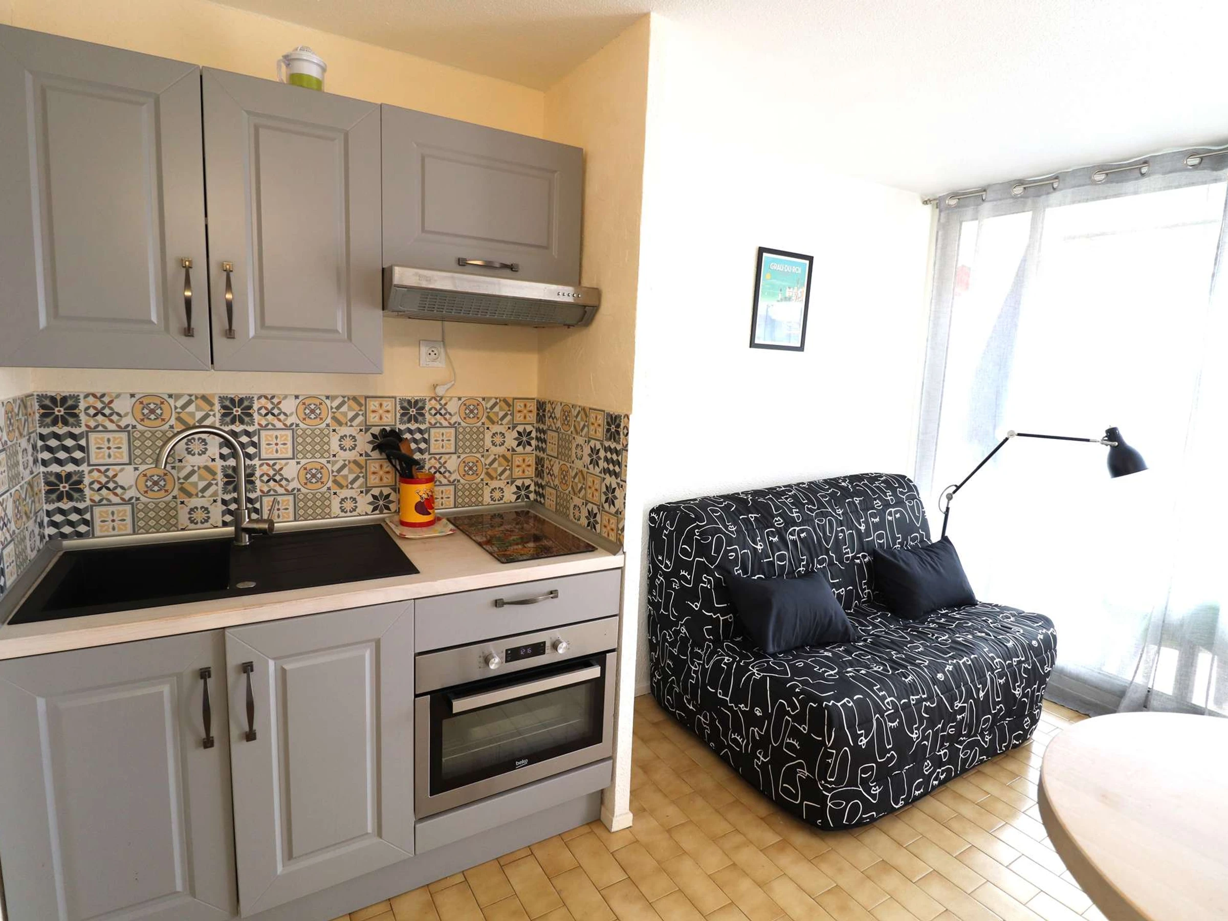 This Studio - Cabin type apartment equipped with air conditioning includes a bathroom, separate toilet, a cabin with bunk beds, a living room with sofa, dining area, an equipped kitchenette.