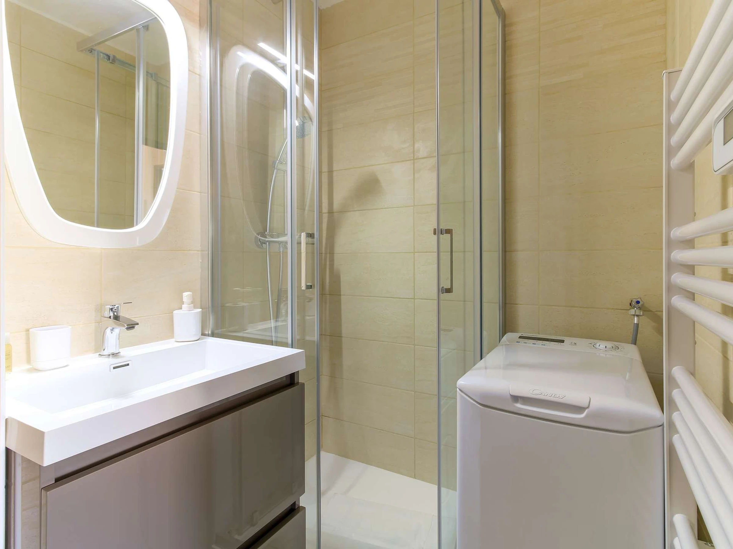 Large and decorated tastefully, this first floor apartment proposes a bright and spacious living room with an equipped kitchen corner and a wide living room with a convertible sofa. It extends onto a generous loggia with a bay window which can be fully opened as you wish. Besides the sofa, it also has a bedroom with a double bed and many storage spaces. The bathroom has a shower and toilet.