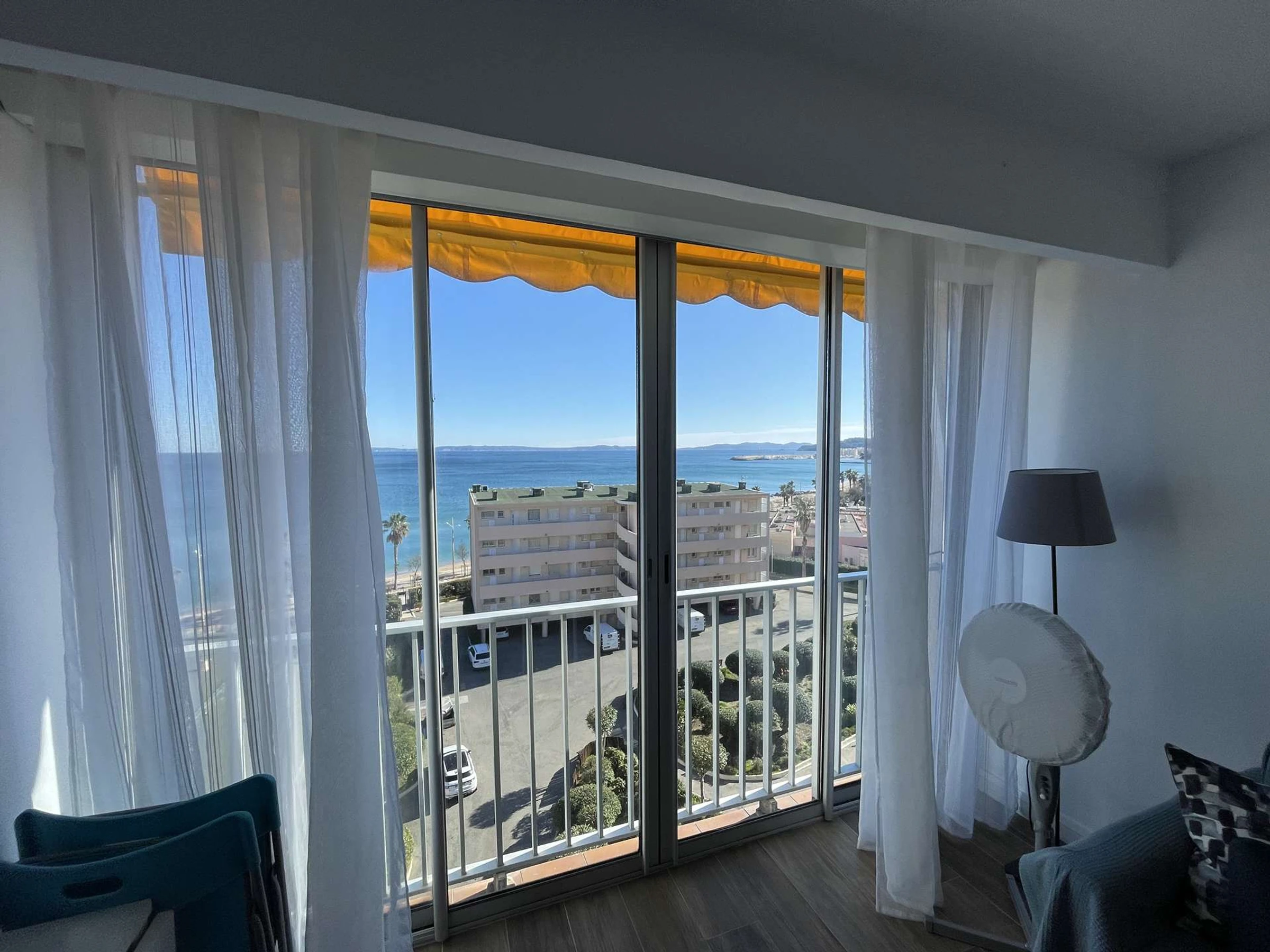 This studio features a bright living room with a sliding glass door offering stunning sea views. It also includes a folding table for 4, a RAPIDO sofa (140 cm), a TV stand, and a television. For your comfort, you'll find a ceiling fan, a floor lamp, curtains, and board games for the children.