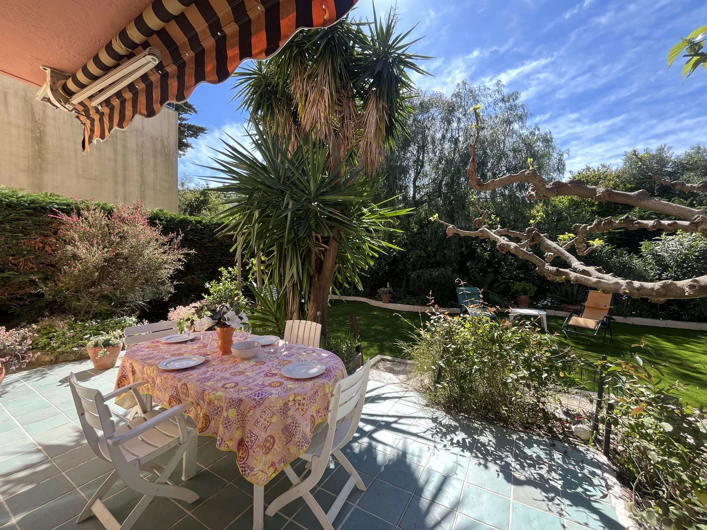 Outside, enjoy a west-facing terrace overlooking the garden, where you'll find a garden table and chairs, as well as two sun loungers and an awning. The approximately 200 m² garden offers an ideal space to relax and enjoy nature.