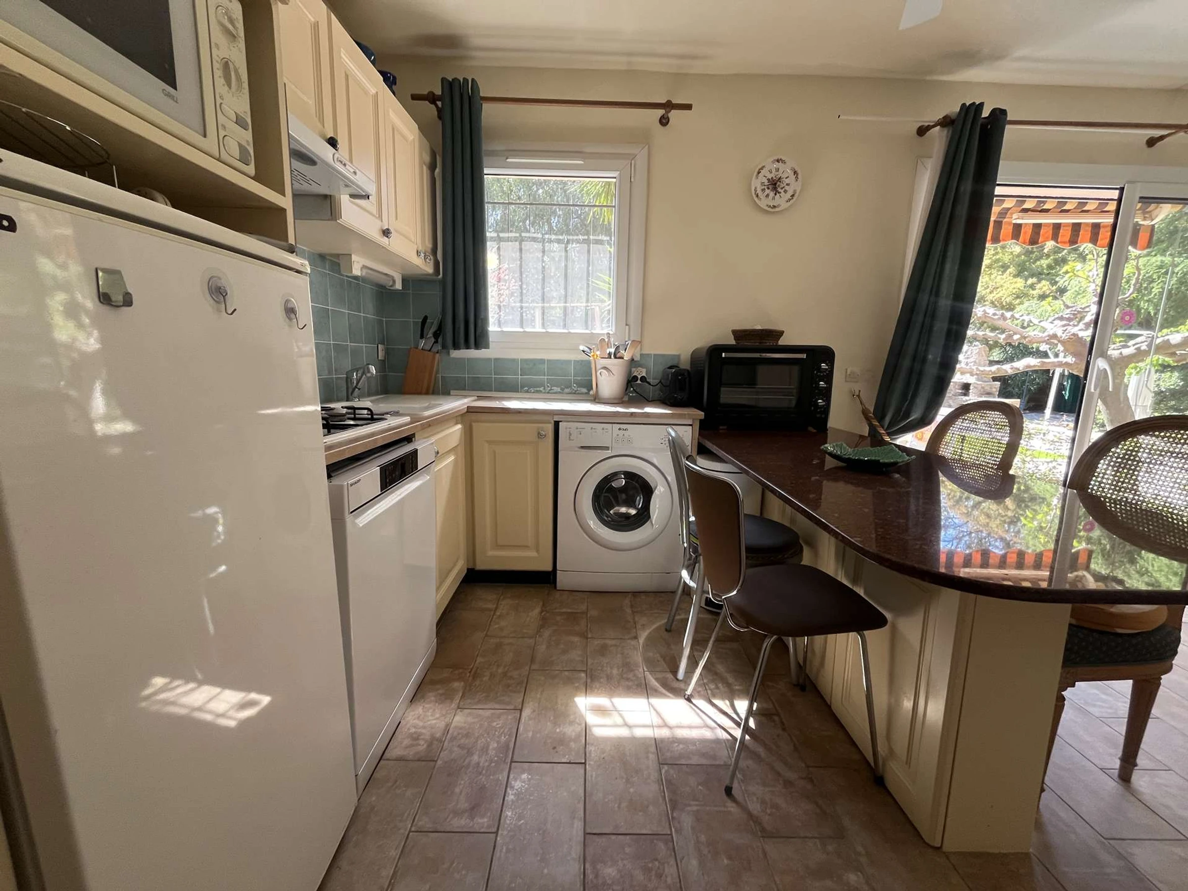 The bright kitchen, with a window, is fully equipped with a sink, storage cupboards, a washing machine, a dishwasher, a 4-burner hob, an extractor fan, an oven, a microwave, and a refrigerator/freezer. A kitchen table with chairs completes this welcoming space.