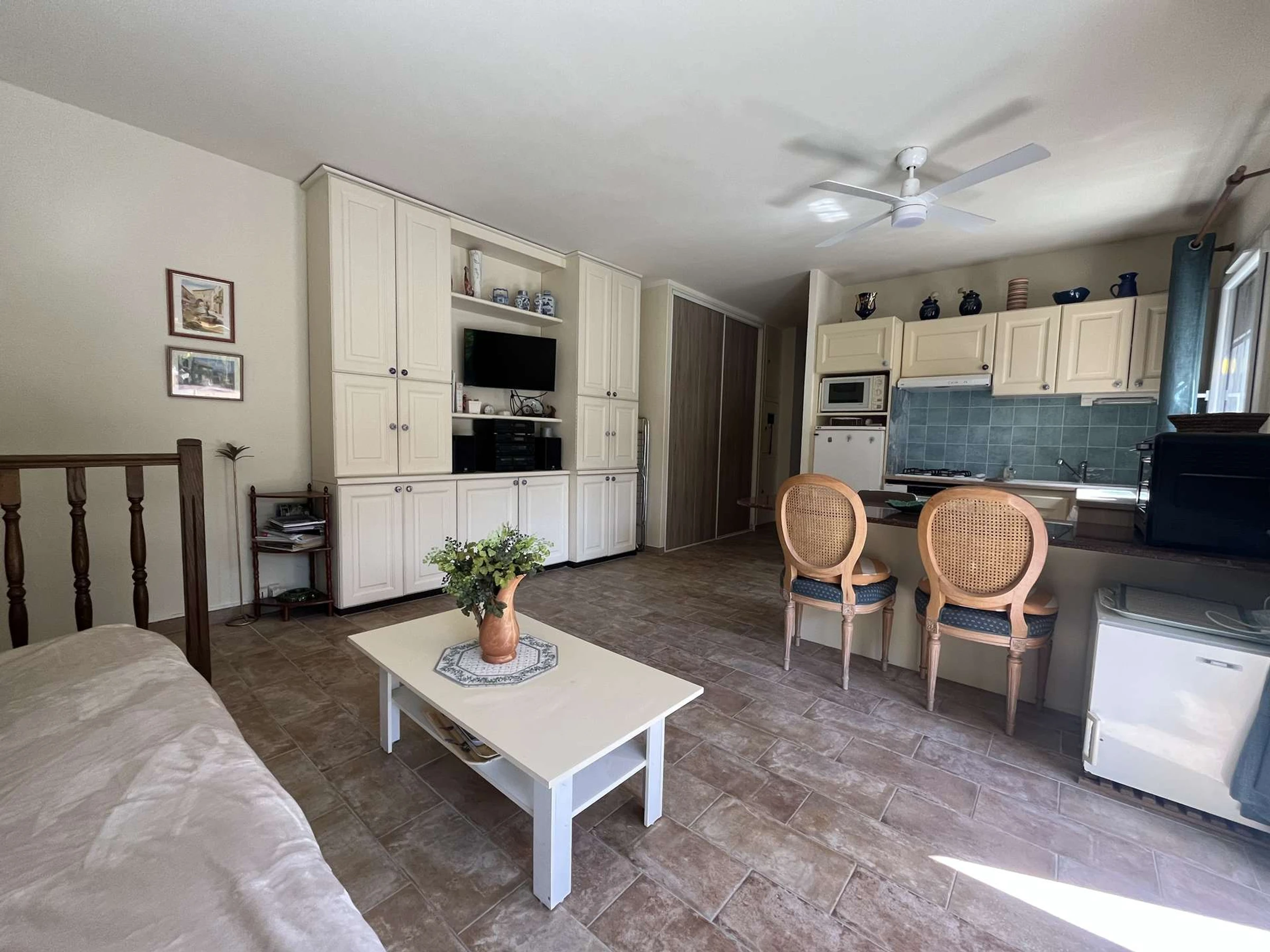 The living room, accessible through a French window, is ventilated by a ventilated ceiling and includes a double sofa bed, a storage unit, and a flat-screen TV.
