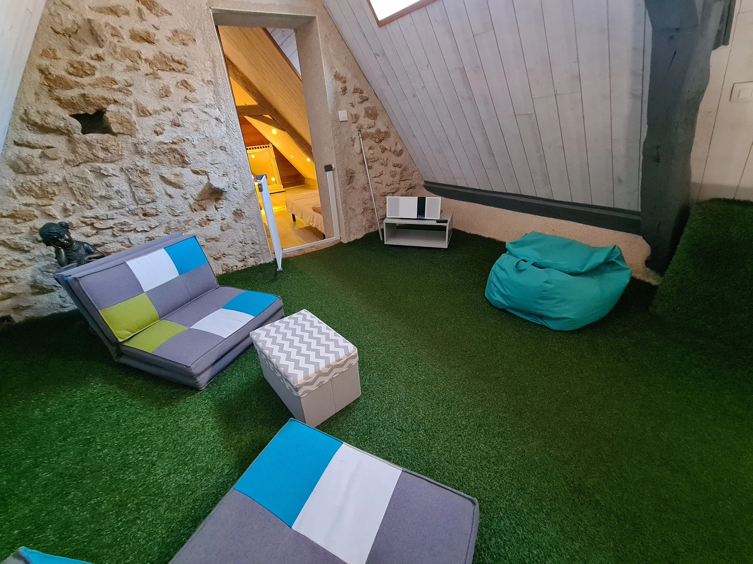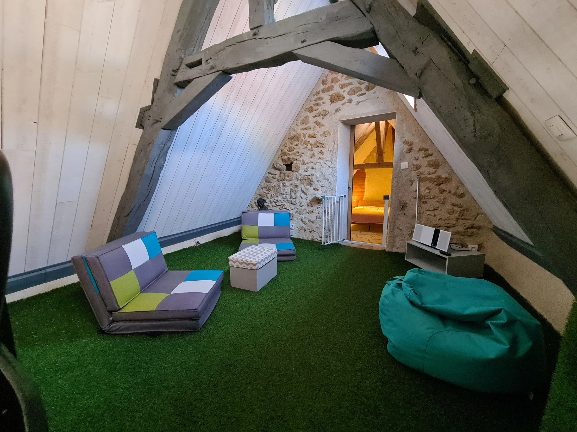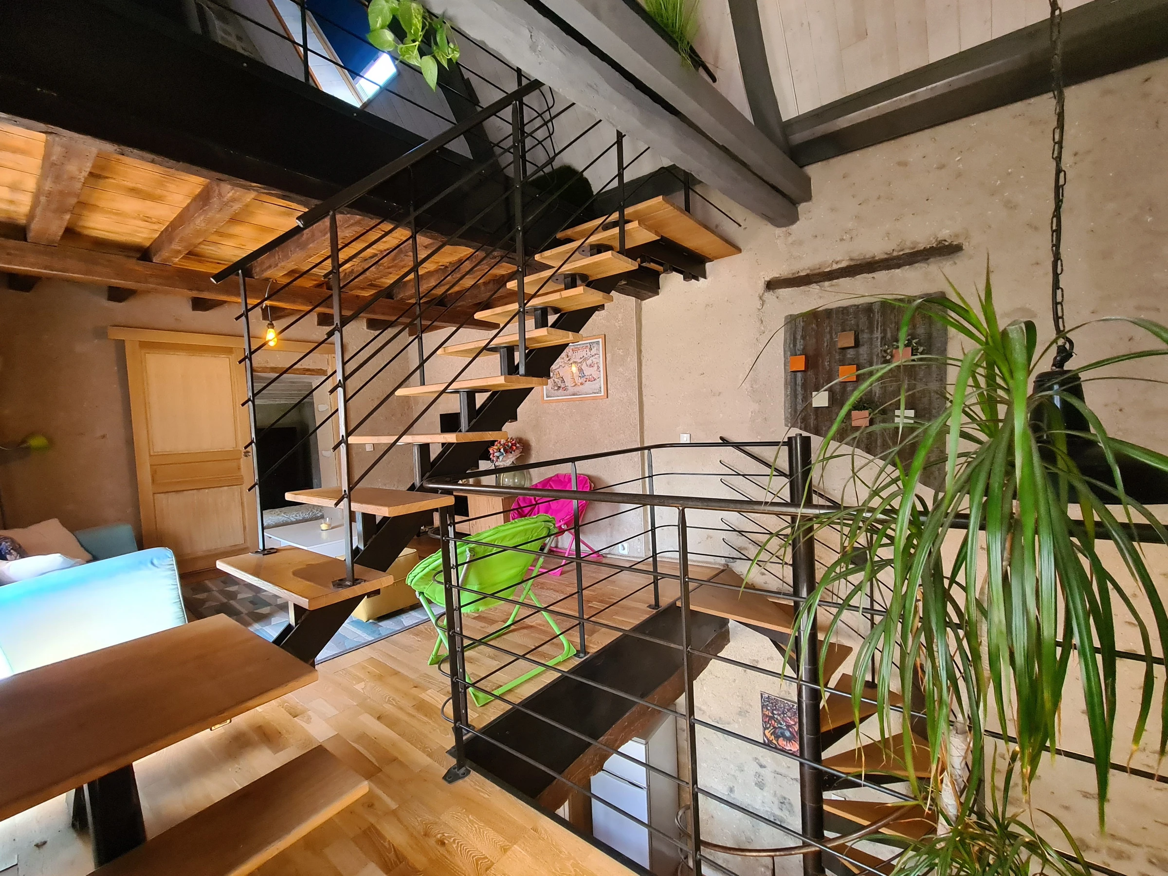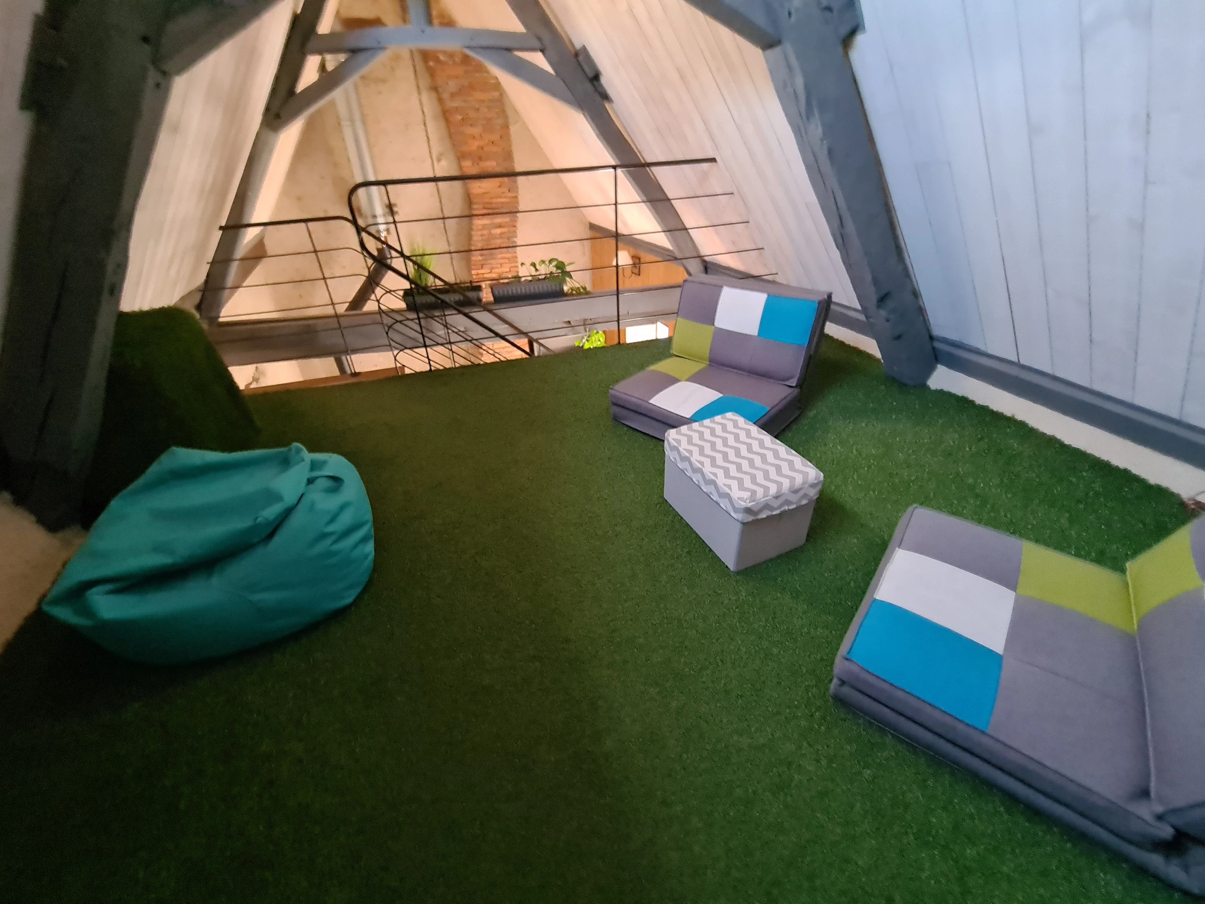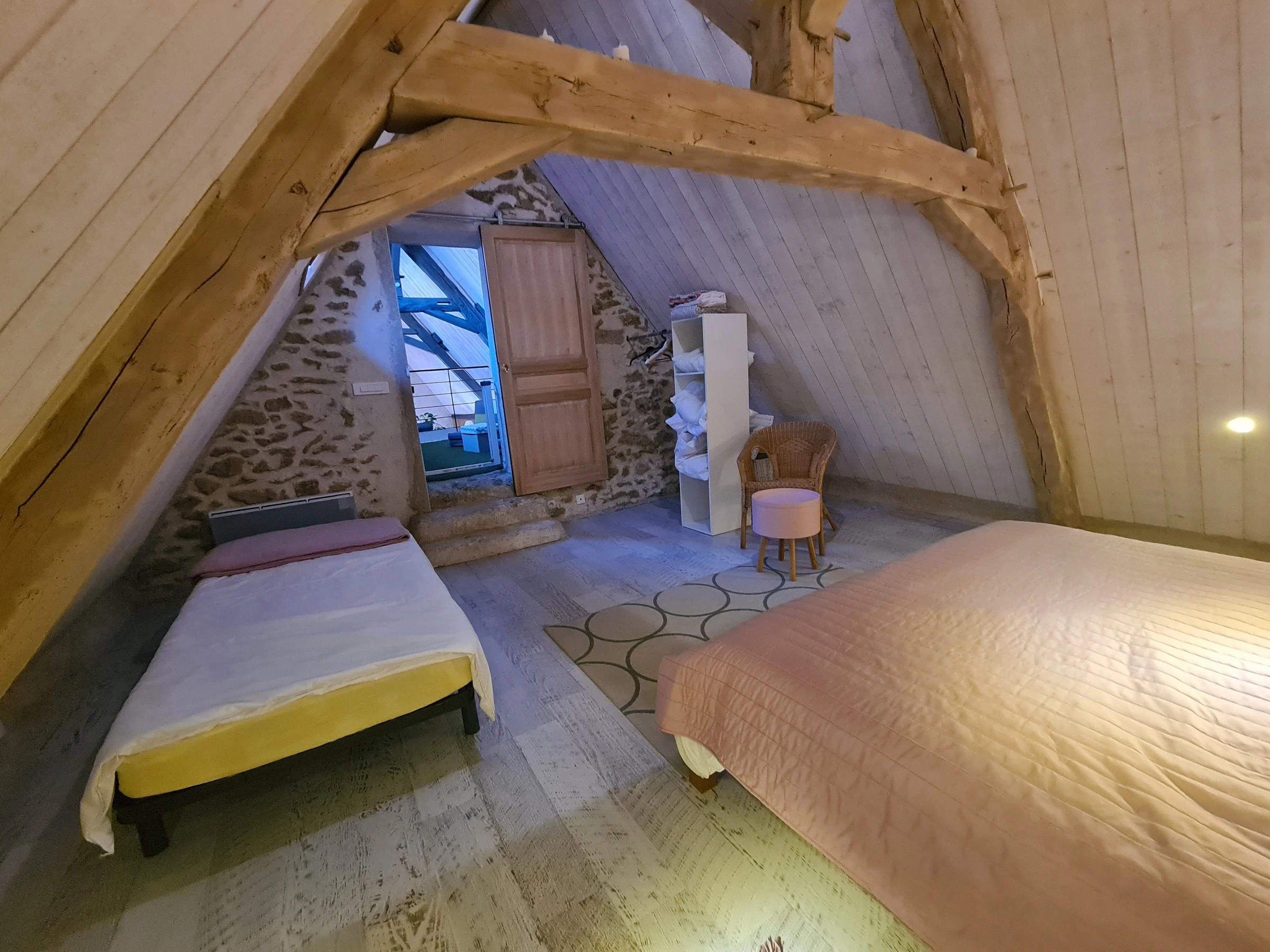 Second floor: Bedroom with a 160 x 200 cm bed and a single bed - Zen corner on the mezzanine (two extra foam armchairs).
