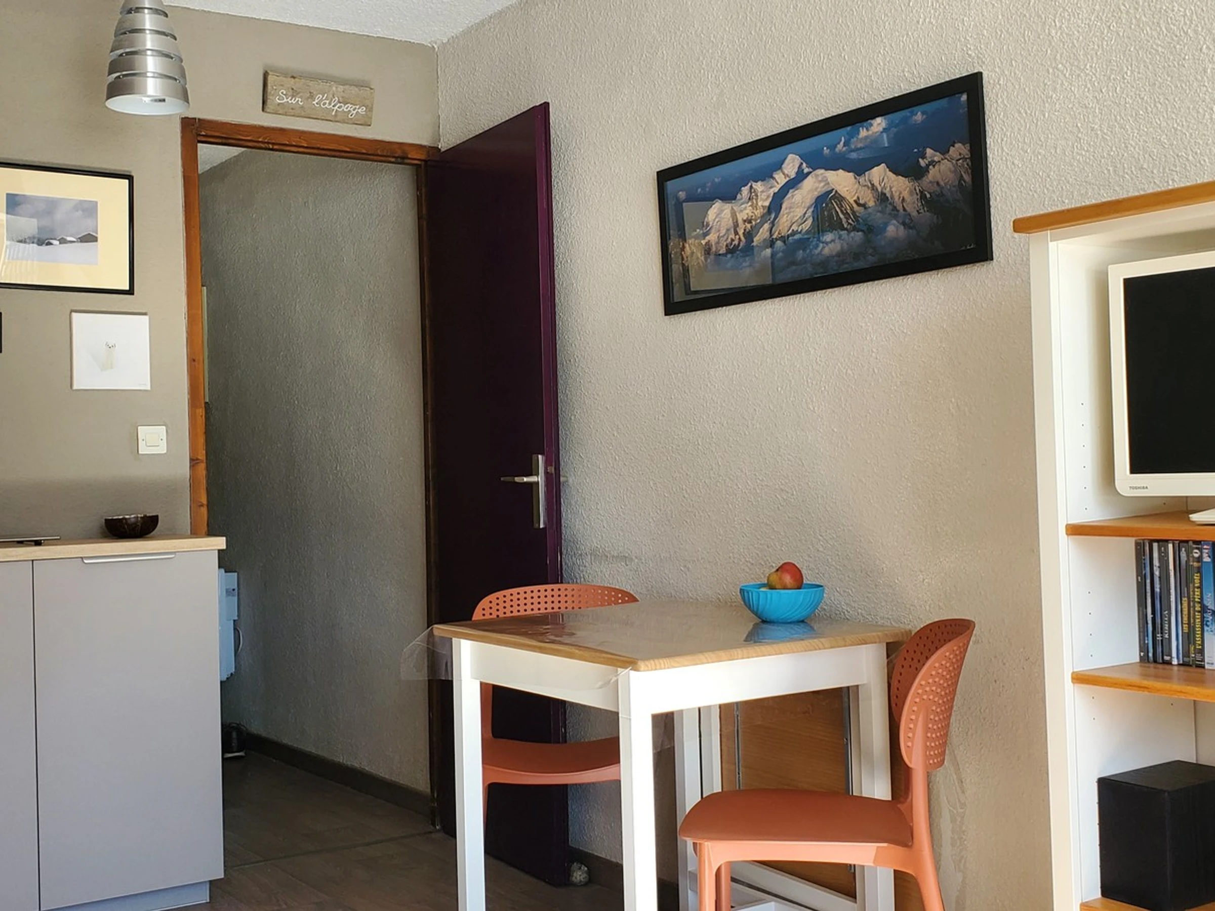 -Un salon équipé d' un clic-clac , d'un meuble, d'un téléviseur, d’un lecteur DVD et d’une mini-chaine hifi,