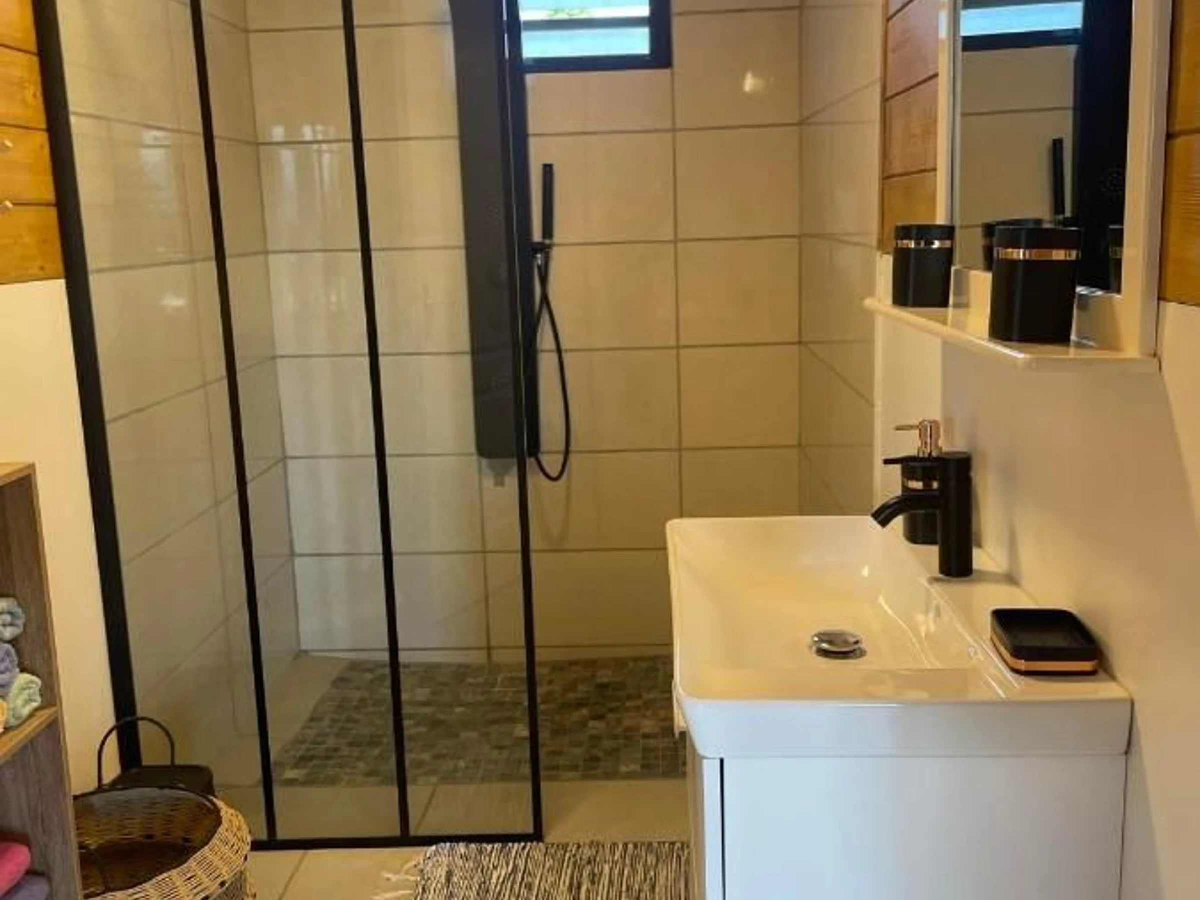 A bathroom with walk-in shower