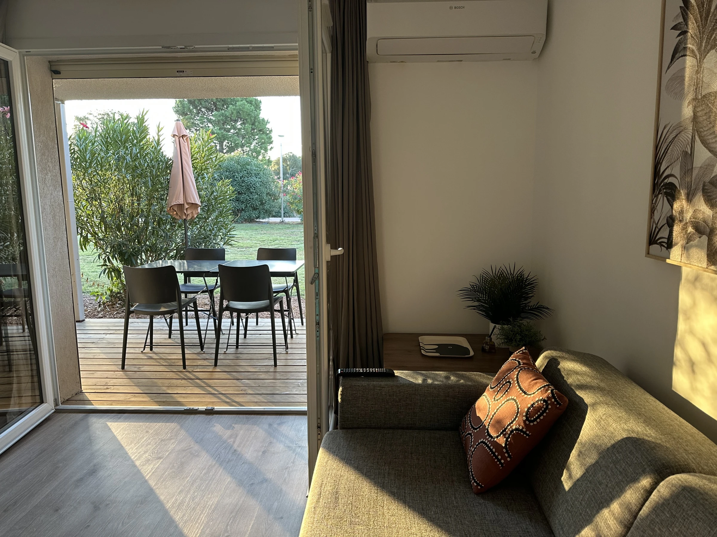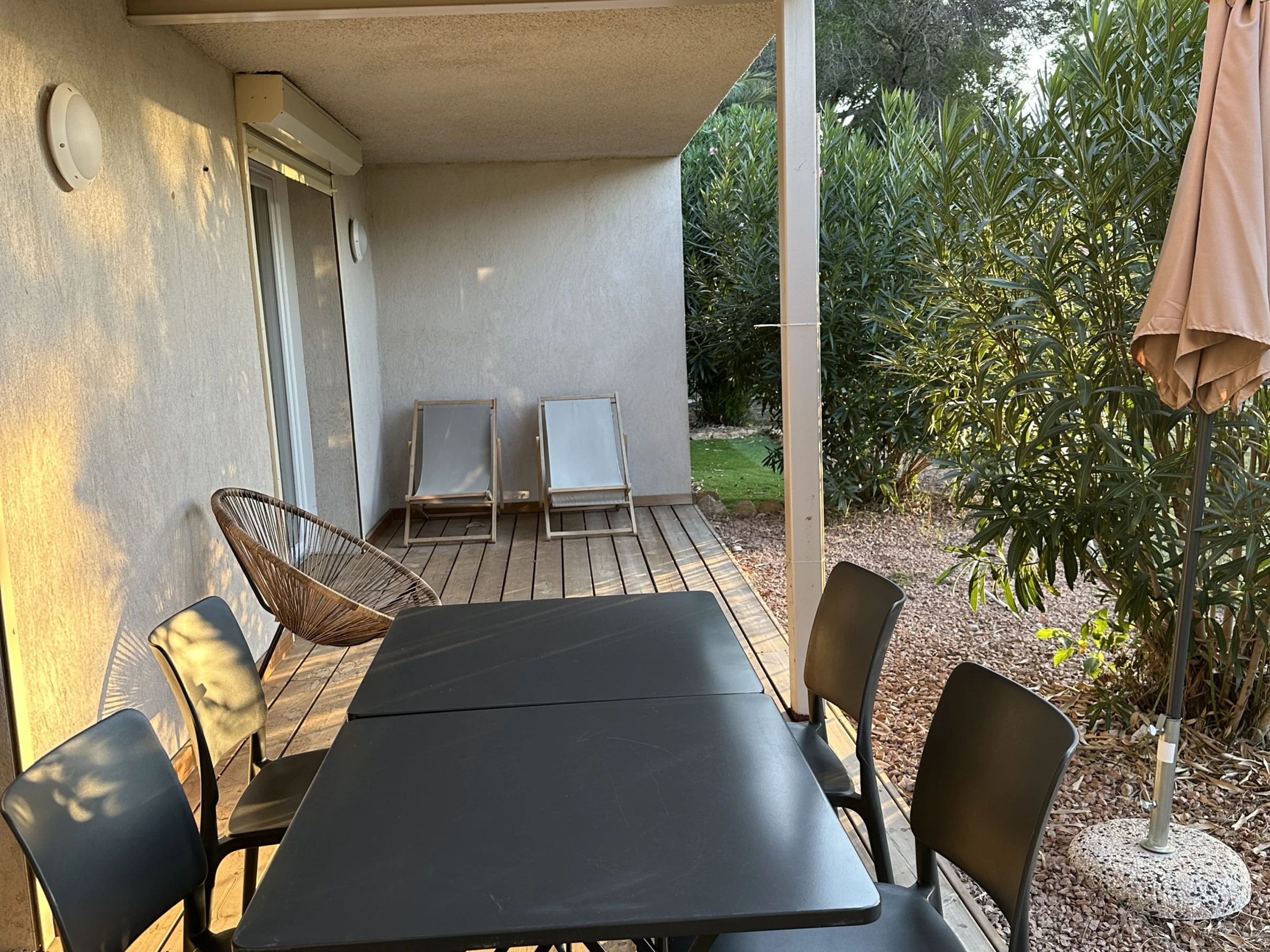 Apartment located on the ground floor of the Fiori di Cala Rossa hotel residence, in a quiet and green setting in Lecci, near Portovecchio, Capacity for 6 people. bed linen, towels and cleaning are included.