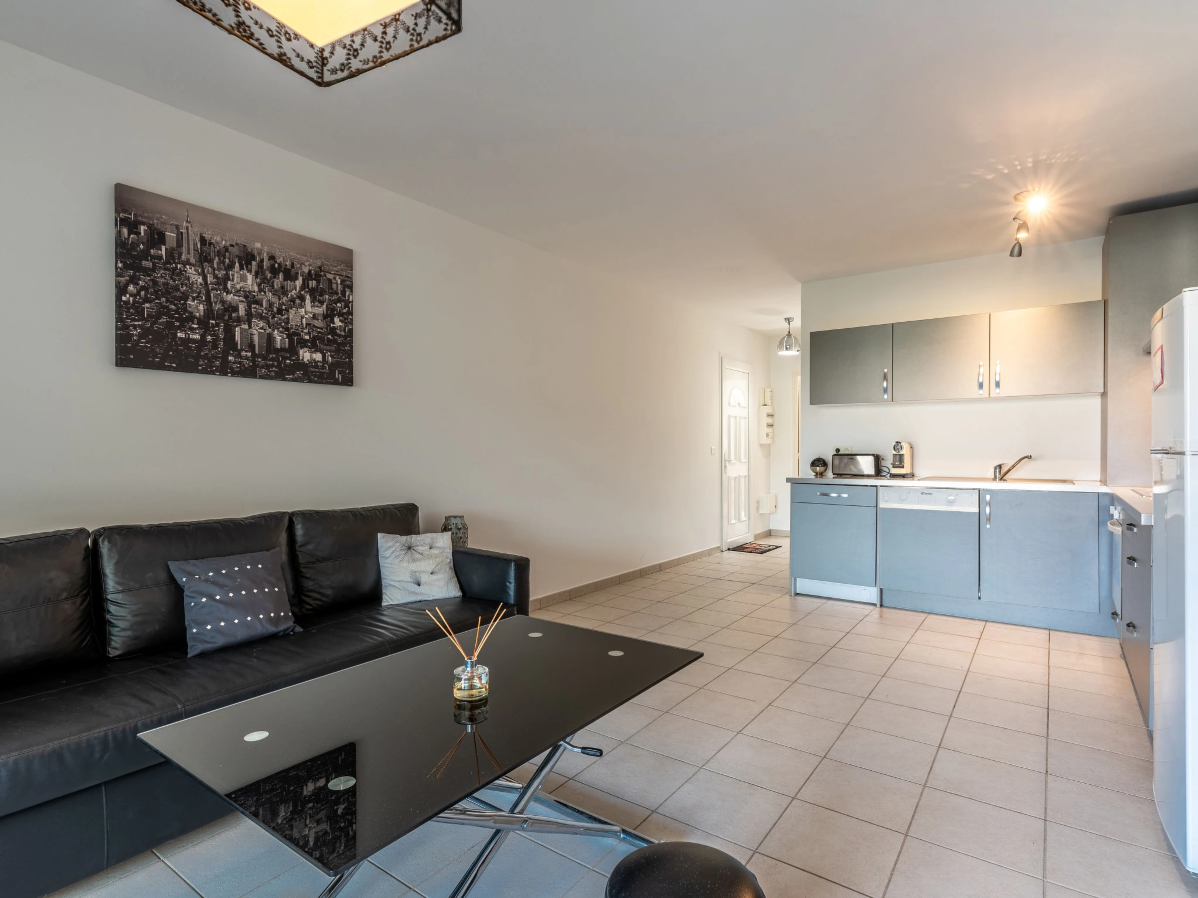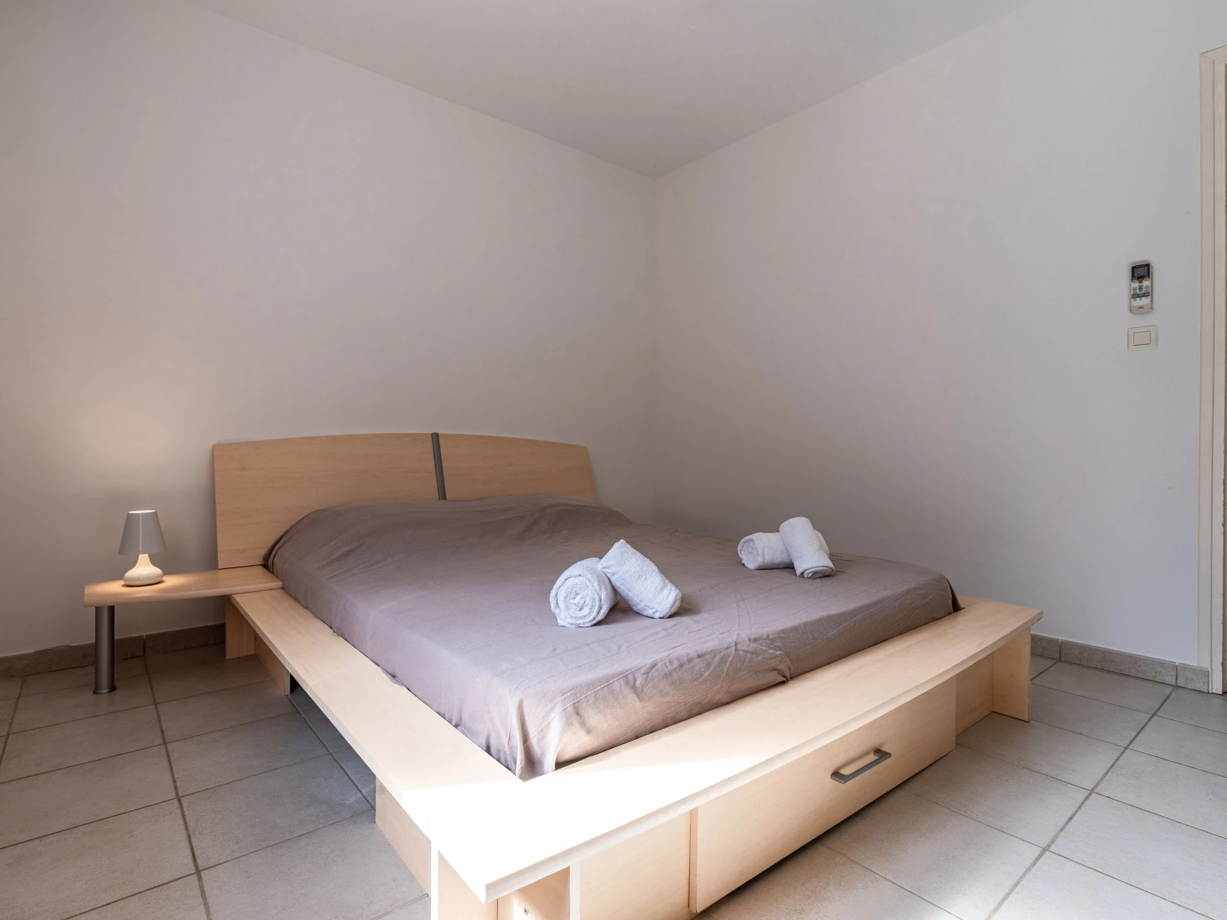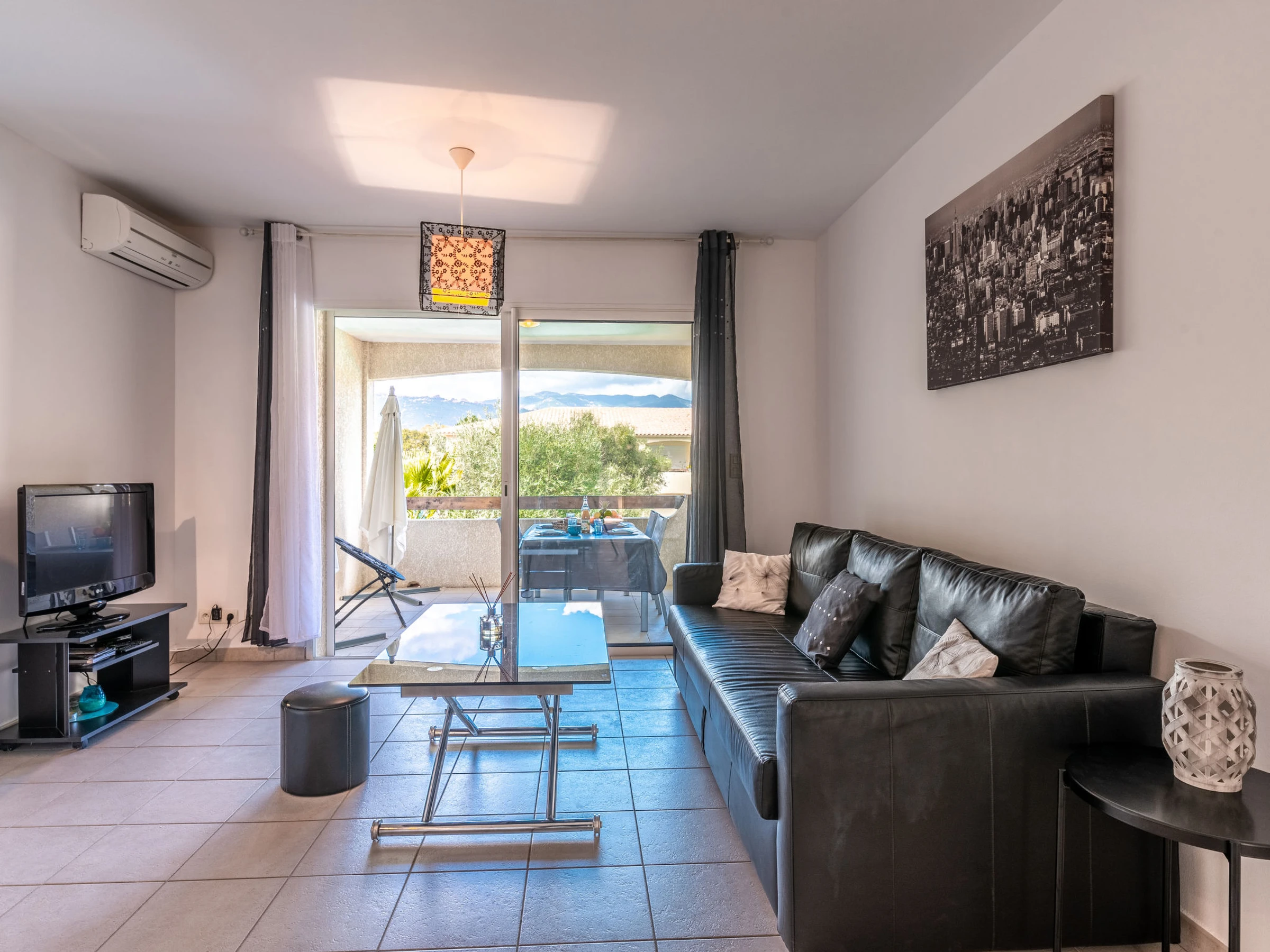 "Le Jardin d'Alzetu", 2-room apartment 46 m2, on the upper floor. Simple and beautiful furnishings: living/dining room with panoramic window with 1 double sofabed (160 cm, length 190 cm), TV (flat screen). Exit to the terrace. 1 room with 1 french bed (160 cm, length 190 cm). Open kitchen (oven, dishwasher, 1 ceramic glass hob hotplate, 3 gas rings, kettle, microwave, electric coffee machine, Capsules for coffee machine (Nespresso) extra) with dining table. Shower/WC. Electric heating, air-conditioning. Terrace 12 m2, roofed, west facing position. Terrace furniture. View of the mountains. Facilities: washing machine. Internet (WiFi, extra). Reserved parking space n 106. Please note: smoke alarm.