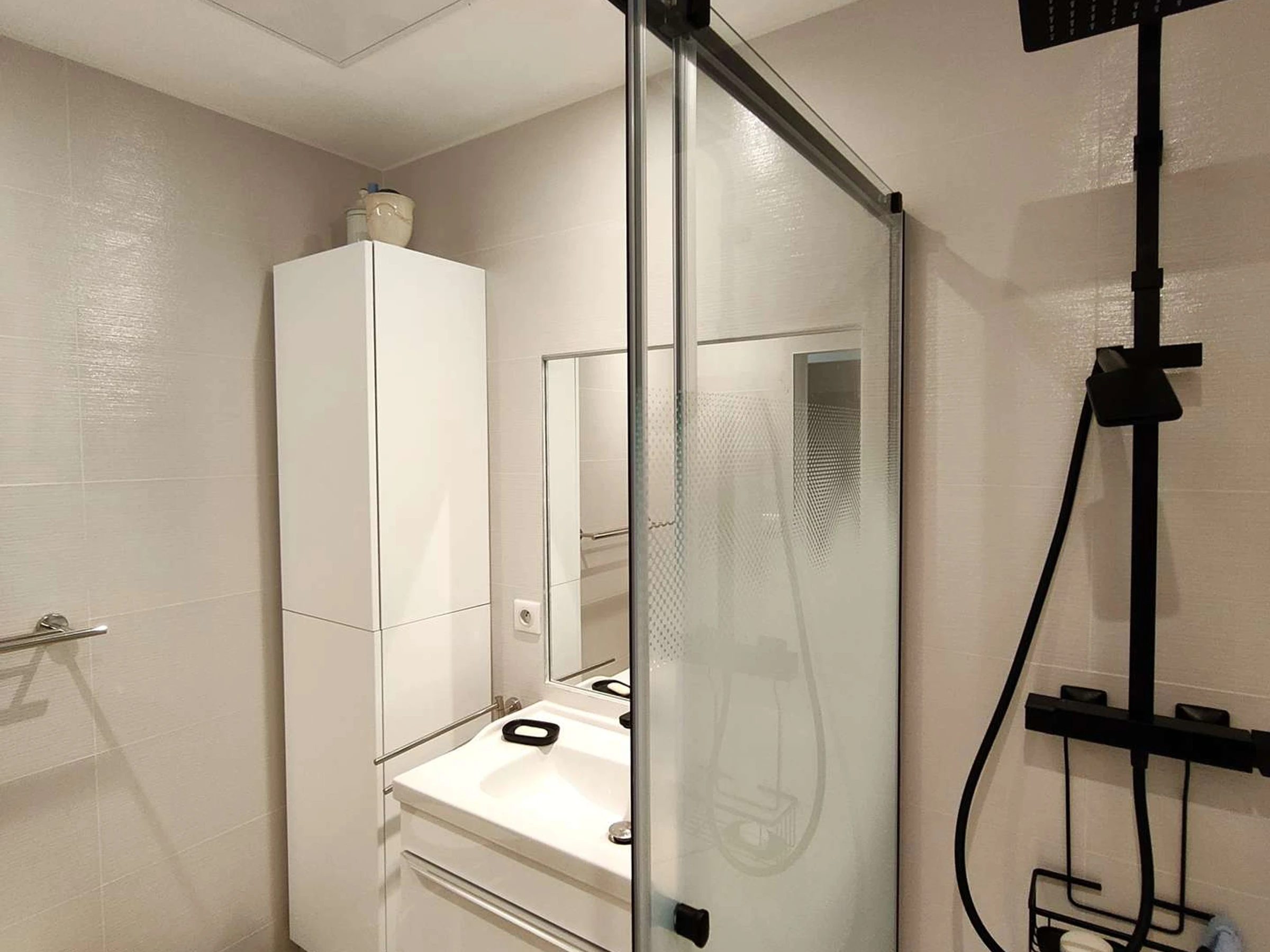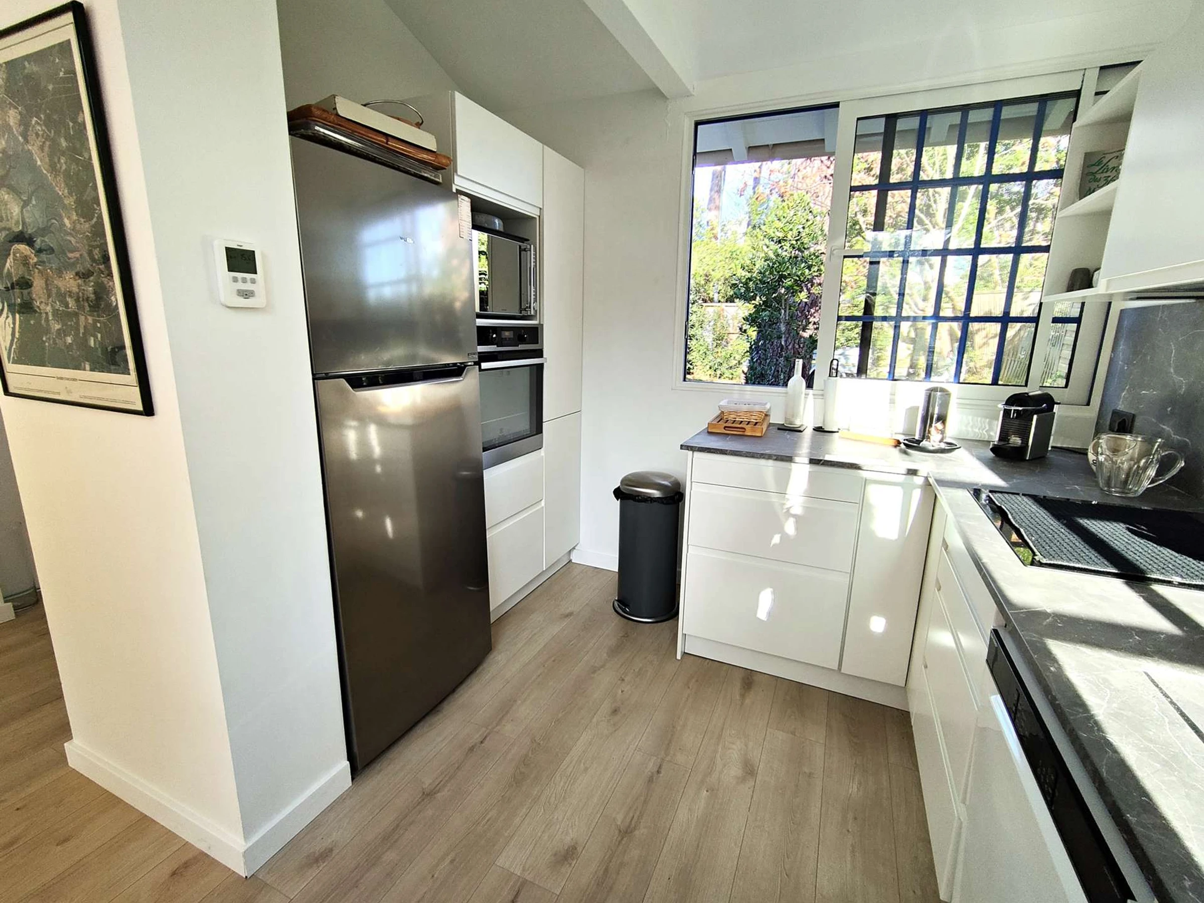 It features a spacious 50 m² living room bathed in light, with a television, which opens onto a superb 80 m² southwest-facing wooden terrace. The kitchen is fully fitted and equipped, complete with a walk-in closet with a washing machine.