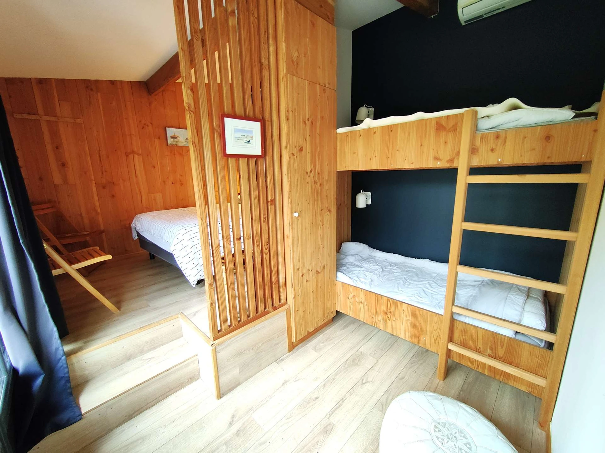 The property comprises four bedrooms, three of which are in the main house and one additional bedroom in the cabin. All three bedrooms have a double bed (140 cm), one of which has a private bathroom (walk-in shower, double sink) and television, opening directly onto the terrace. A separate bathroom and separate toilet complete the layout.