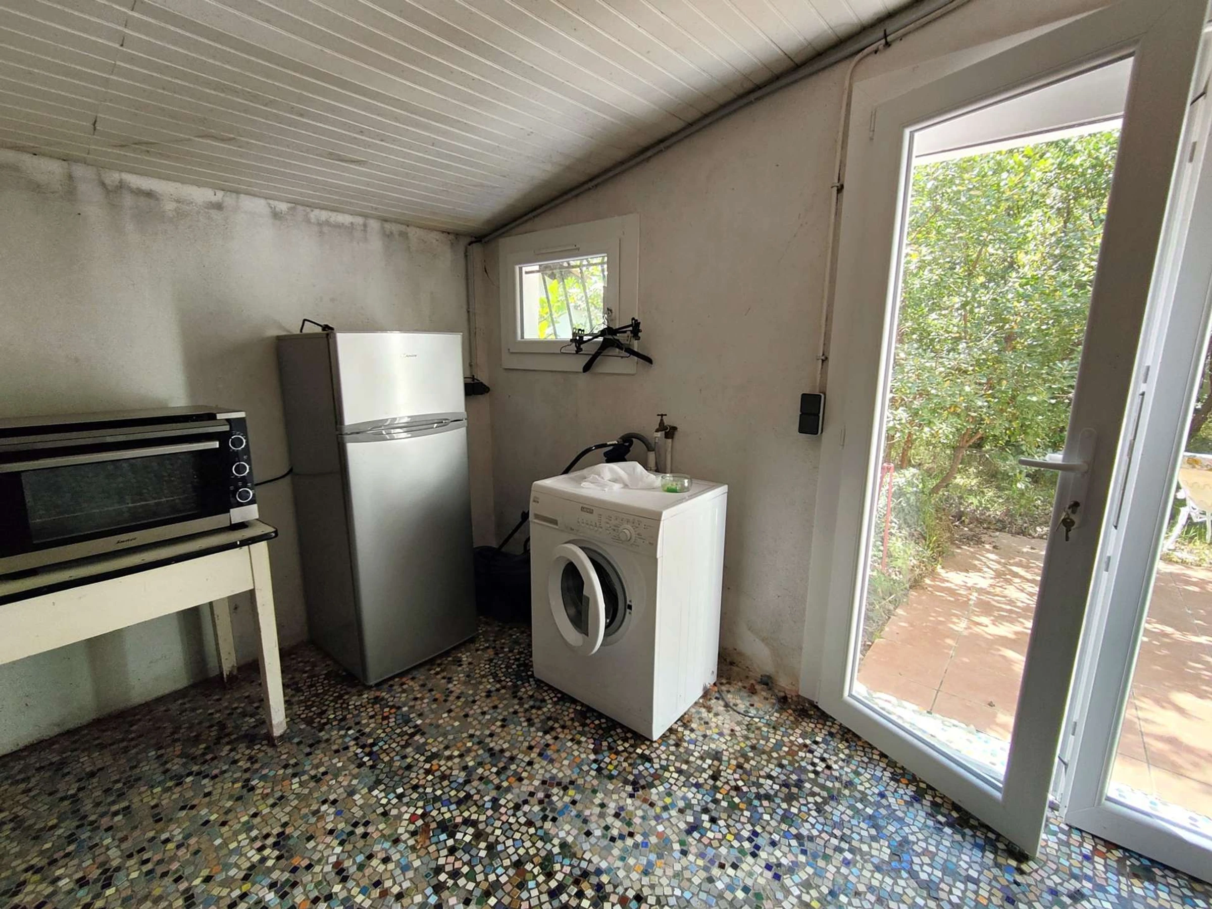 This 60 m² villa includes a living room with a television, opening onto the first east-facing terrace, a kitchen leading to the second west-facing terrace, two bedrooms, one with a double bed and the other with two single beds, a bathroom, separate toilet, and a garage, used as a laundry room, equipped with an oven, a second refrigerator, and a washing machine. The garage provides access to both terraces (west and east).