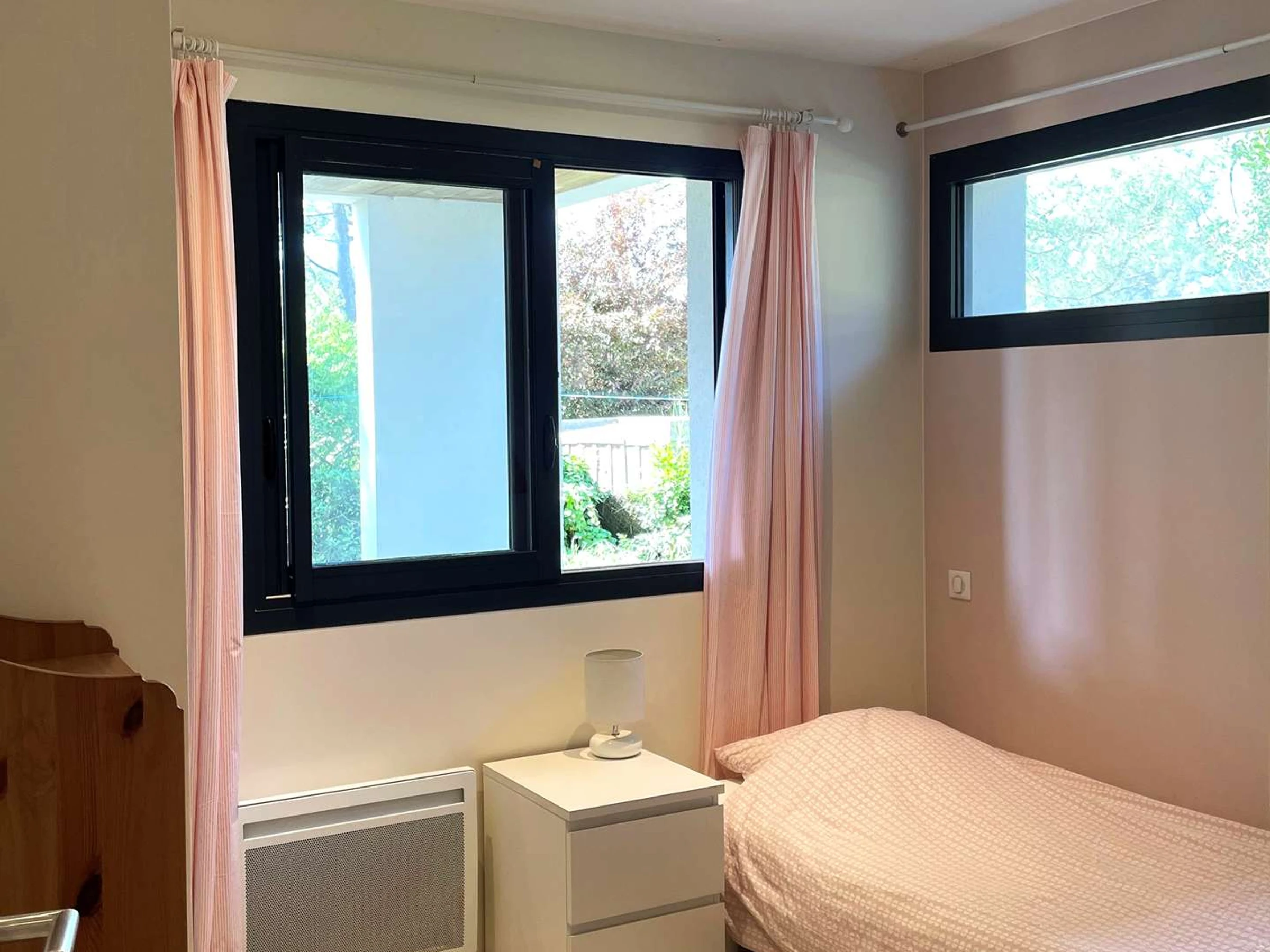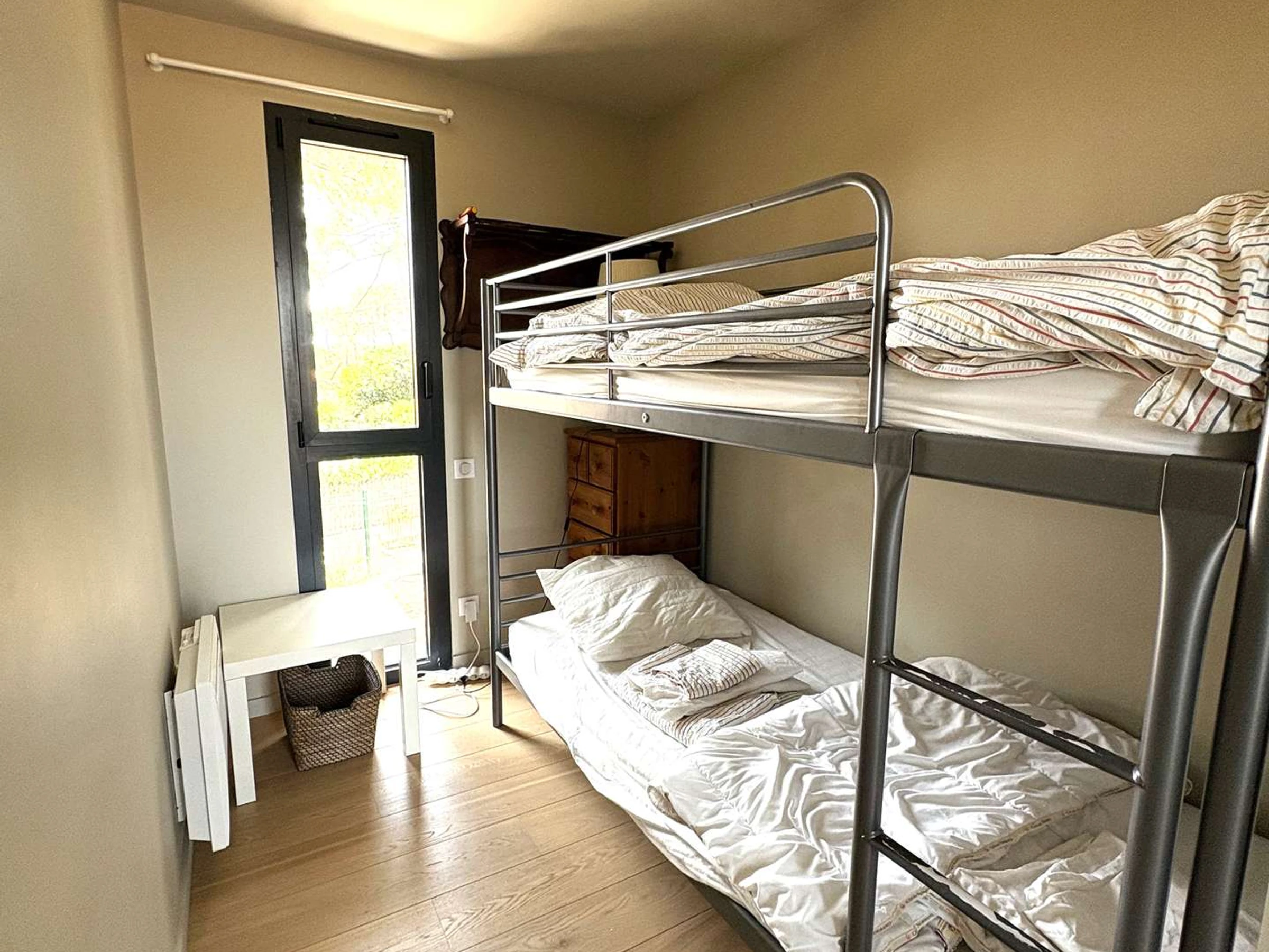 This house, designed to maximize the view of the basin, features living areas on the upper floor. There you'll find a spacious living-dining room opening onto a terrace with sun loungers, perfect for relaxing while watching a beautiful sunrise. This level also includes a kitchen with a pantry, a bedroom with a queen-size bed (160 cm) and an en-suite shower room, a bedroom with two single bunk beds (90 cm), and a separate toilet.