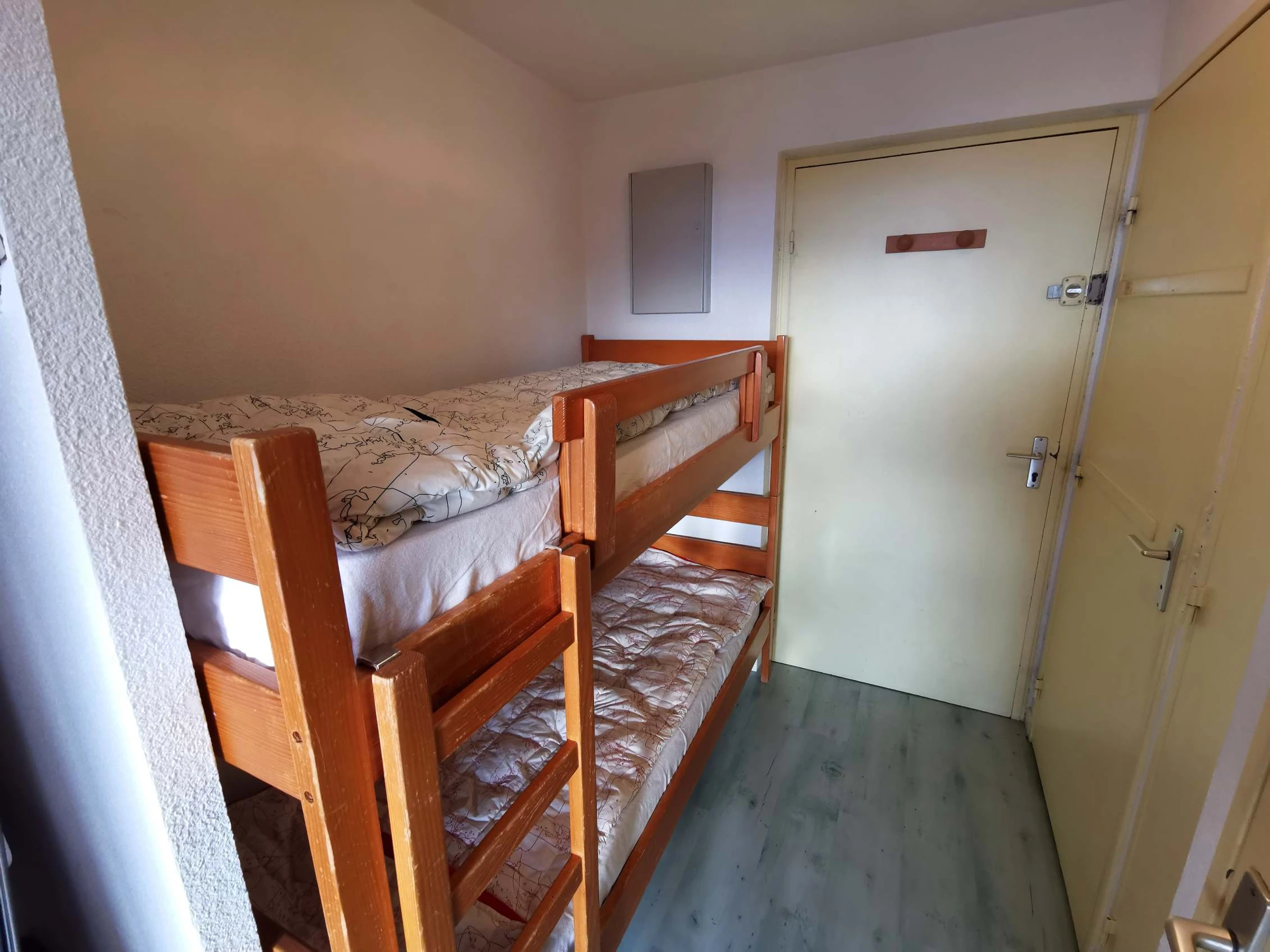 - Living room with a sofa bed (160 cm) and a sleeping alcove with two single bunk beds (80 cm).