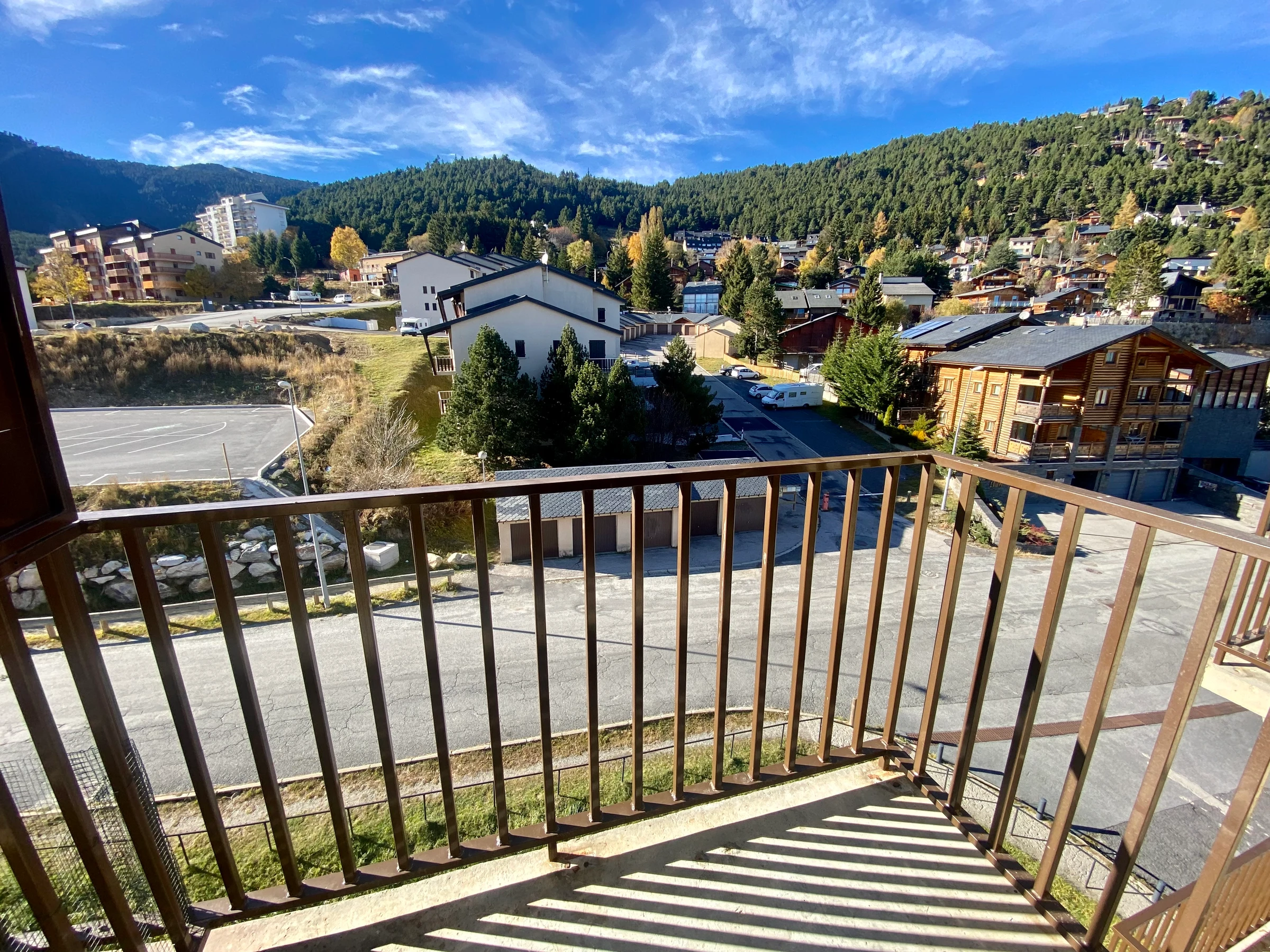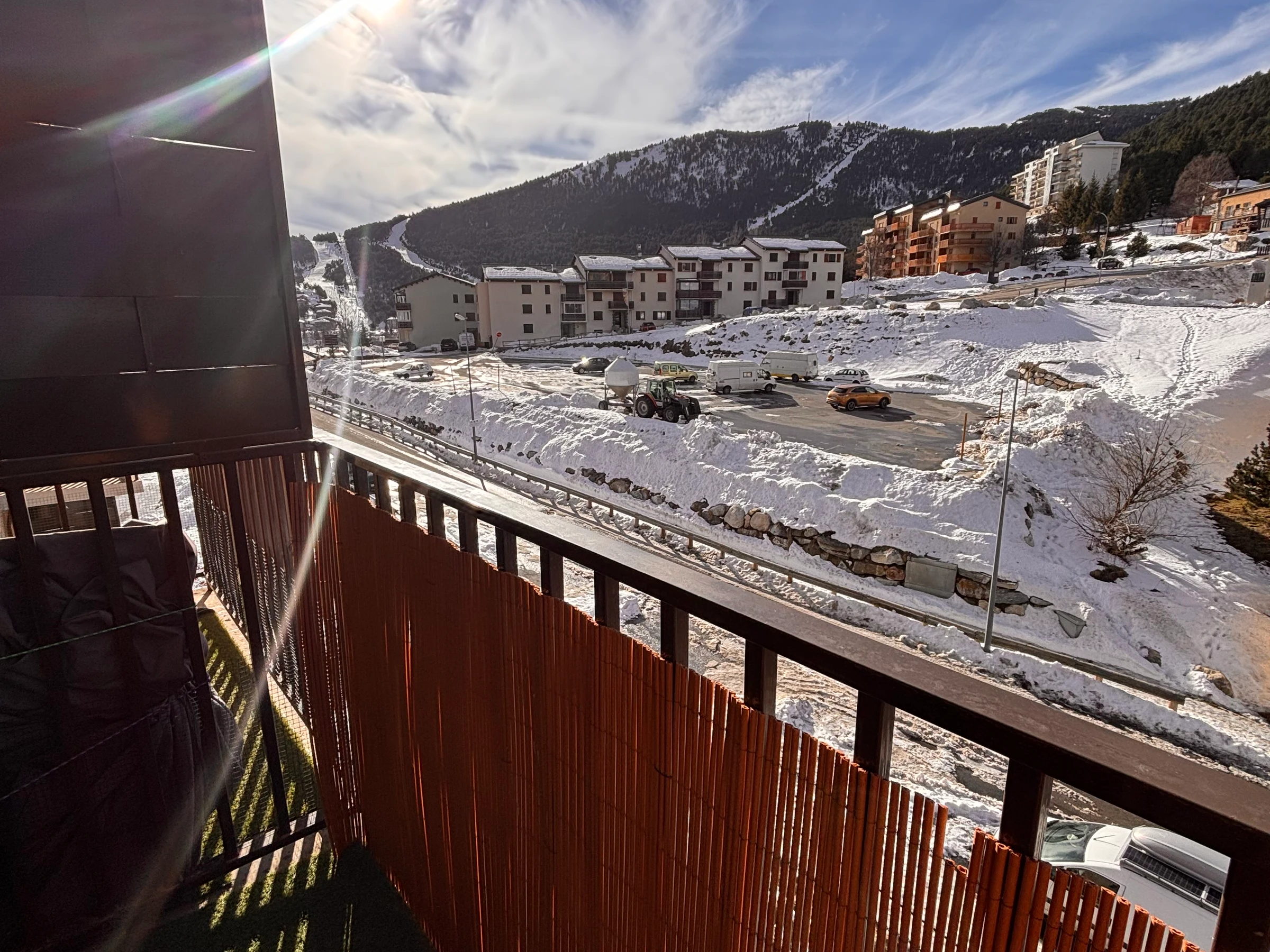 The living area opens onto a balcony with mountain views.