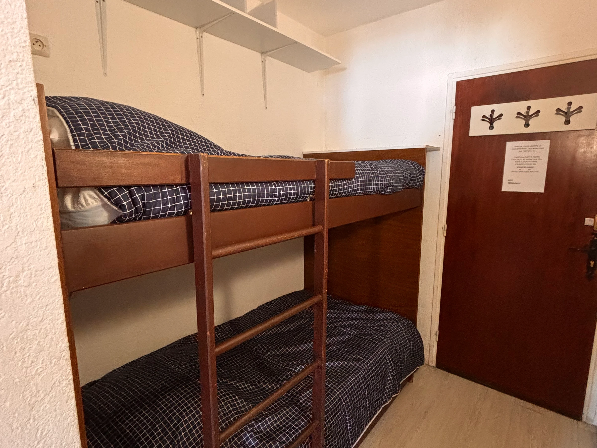 The apartment comprises an entrance/alcove with two bunk beds, leading to a bathroom/WC and a living area.