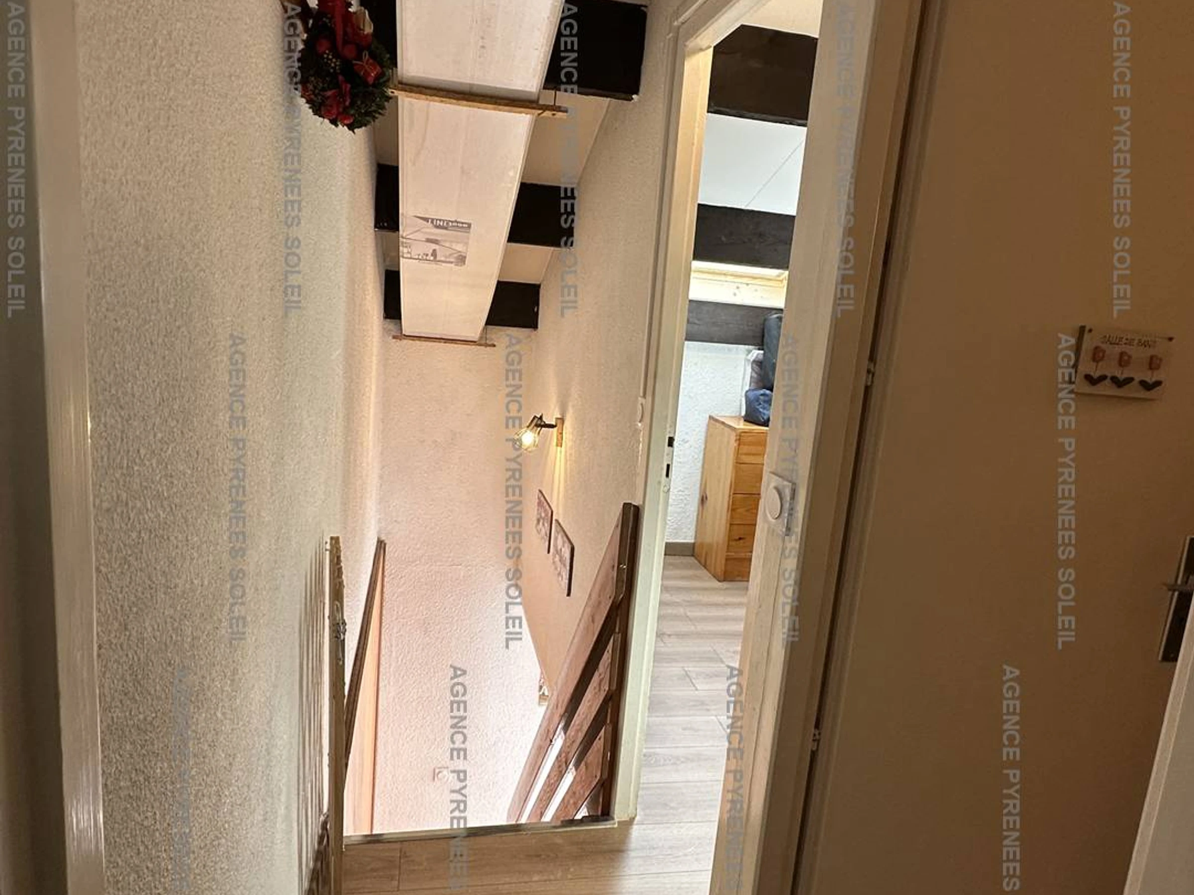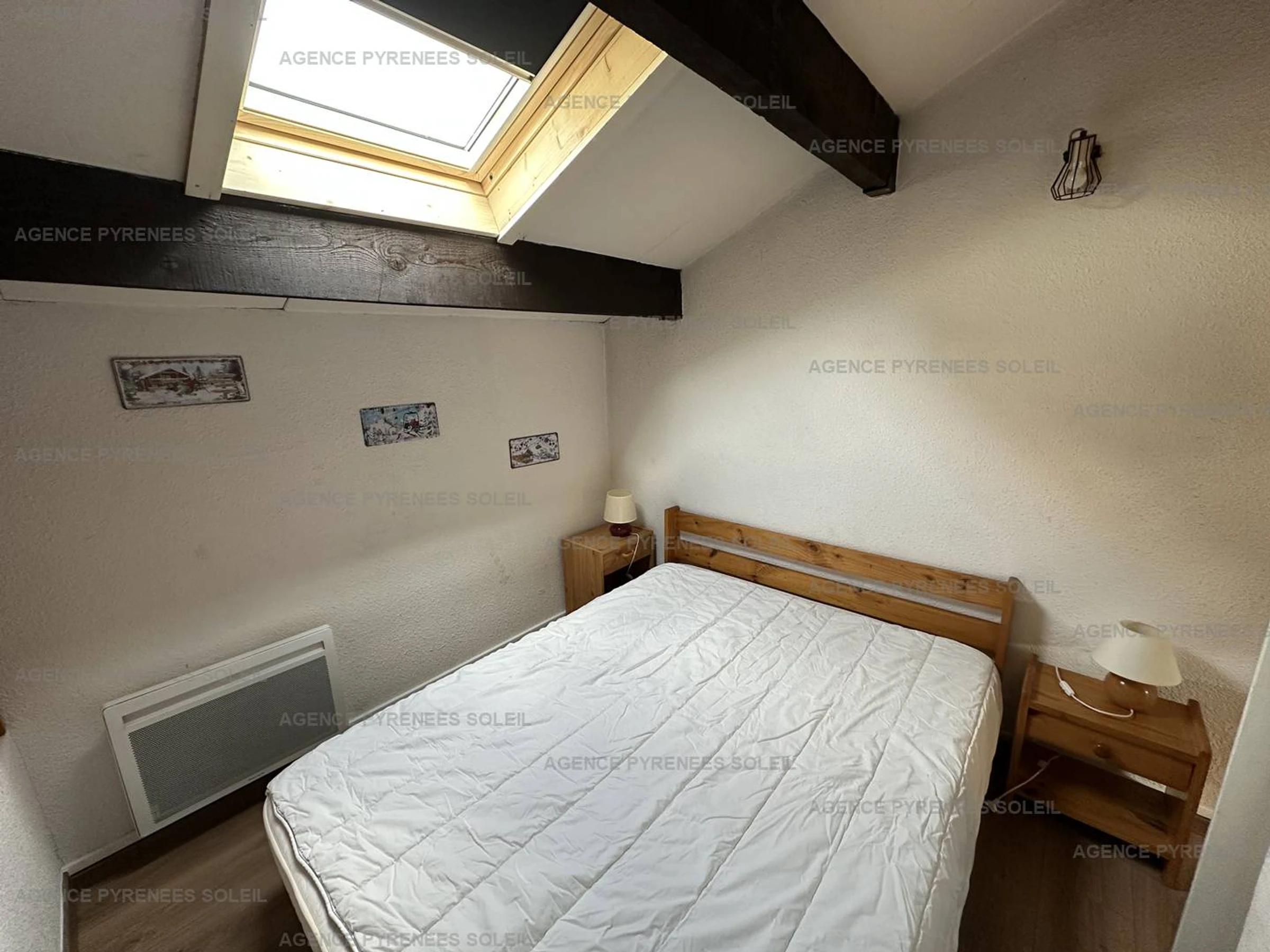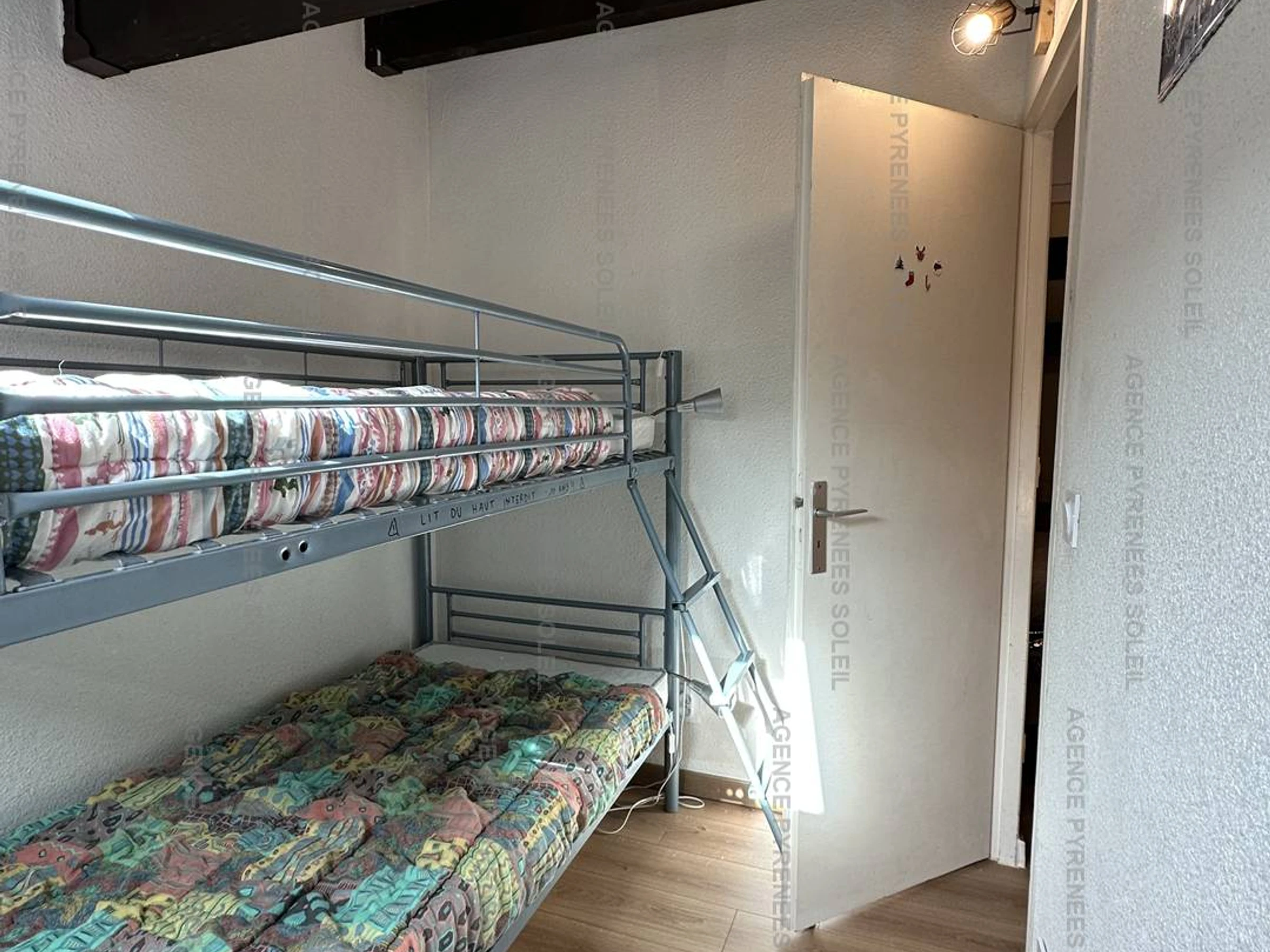 Upstairs: 2 attic bedrooms (one with a double bed and storage, the other with bunk beds), bathroom.