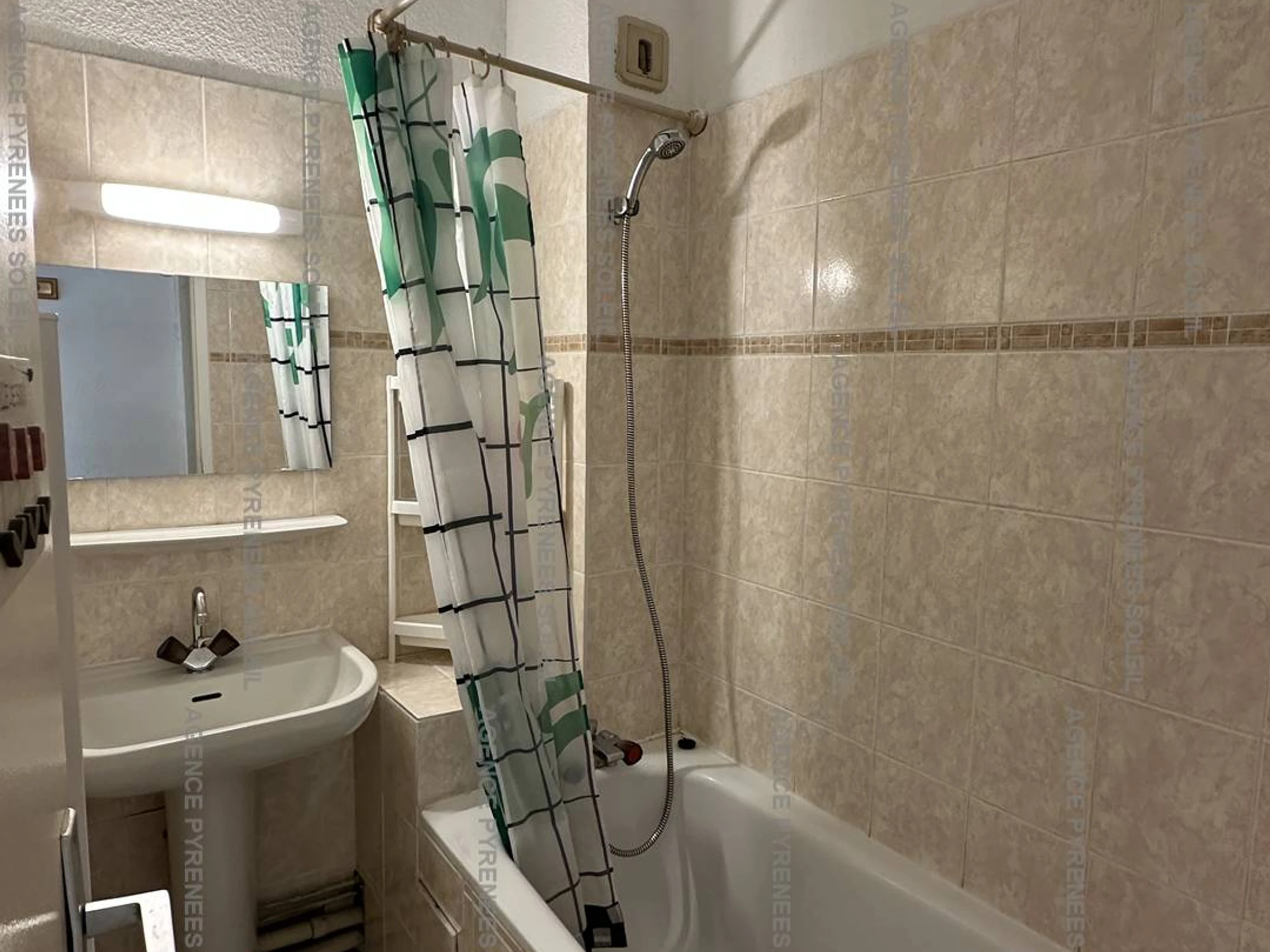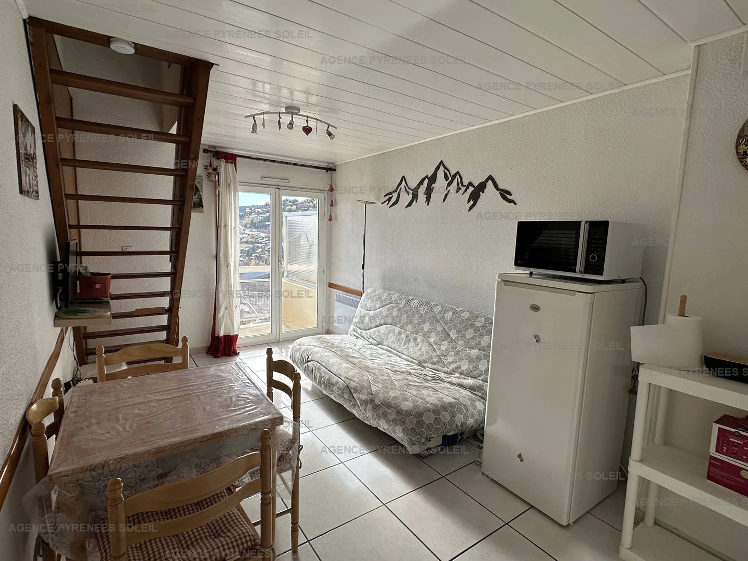 Apartment located on the 3rd floor (no elevator), in the center of the resort (shopping arcade on the ground floor and chairlift departure point 50m away). Includes: entrance (wardrobe), separate WC, living room with sitting area (double sofa bed, flat-screen TV), south-facing balcony with views of the village and mountains, dining area, kitchenette (cooktop, microwave, refrigerator, sink, extractor hood).