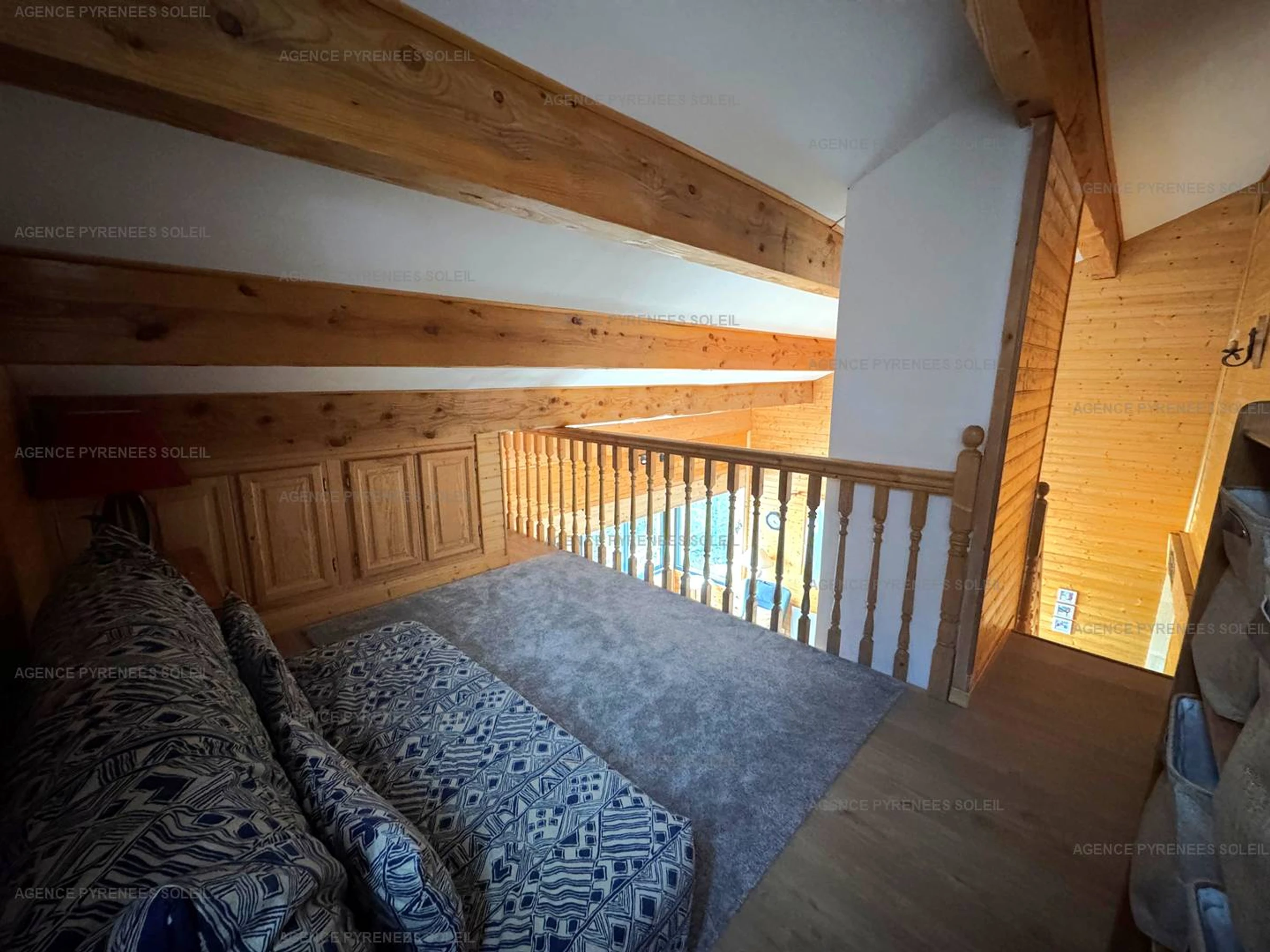 This 90 m² chalet top floor is located in a quiet setting with stunning views of Lake Matemale and the surrounding mountain range. Facing southeast, it offers a bright and comfortable living room with a sofa, armchairs, television, and fireplace insert, and a fully equipped kitchen including a four-burner induction hob, refrigerator-freezer, dishwasher, extractor hood, oven, microwave, and washing machine.