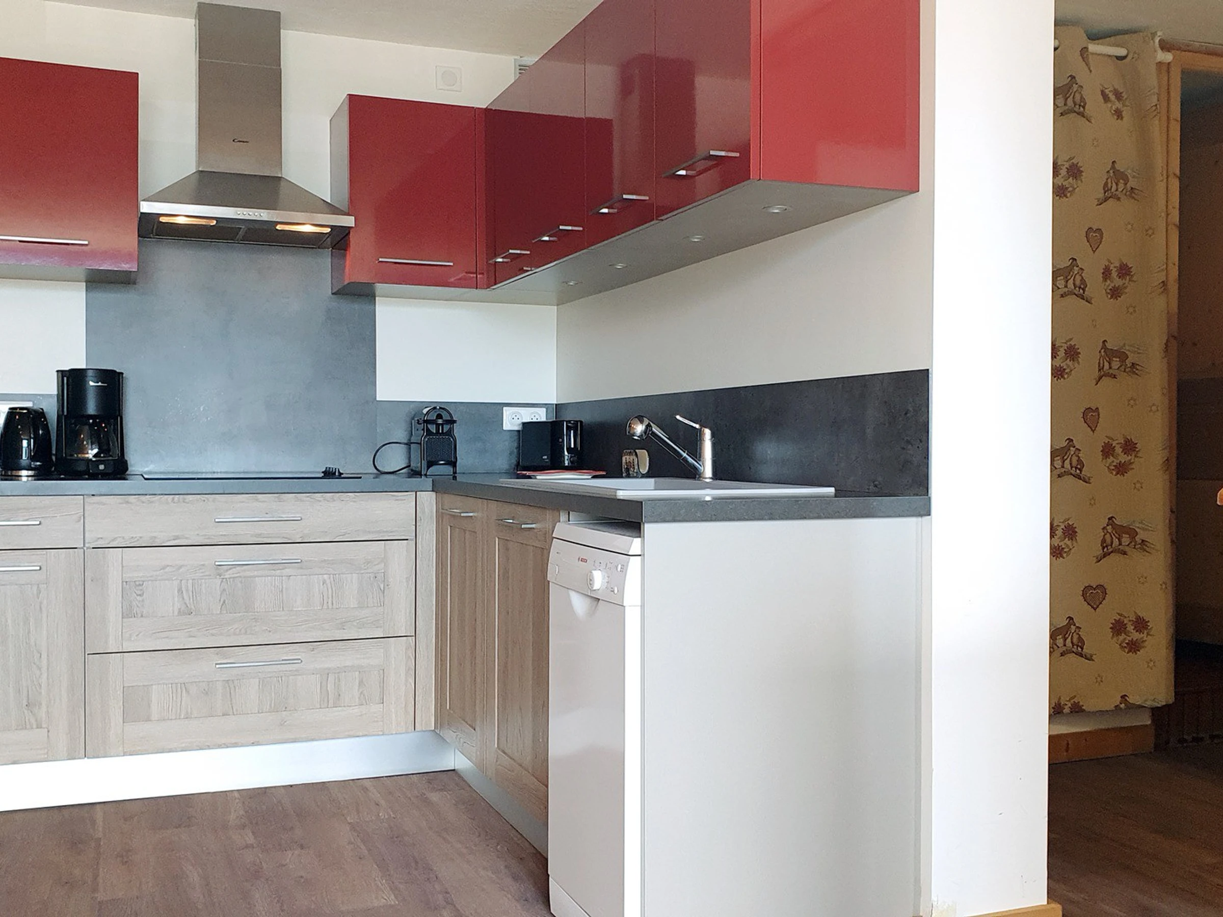 Equipped with a ceramic hobs, an oven, a microwave, a dishwasher and a fridge.