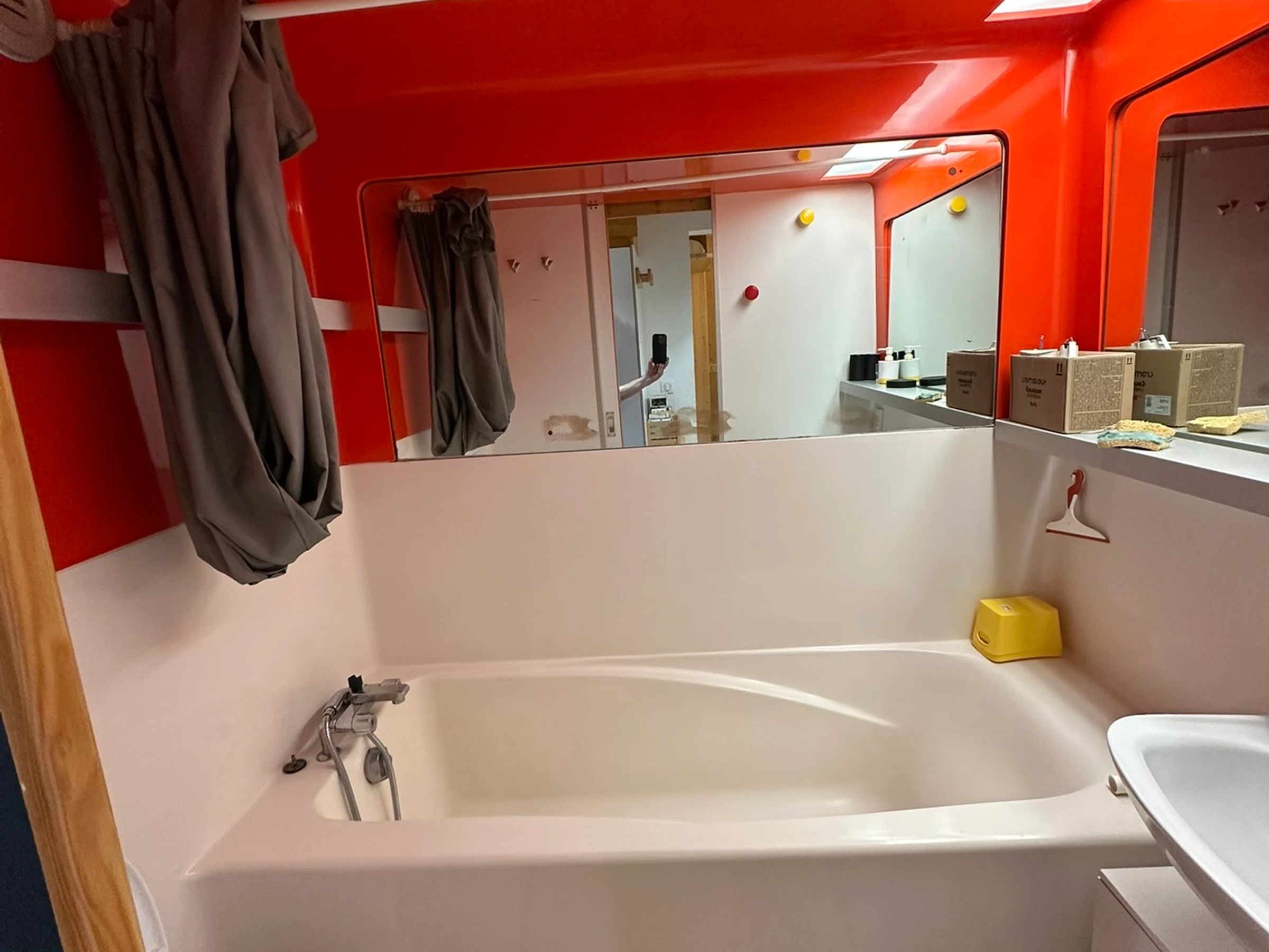 Upstairs (the mezzanine is less than 1.80 metres high) there is a landing with two bunk beds and another sleeping area closed off from the living room with a double bed.
