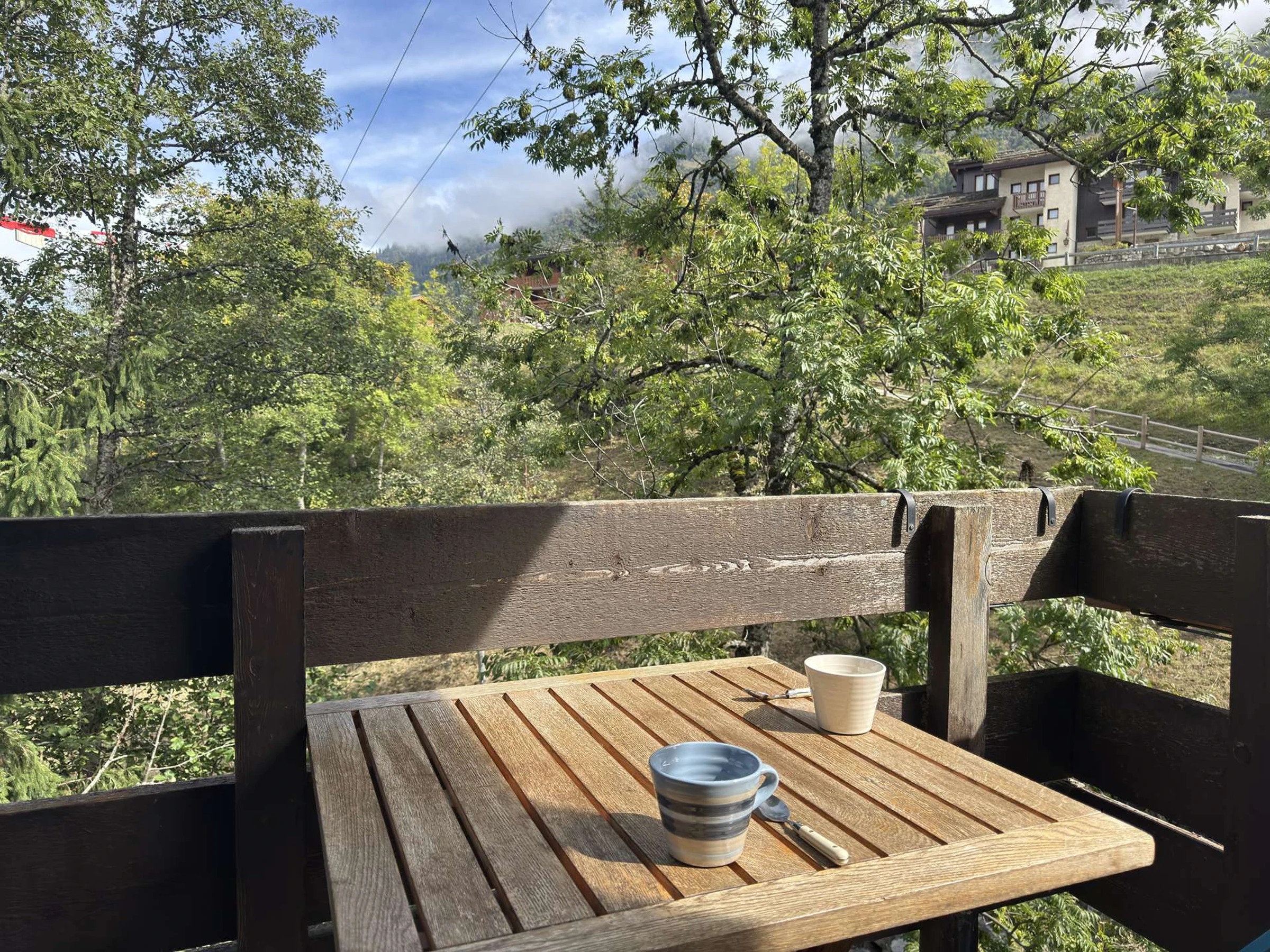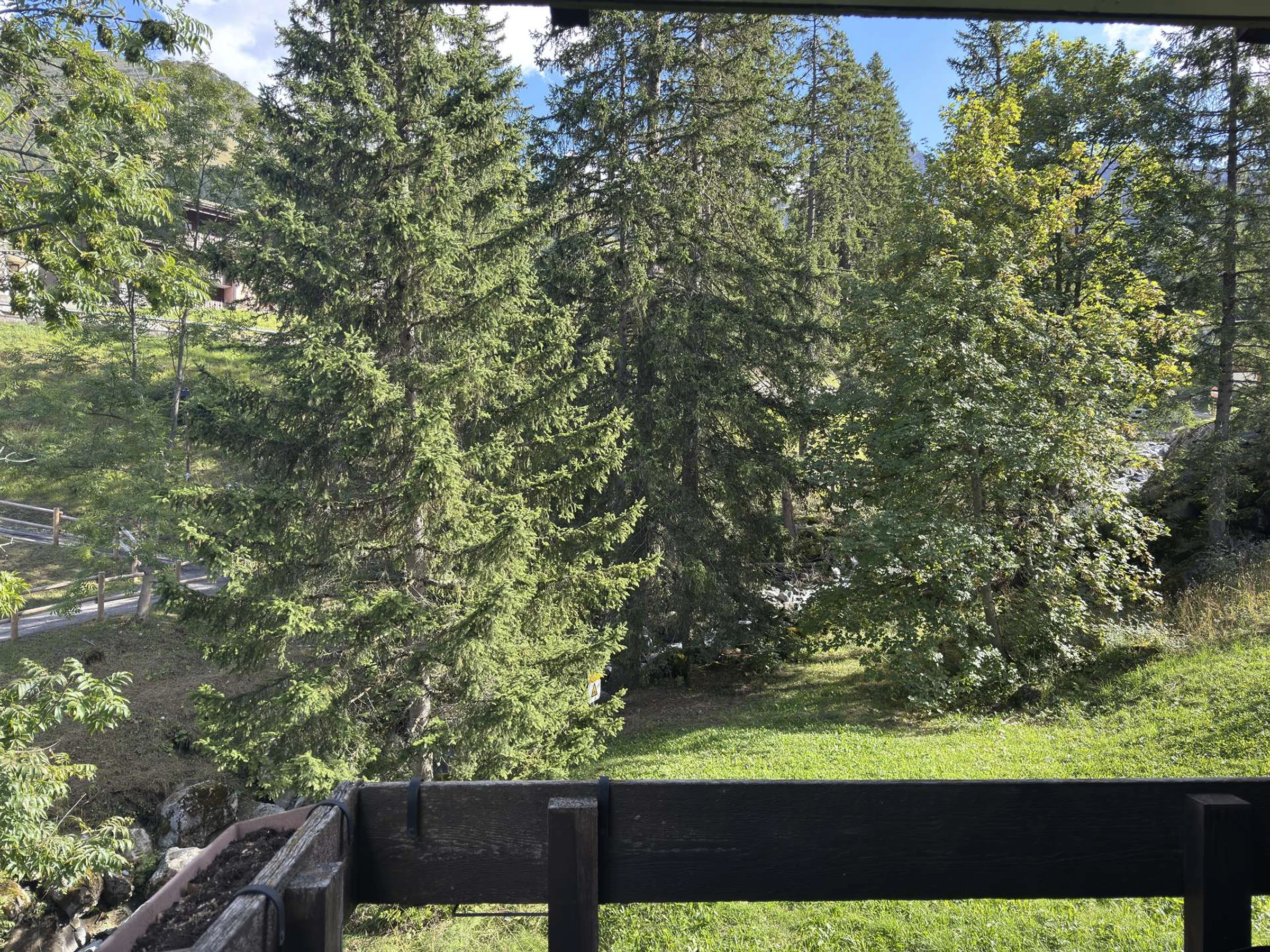 It features a kitchen open to the living room, a bathroom with toilet, and a spacious balcony overlooking the Morel stream.