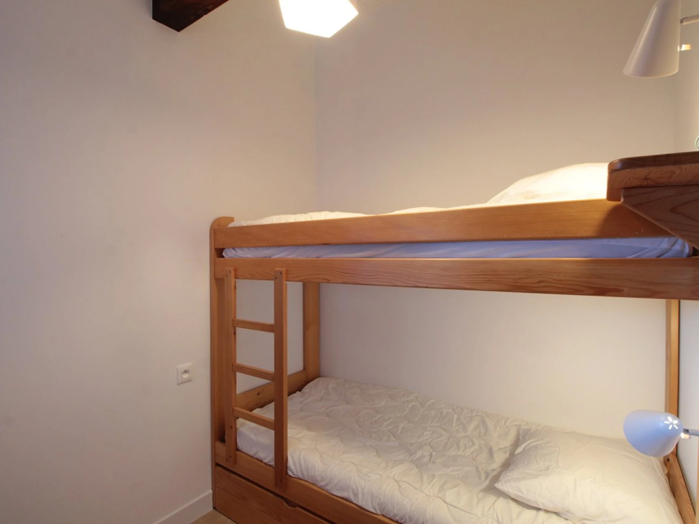 The bedroom includes bunk beds (please note the top bunk is not suitable for children under 6). Upstairs, the mezzanine features a comfortable double bed (160 x 200 cm).