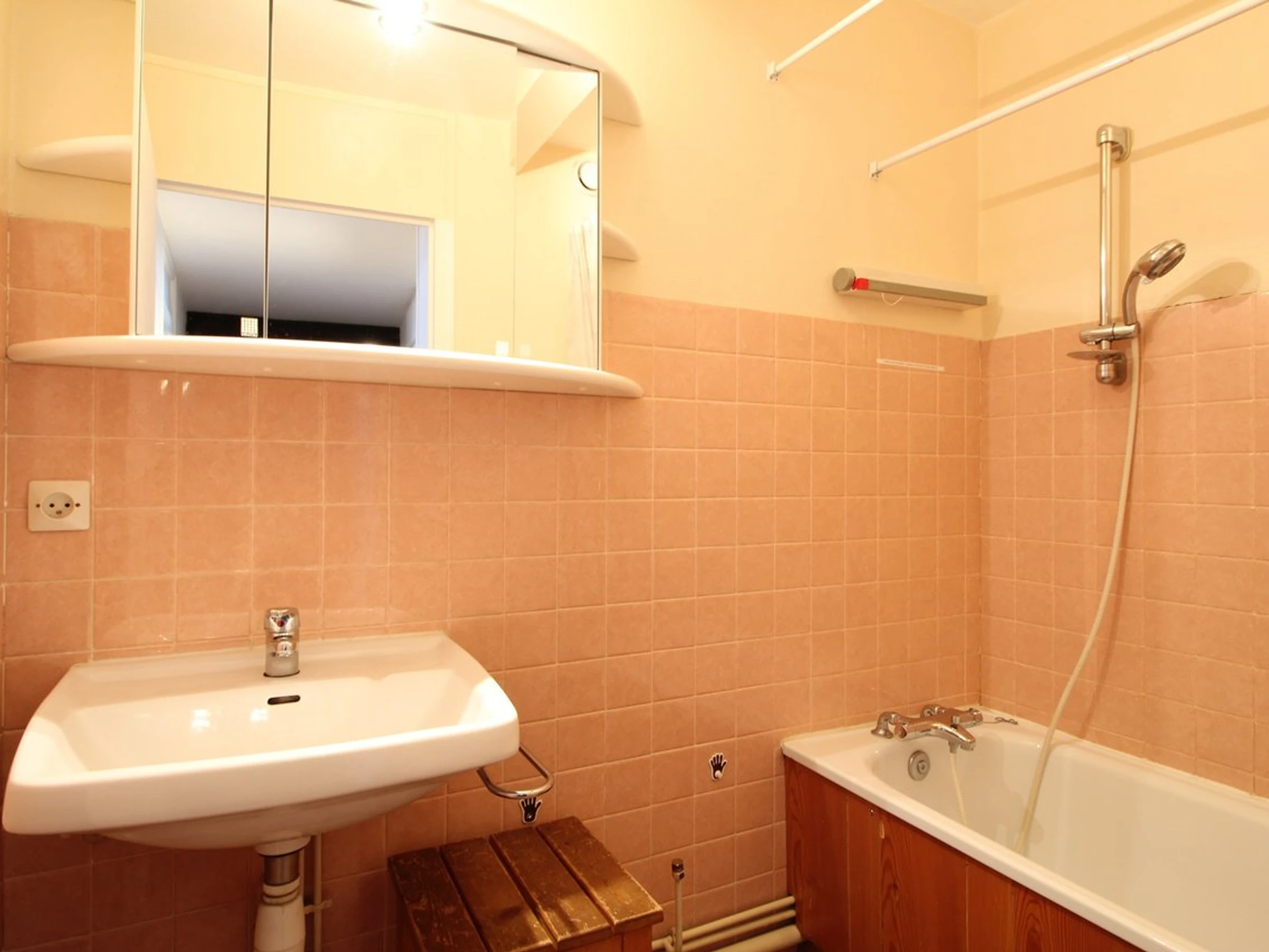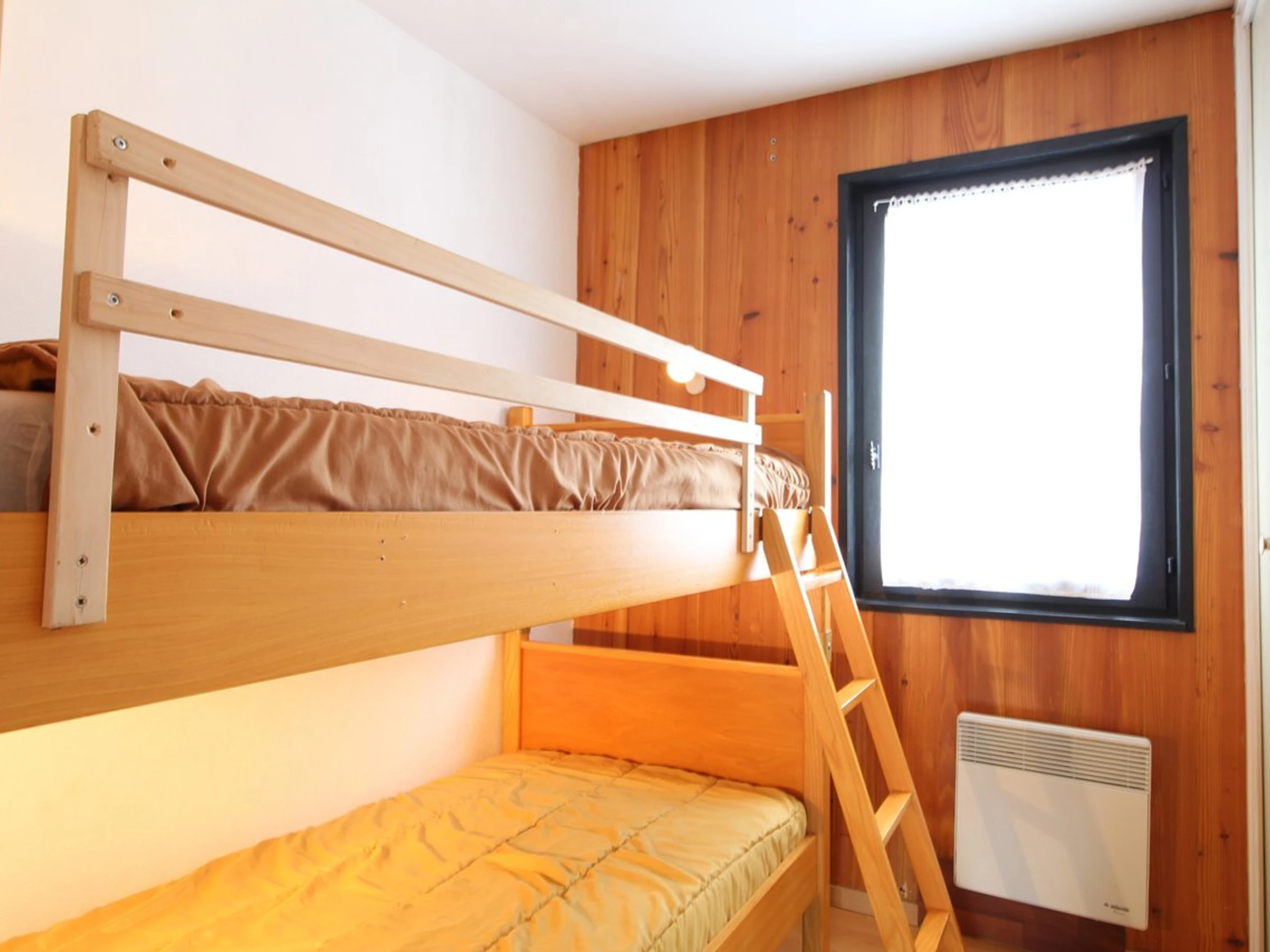 The apartment includes one bedroom with a double bed, another with bunk beds (upper bed not suitable for children under 6), and a living room with a sofa bed for two. The bathroom includes a bathtub, and the toilet is separate.