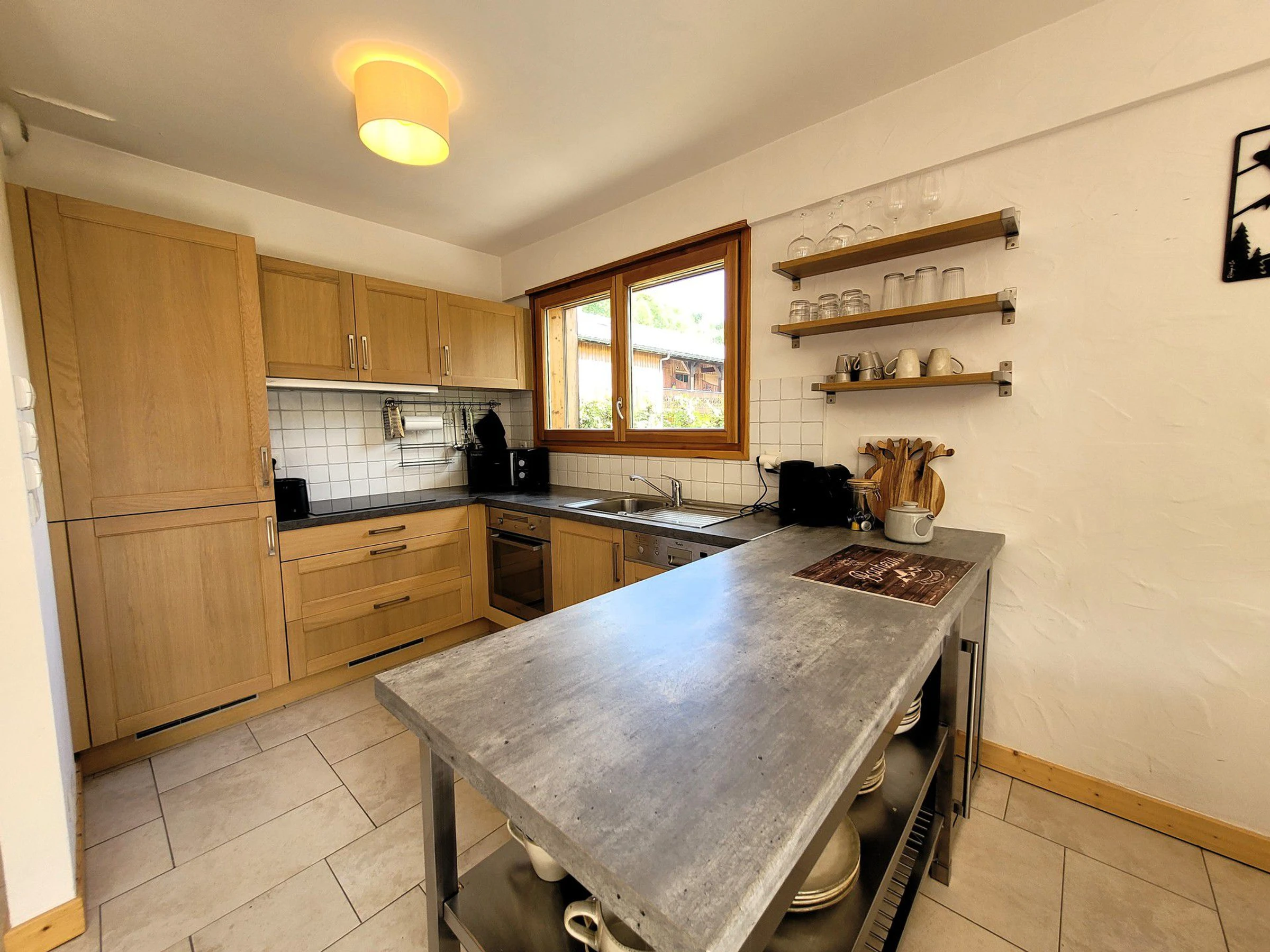 Built-in oven, 3-zone induction hob, built-in dishwasher, fridge with freezer compartment, kettle, toaster, microwave, Wifi, Barbecue