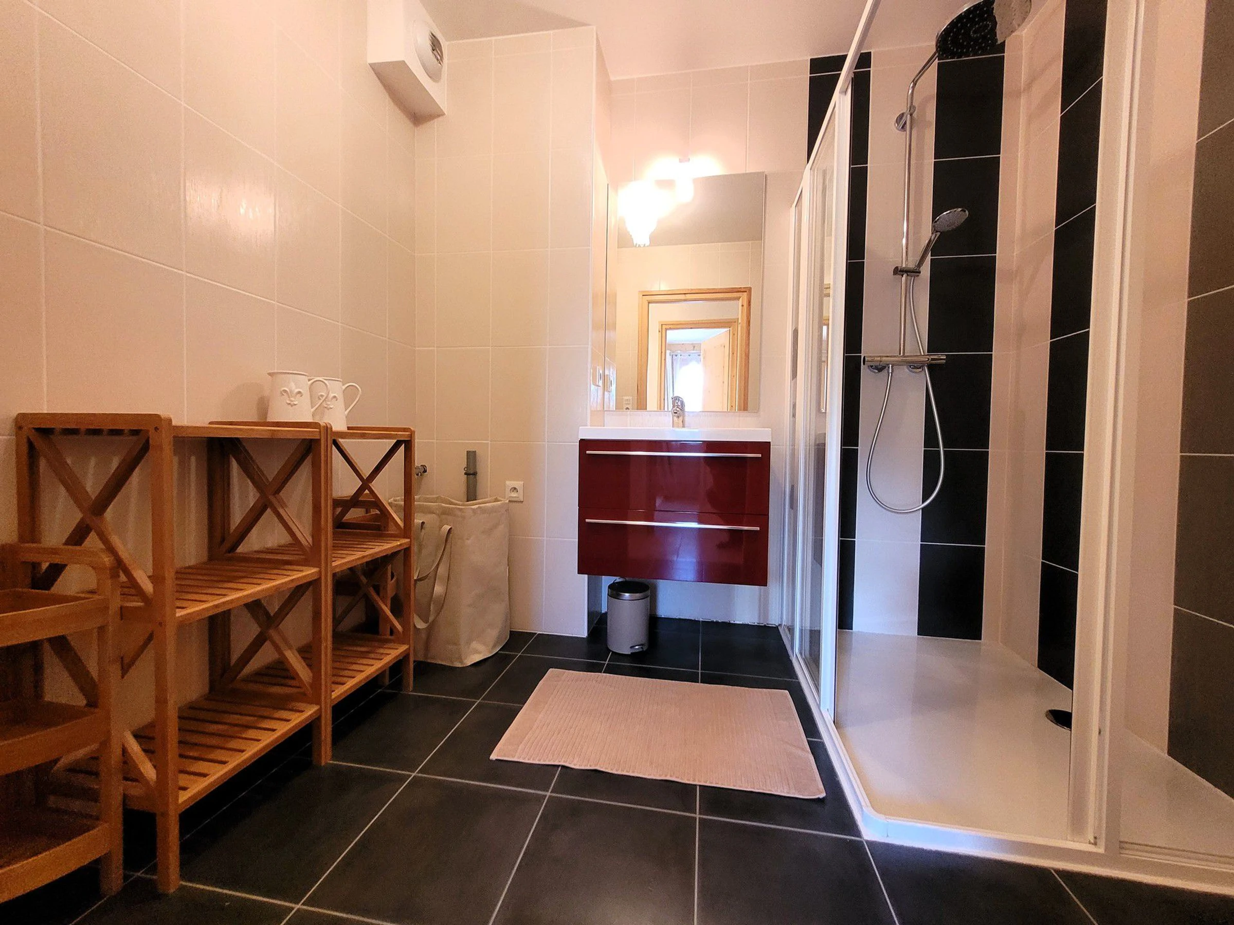 - bathroom comprising walk-in shower, basin, and towel rail