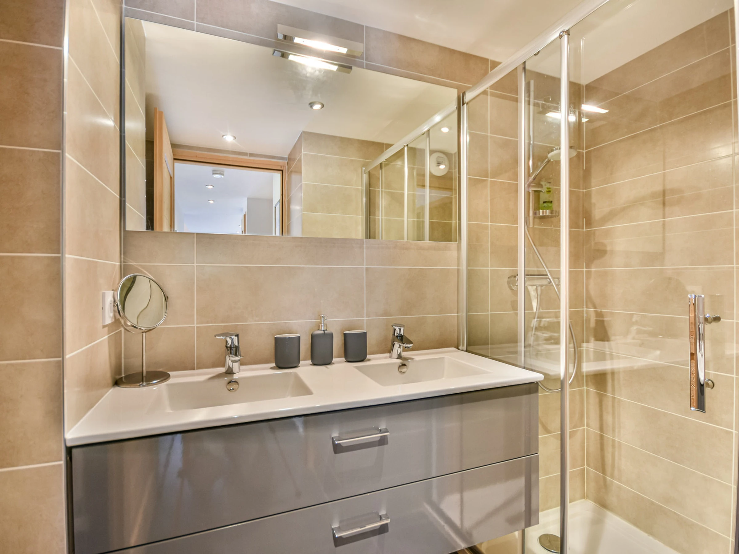 ▪ Bathroom (3.27m²) with shower, double sink, mirror, storage, and toilet