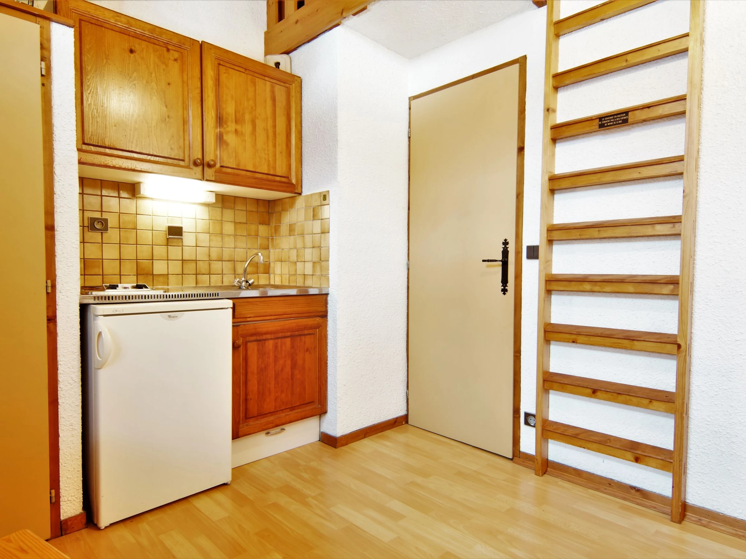 1-room studio 19 m2 on 2 levels on 2nd floor, south-west facing position. Simple furnishings: living/dining room with 1 sofabed (140 cm, length 190 cm), TV. Small, open kitchen (2 hot plates, microwave). Shower/WC. Electric heating. Partial view of the mountains. Facilities: Internet (WiFi, extra). Parking space n 21. Please note: non-smokers only. TV only FR. Smoke alarm. [hidden]