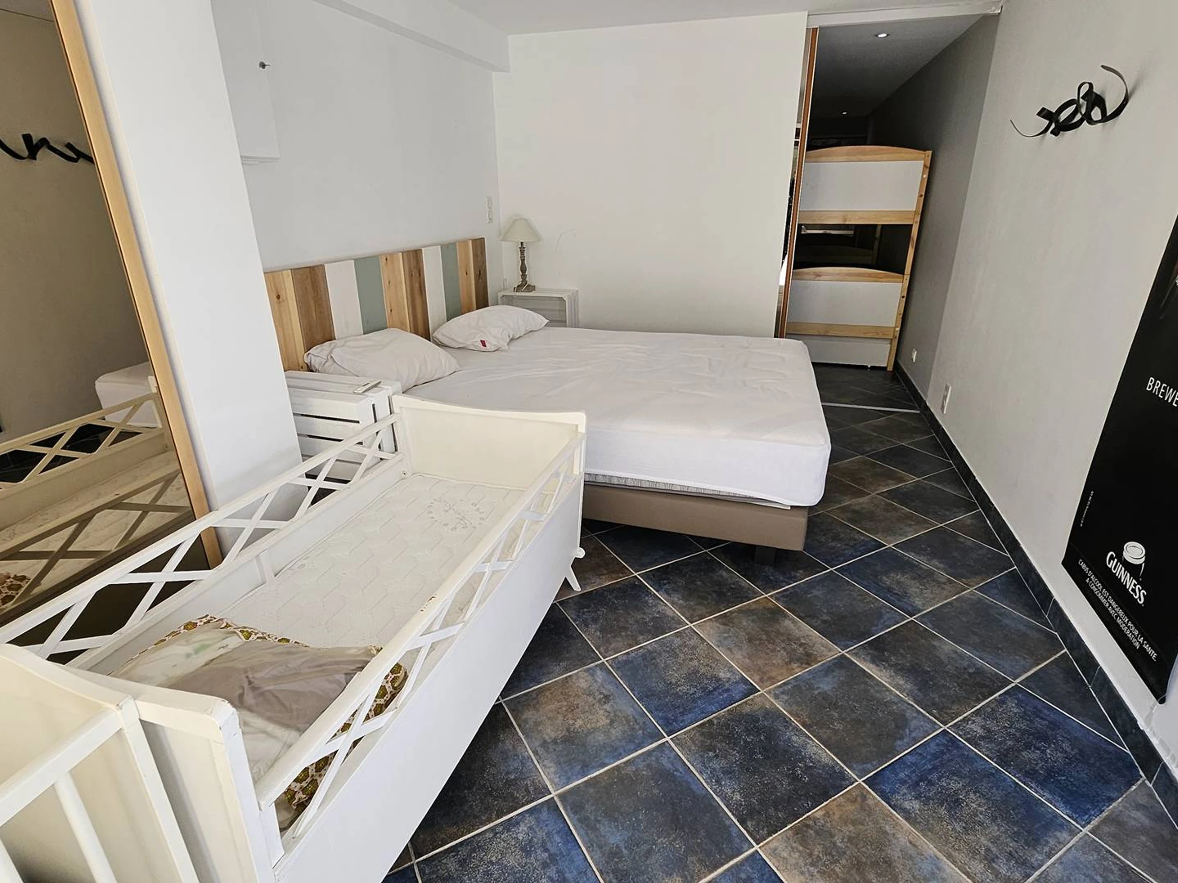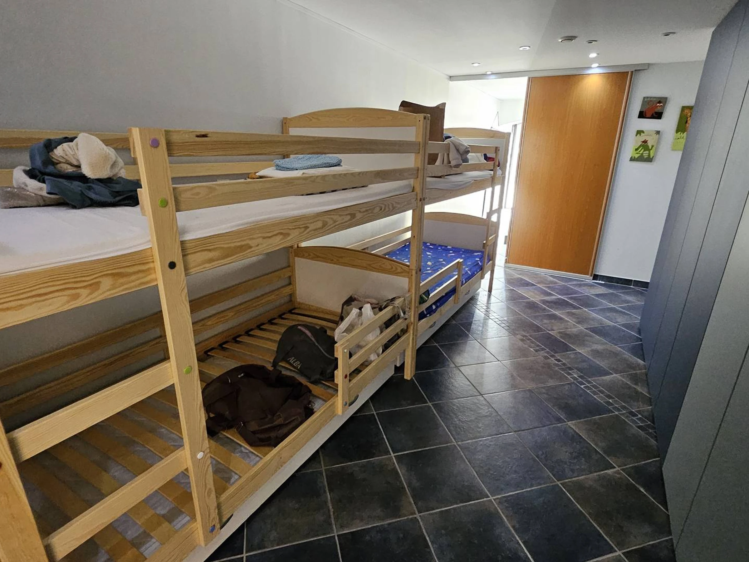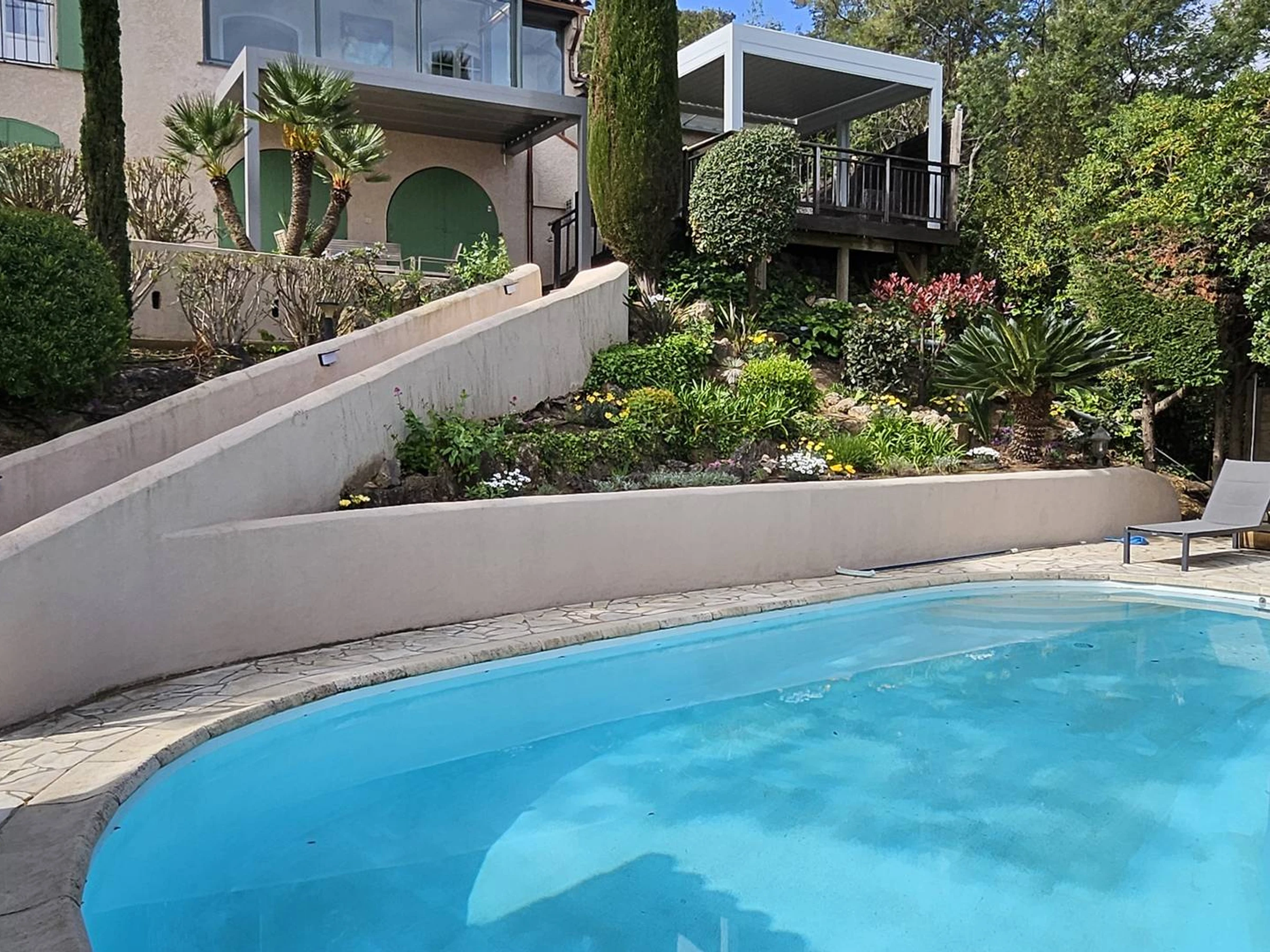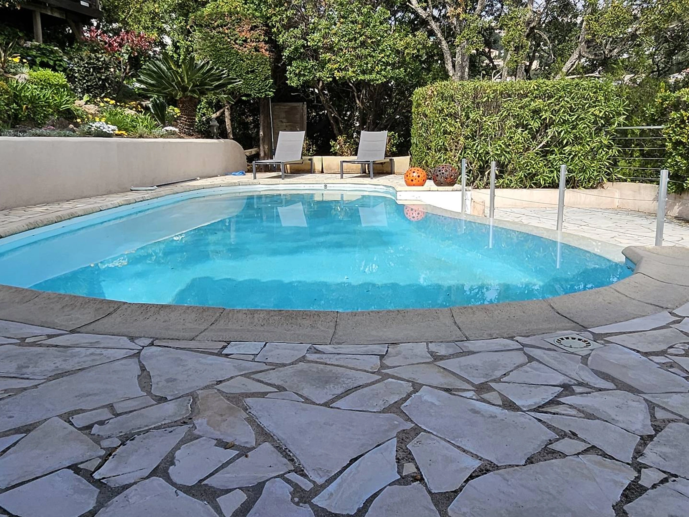 2 bedrooms equipped with a 160 bed, 1 bedroom with a 160 sofa bed, shower rooms, toilets, on the lower level a children's dormitory with 2 x 3 bunk beds of 80, bathroom with whirlpool bath, and bedroom 4 with a 160 bed. (linen rental on request). Presence of 2 baby beds. Descent from the terraces to the pool with 8 x 4 water line protected by a gate, pool house, electric plancha. Located 1 km from the seaside, you can get there on foot. Well fenced Mediterranean garden. Air conditioning in all main rooms, and parking by electric gate for 3 cars inside.