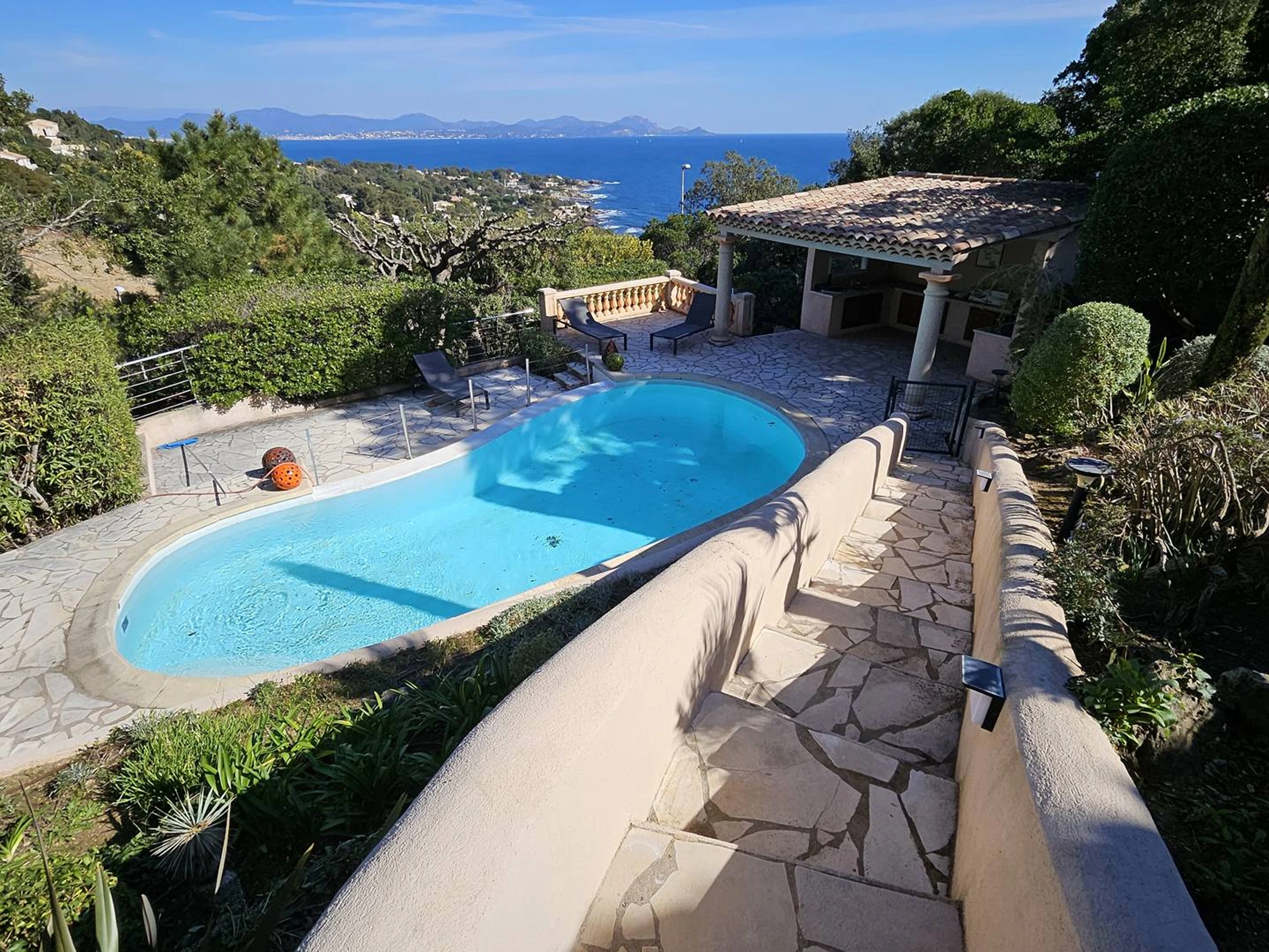 Les Issambres, Côte d'Azur, Bay of St Tropez: Very large and comfortable master villa with 260 m². Composed on level 0 of an entrance, large living room, dining room opening onto a veranda with a beautiful sea view of the bay of St Raphaël, independent office with table football, very well-equipped kitchen (service entrance).