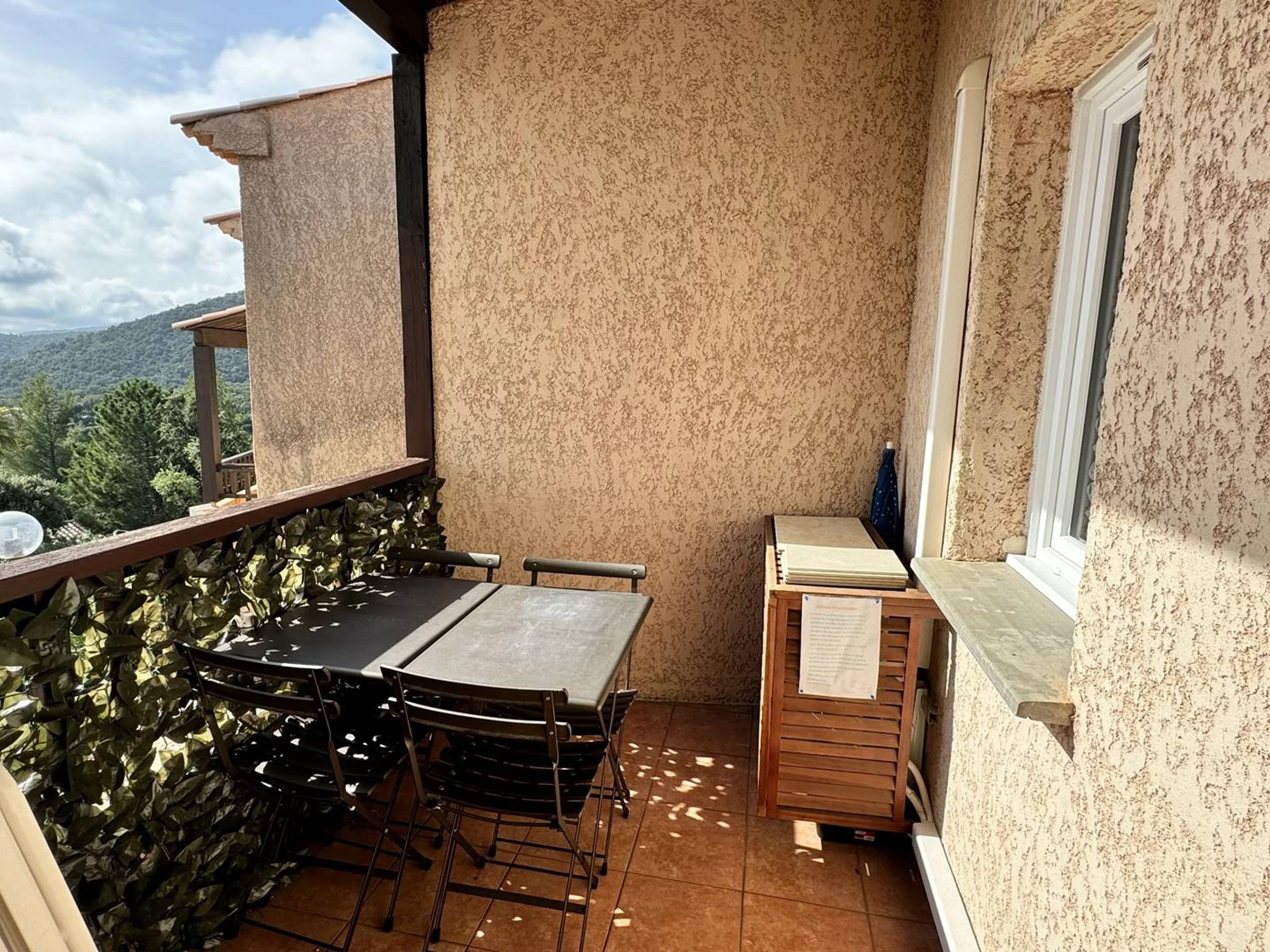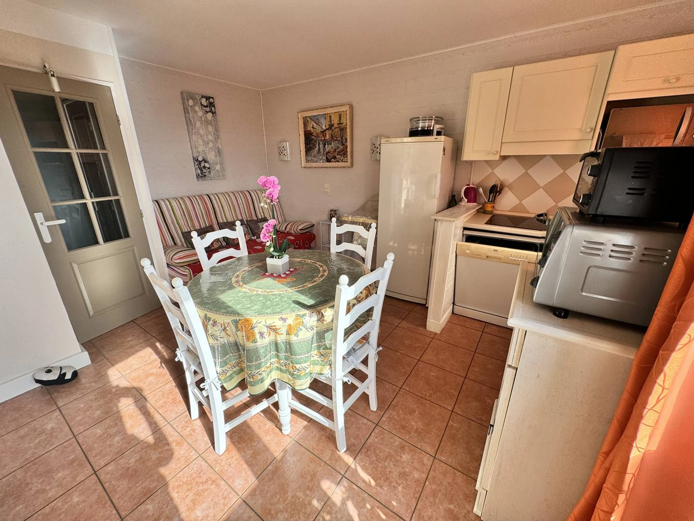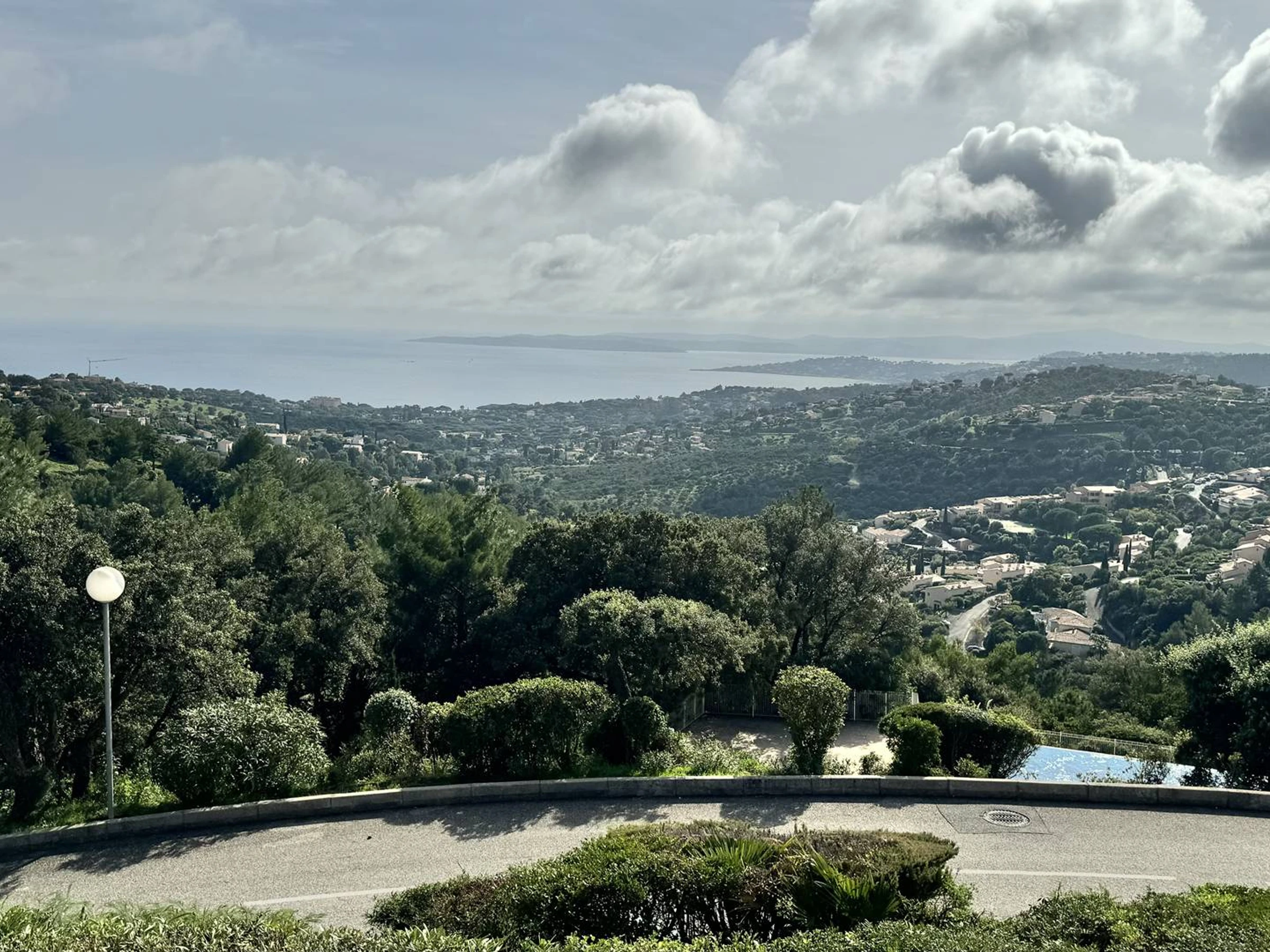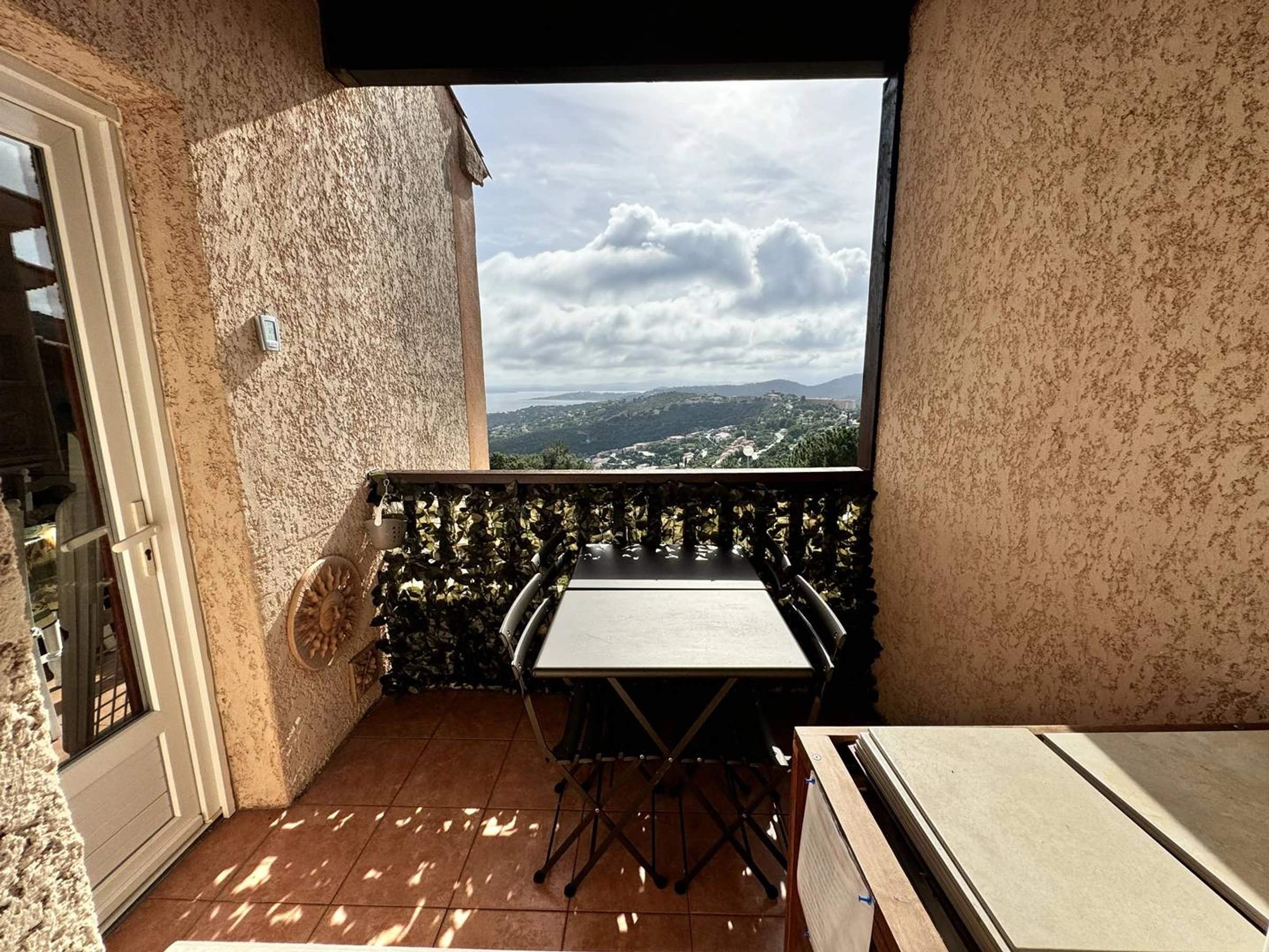 Enjoy panoramic views of the Bay of St. Tropez in this fully equipped apartment, perfect for your holiday. It comprises an entrance hall with two 80cm bunk beds, a shower room, a separate toilet, a master bedroom with air conditioning and a 140cm bed, and a living room with a kitchenette and a 140cm sofa bed. (Linen rental available on request.) Amenities include a dishwasher, washing machine, mini-oven, microwave, electric hob, large refrigerator with ice compartment, air conditioning in the living room, and a small terrace overlooking the bay. The beach and village with its shops are 3km away. There is communal parking within a gated community. The complex also features a very large swimming pool, a pétanque court, and tennis courts. Well-behaved pets are welcome on request.