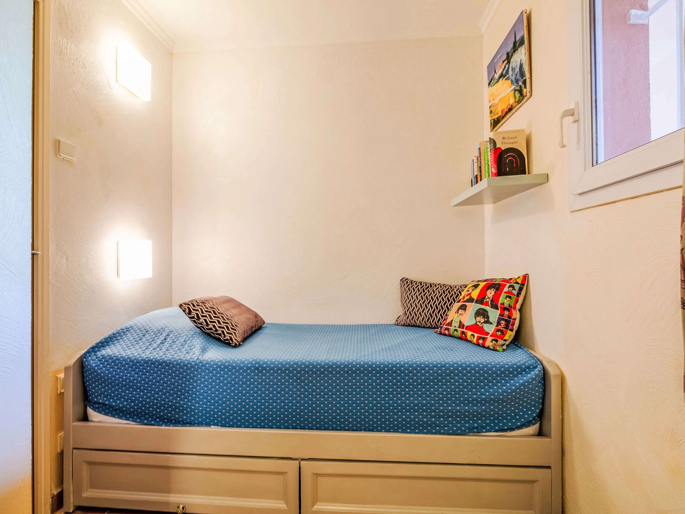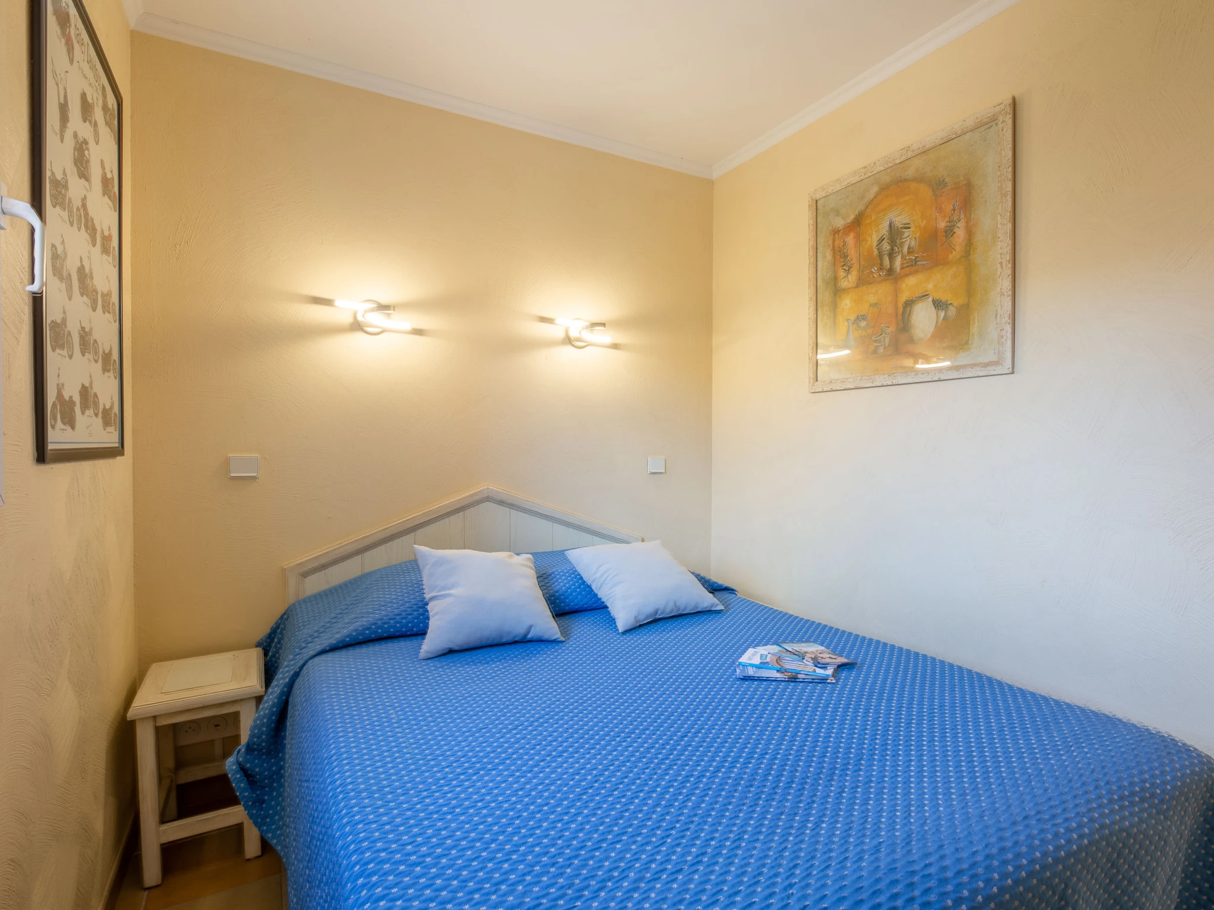 3-room apartment 45 m2 on 2nd floor. Simple and practical furnishings: living/dining room with 1 double sofabed (1 x 140 cm, length 190 cm), TV. Exit to the terrace. 1 room with 1 french bed (140 cm, length 190 cm). Sleeping alcove with 1 bed (80 cm, length 190 cm). Kitchenette (4 hot plates, dishwasher, toaster, kettle, microwave, electric coffee machine). Bathroom, shower/WC. Electric heating. Terrace 10 m2, roofed, south facing position. Balcony furniture. Very beautiful view of the sea. Facilities: Internet (WiFi, extra). Parking space n 344. Please note: non-smokers only. Maximum 1 small pet/ dog allowed. Smoke alarm. [hidden]