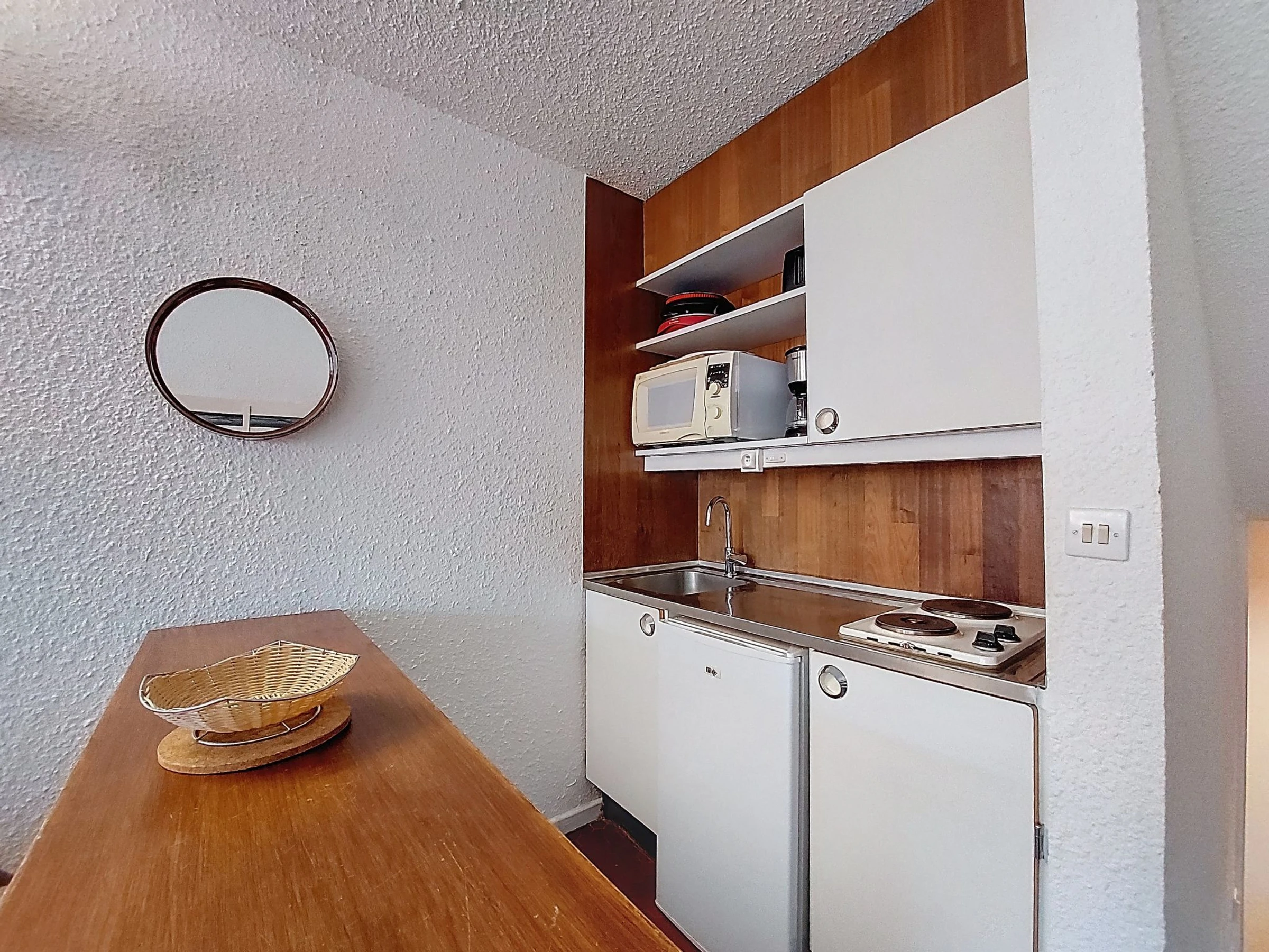 "Brelin Evons R05", 1-room studio 23 m2 on 2 levels, on the upper ground floor. Comfortable and beautiful furnishings: entrance hall. Shower, sep. WC. Electric heating. Upper floor: living/dining room with 1 double sofabed (140 cm, length 200 cm), 1 x 2 bunk beds (80 cm, length 190 cm), TV (flat screen). Exit to the balcony, south-west facing position. Kitchenette (2 hot plates, toaster, kettle, microwave, electric coffee machine, raclette grill). Very beautiful view of the mountains and the ski run. Facilities: Internet (WiFi, extra). Please note: smoke alarm. [hidden]
