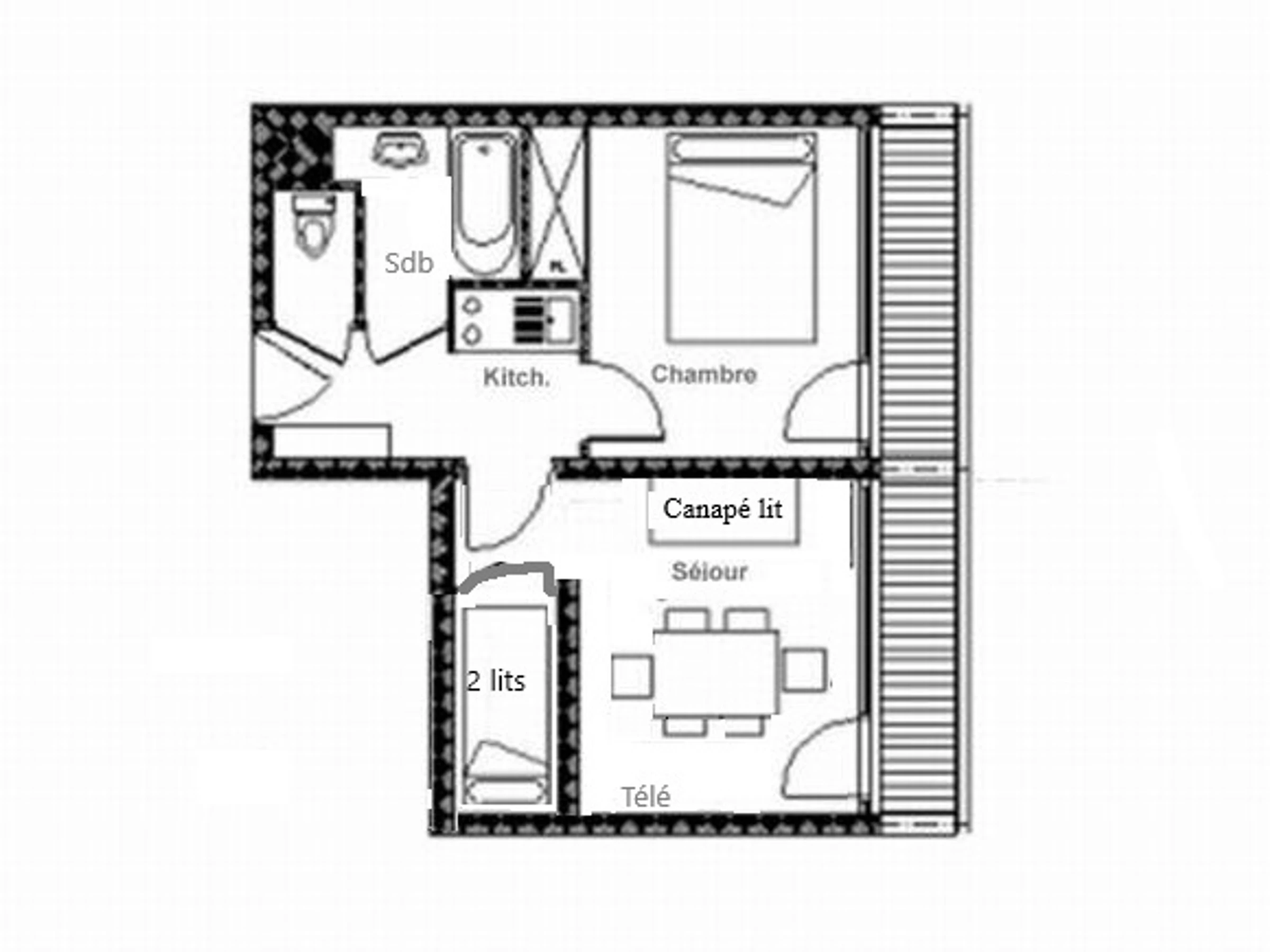 Living room : 2 bunk beds + 1 simple bed. Flat screen TV.