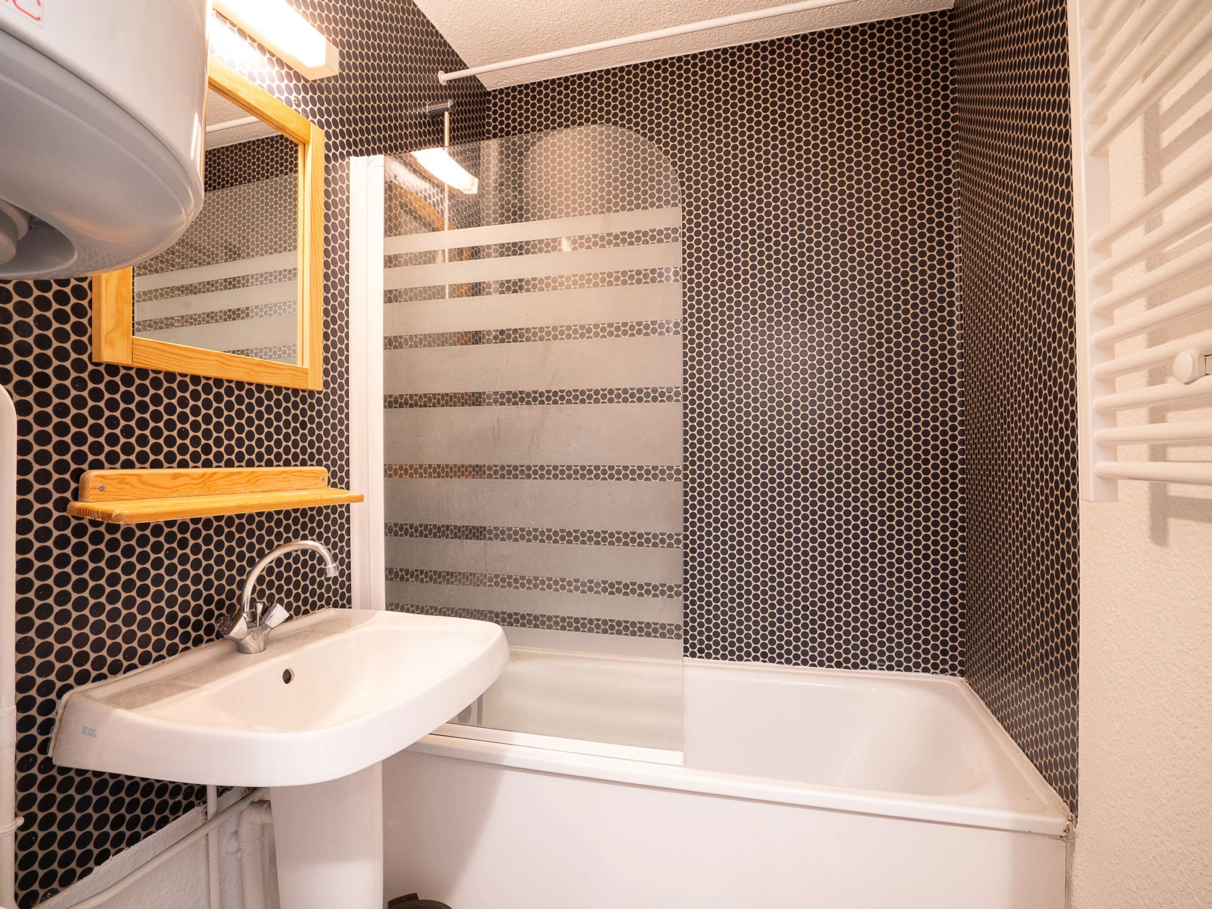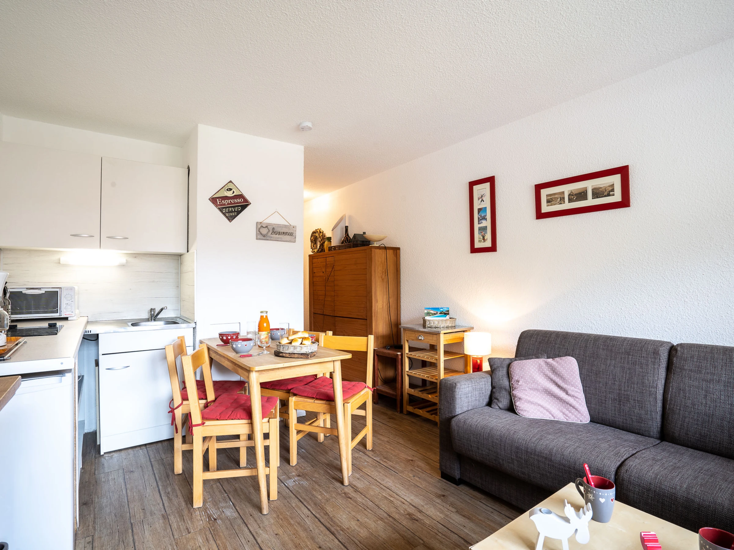"Asters 318 Bâtiment A1", 1-room apartment 24 m2 on 2nd floor. Comfortable and beautiful furnishings: living/dining room with 1 double sofabed (140 cm, length 190 cm), TV (flat screen). Exit to the balcony. Sleeping alcove with 1 x 2 bunk beds (70 cm, length 190 cm). Kitchenette (mini-oven, 2 ceramic glass hob hotplates, kettle, microwave, electric coffee machine, raclette grill). Bath/WC. Electric heating. Balcony, south facing position. Facilities: Internet (WiFi, extra). Please note: maximum 1 pet/ dog allowed. Smoke alarm. Instead of an enclosed bedroom, some sleeping areas are located in an open-plan area (gallery, alcove, etc.). [hidden]