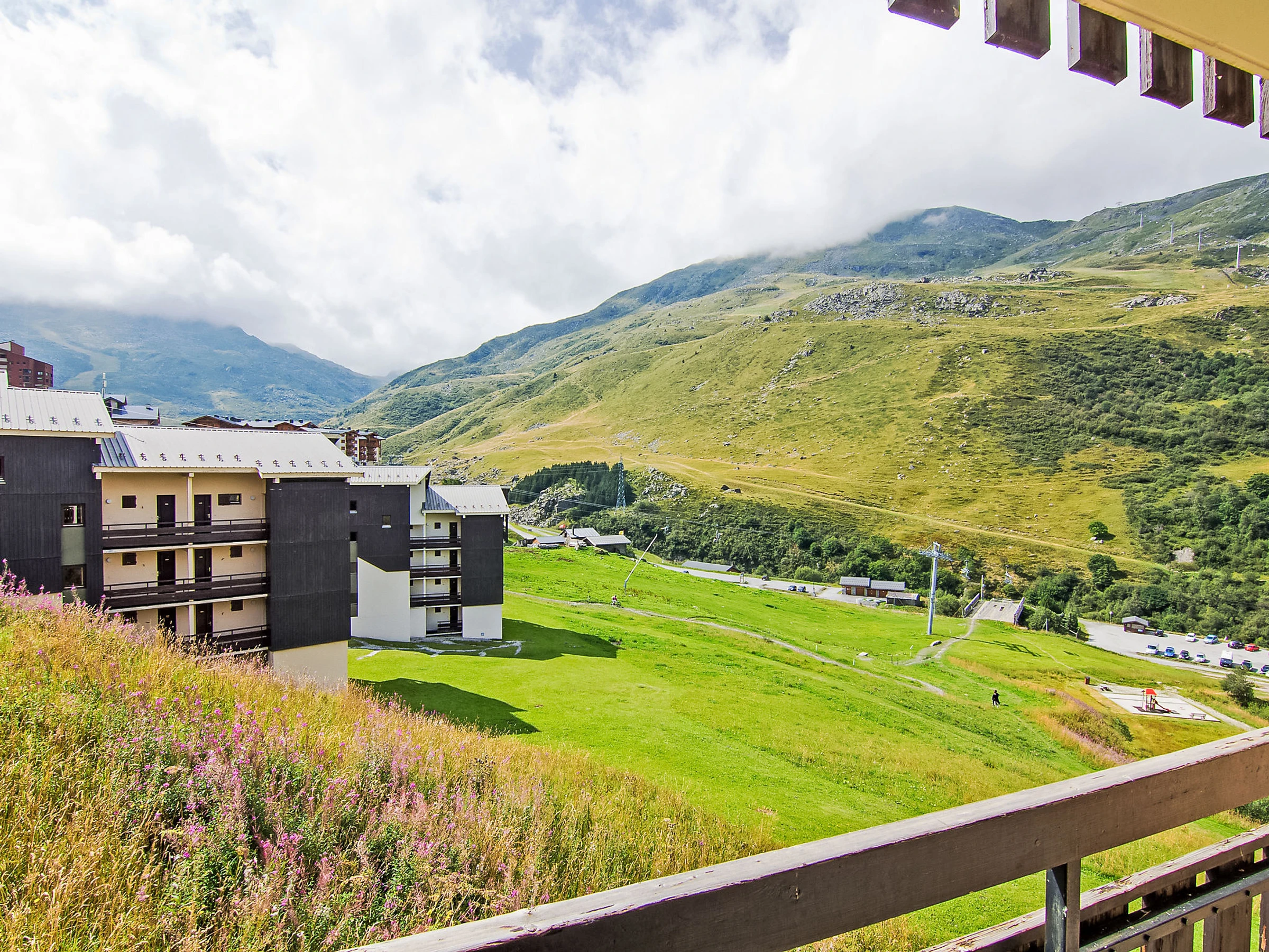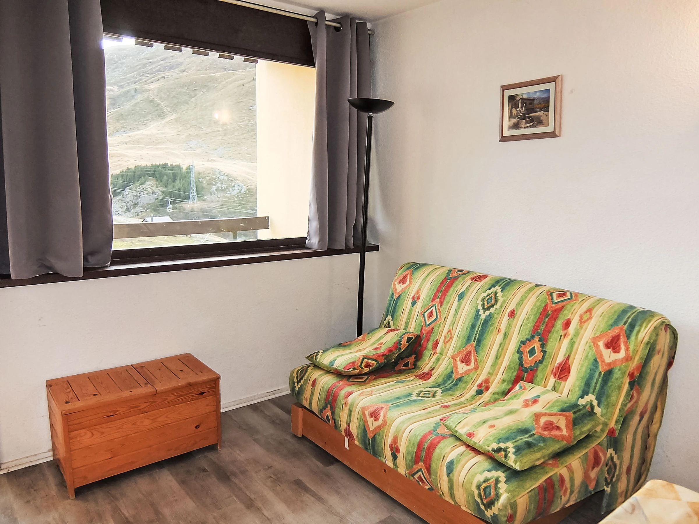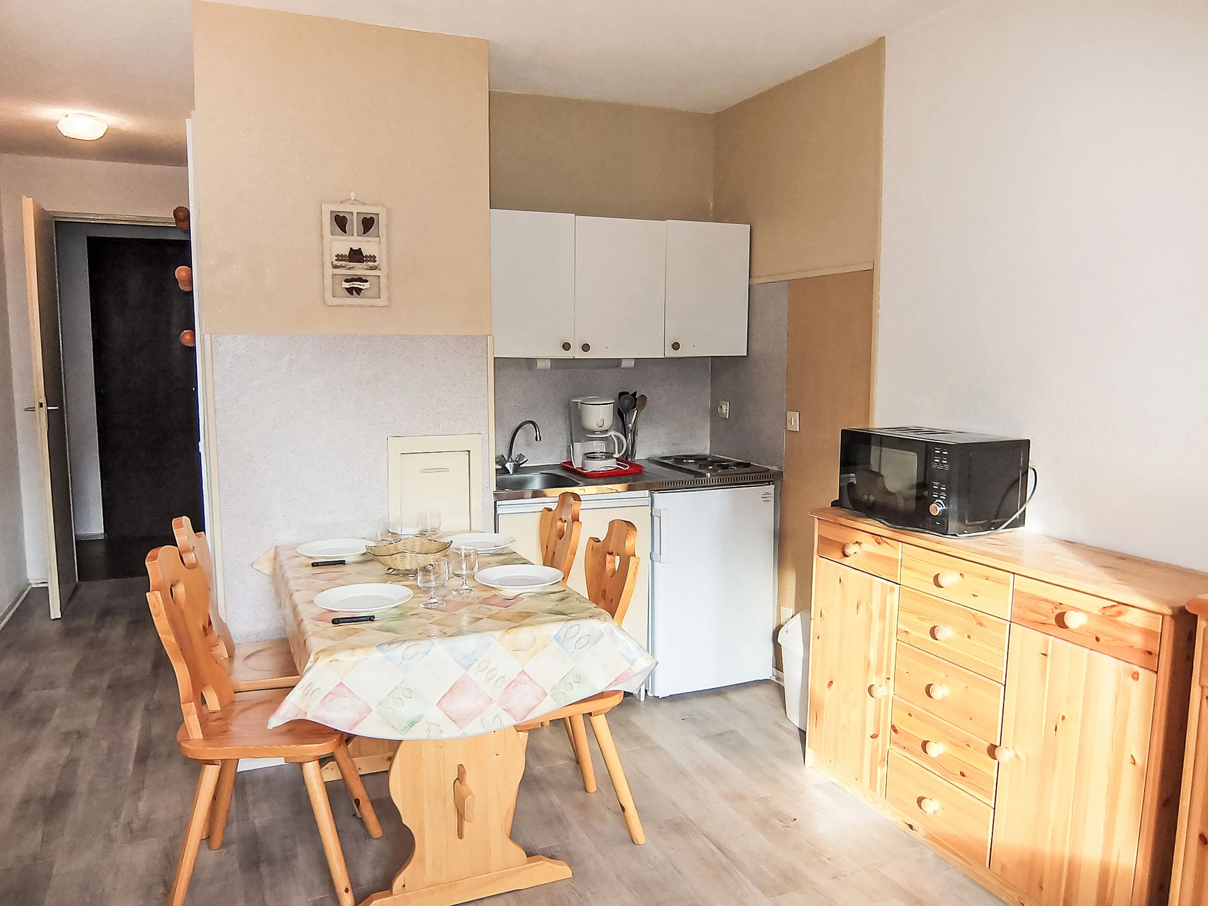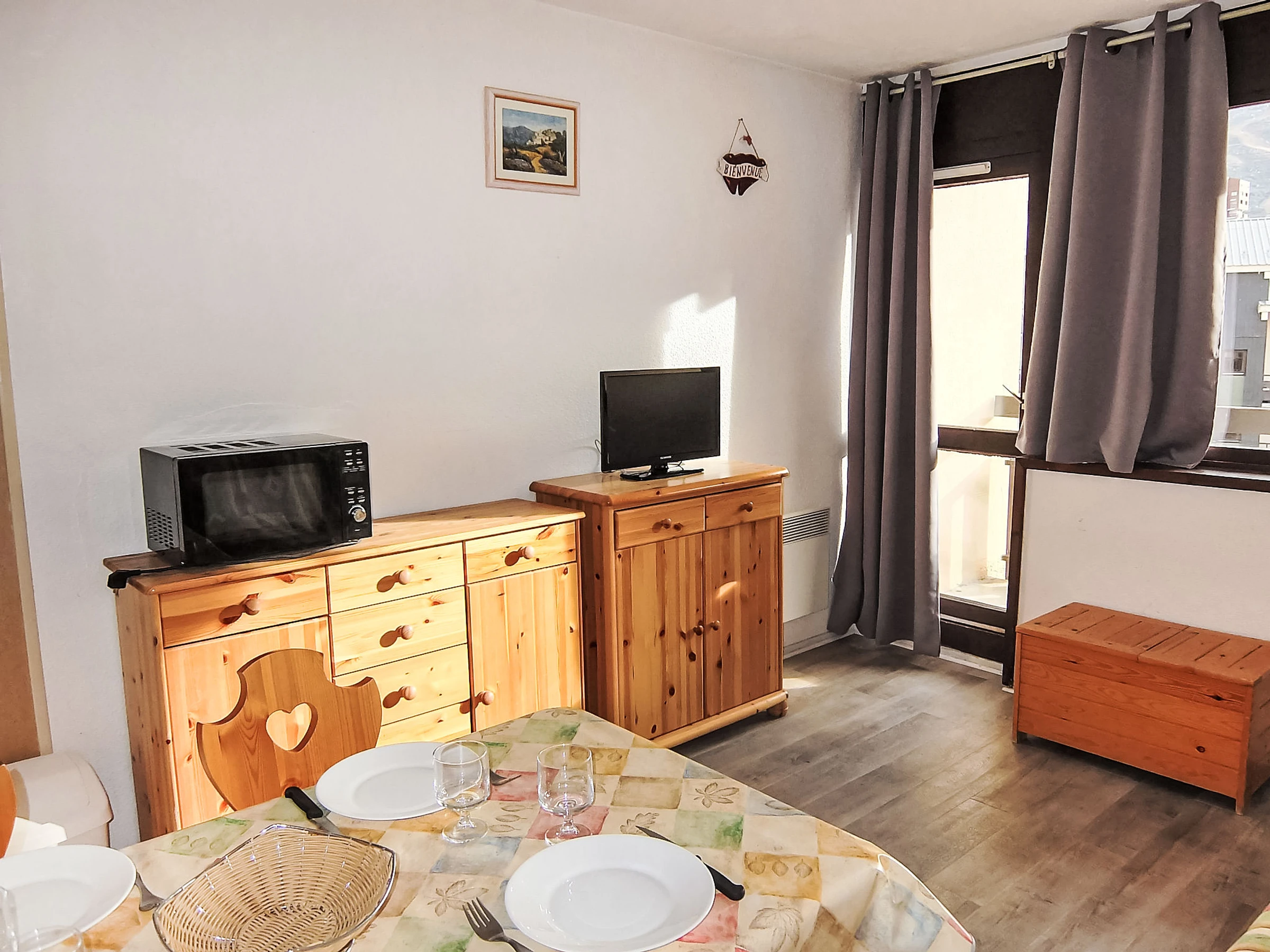 "Asters 804 Bâtiment C5", 1-room apartment 24 m2 on 3rd floor. Living/dining room with 1 double sofabed (160 cm, length 190 cm), TV (flat screen). Sleeping alcove with 1 x 2 bunk beds (70 cm, length 190 cm). Kitchenette (2 hot plates, kettle, microwave, electric coffee machine). Bath/WC. Electric heating. Balcony, south facing position. Facilities: Internet (WiFi, extra). Please note: maximum 1 pet/ dog allowed. Smoke alarm. Building C5. Apartment is on entrance level. Instead of an enclosed bedroom, some sleeping areas are located in an open-plan area (gallery, alcove, etc.). [hidden]